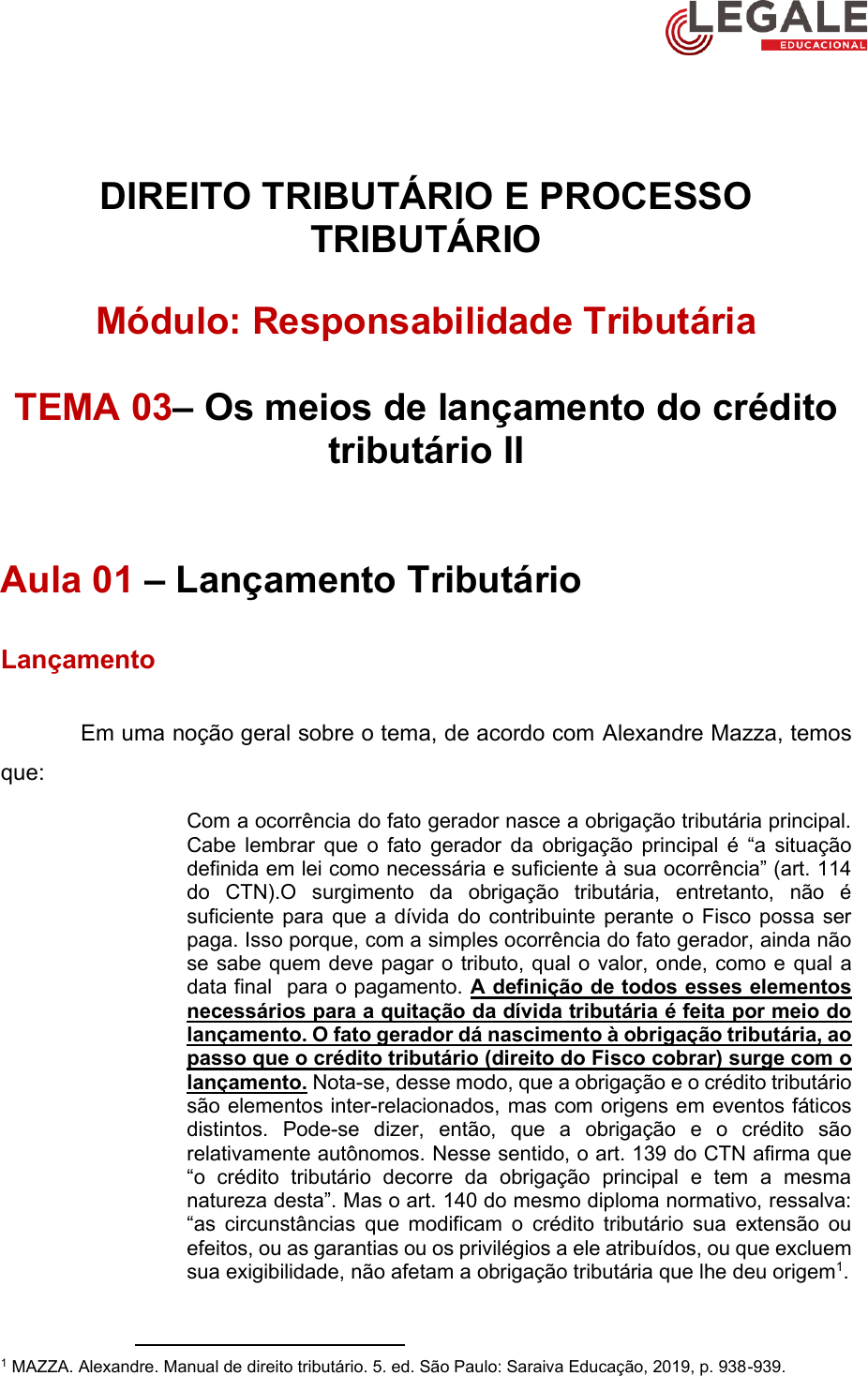 DIREITO TRIBUTÁRIO E PROCESSO TRIBUTÁRIO Módulo: Responsabilidade Tributária TEMA 03– Os meios de lançamento do crédito tributário II Aula 01 – Lançamento Tributário Lançamento Em uma noção geral sobre o tema, de acordo com Alexandre Mazza, temos que: Com a ocorrência do fato gerador nasce a obrigação tributária principal. Cabe lembrar que o fato gerador da obrigação principal é “a situação definida em lei como necessária e suficiente à sua ocorrência” (art. 114 do CTN).O surgimento da obrigação tributária, entretanto, não é suficiente para que a dívida do contribuinte perante o Fisco possa ser paga. Isso porque, com a simples ocorrência do fato gerador, ainda não se sabe quem deve pagar o tributo, qual o valor, onde, como e qual a data final para o pagamento. A definição de todos esses elementos necessários para a quitação da dívida tributária é feita por meio do lançamento. O fato gerador dá nascimento à obrigação tributária, ao passo que o crédito tributário (direito do Fisco cobrar) surge com o lançamento. Nota-se, desse modo, que a obrigação e o crédito tributário são elementos inter-relacionados, mas com origens em eventos fáticos distintos. Pode-se dizer, então, que a obrigação e o crédito são relativamente autônomos. Nesse sentido, o art. 139 do CTN afirma que “o crédito tributário decorre da obrigação principal e tem a mesma natureza desta”. Mas o art. 140 do mesmo diploma normativo, ressalva: “as circunstâncias que modificam o crédito tributário sua extensão ou efeitos, ou as garantias ou os privilégios a ele atribuídos, ou que excluem sua exigibilidade, não afetam a obrigação tributária que lhe deu origem1. 1 MAZZA. Alexandre. Manual de direito tributário. 5. ed. São Paulo: Saraiva Educação, 2019, p. 938-939. KELVIN CARLOS JONASSON - 06536528956 Alexandre Mazza trata os elementos do art. 142 do CTN como as 6 (seis) finalidades do lançamento, trazidas legalmente. De acordo com o autor: Com base no que dispõe o art. 142 do CTN, podem ser identificadas seis finalidades do lançamento tributário: 1) constituir o crédito tributário; 2) verificar a ocorrência do fato gerador; 3) determinar a matéria tributável; 4) calcular o montante do tributo devido; 5) identificar o sujeito passivo; 6) propor a aplicação da penalidade cabível.2 Procedimento Administrativo Vinculado A obrigação tributária é muito importante para que a gente possa entender e recordar alguns pontos que vocês já estudaram nesta pós-graduação. Segundo o CTN, o LANÇAMENTO é entendido por um PROCEDIMENTO ADMINISTRATIVO, sendo um CONJUNTO DE ATOS ADMINISTRATIVOS encadeados entre si para formação de um ato válido. Nos termos do art. 142 do CTN: “Compete privativamente à AUTORIDADE ADMINISTRATIVA constituir o crédito tributário pelo LANÇAMENTO, assim entendido o procedimento administrativo tendente a verificar a ocorrência do fato gerador da obrigação correspondente, determinar a matéria tributável, calcular o montante do tributo devido, identificar o sujeito passivo e, sendo caso, propor a aplicação da penalidade cabível”. Para boa parte da doutrina, entretanto, o LANÇAMENTO seria considerado um ATO ADMINISTRATIVO e não um procedimento administrativo, como descrito no artigo. Na explicação de Hugo de Brito Machado: 2 MAZZA. Alexandre. Manual de direito tributário. 5. ed. São Paulo: Saraiva Educação, 2019, p. 941. KELVIN CARLOS JONASSON - 06536528956 É também controvertido saber se o lançamento é um ato ou um procedimento. Na verdade, porém, a palavra lançamento tanto pode ser usada em um sentido, como em outro, sem que com isso se esteja incorrendo em erro. Pode-se chamar de lançamento a série de atos através dos quais a autoridade afere a ocorrência do fato gerador, quantifica o montante tributável, identifica o contribuinte etc. Nesse caso, a palavra é usada para designar um procedimento. Entretanto, esse procedimento pode concluir pela inexistência de tributo a ser quantificado. Pode acontecer, também, de a decadência se consumar antes de finalizado o procedimento, e, nesse caso, o tributo não poderá mais ser validamente lançado. Daí por que alguns autores afirmam que esse procedimento preparatório, a rigor, não é ainda o lançamento, expressão que reservam para o ato praticado em sua conclusão, no qual efetivamente se declara a ocorrência do fato gerador da obrigação correspondente, se determina a matéria tributável, se calcula o montante do tributo devido, se identifica o sujeito passivo e se aplica a penalidade cabível, se for o caso.3 Ademais, tal procedimento é VINCULADO (pois ele está ligado à legislação), isto é, a AUTORIDADE ADMINISTRATIVA não exerce discricionariedade no ATO DE LANÇAMENTO, devendo OBSERVAR SEUS REQUISITOS, sob pena de nulidade. Neste sentido, a jurisprudência: TRIBUTÁRIO. ISS. LANÇAMENTO DE OFÍCIO GENÉRICO. AUSÊNCIA DE ESPECIFICAÇÃO QUANTO AO FATO GERADOR. NULIDADE. ACÓRDÃO PARADIGMA VERSA SOBRE AUTOLANÇAMENTO. AUSÊNCIA DE SIMILITUDE FÁTICA. RECURSO NÃO CONHECIDO. 1. No Direito Tributário vige a regra da tipicidade fechada quanto à identificação do fato imponível. 2. Lançamento tributário que não especifica qual dos serviços constantes da lista tributada pelo ISS foi realizado pelo contribuinte é nulo, gerando, por consequências, a nulidade da inscrição em dívida ativa correspondente e extinção da execução fiscal que venha a ser ajuizada. 3. Identificar se a forma genérica pela qual foi realizada o lançamento ocasionou, ou não, dificuldade concreta no exercício de defesa do contribuinte é circunstância impossível de ser avaliada em sede de recurso especial, por implicar reexame de provas (Súmula 7/STJ). Em tese, o lançamento efetuado dessa maneira impossibilita o pleno exercício de defesa por parte do sujeito passivo tributário. (STJ, 2ªT., REsp 602.228/SC) 3 MACHADO. Hugo 