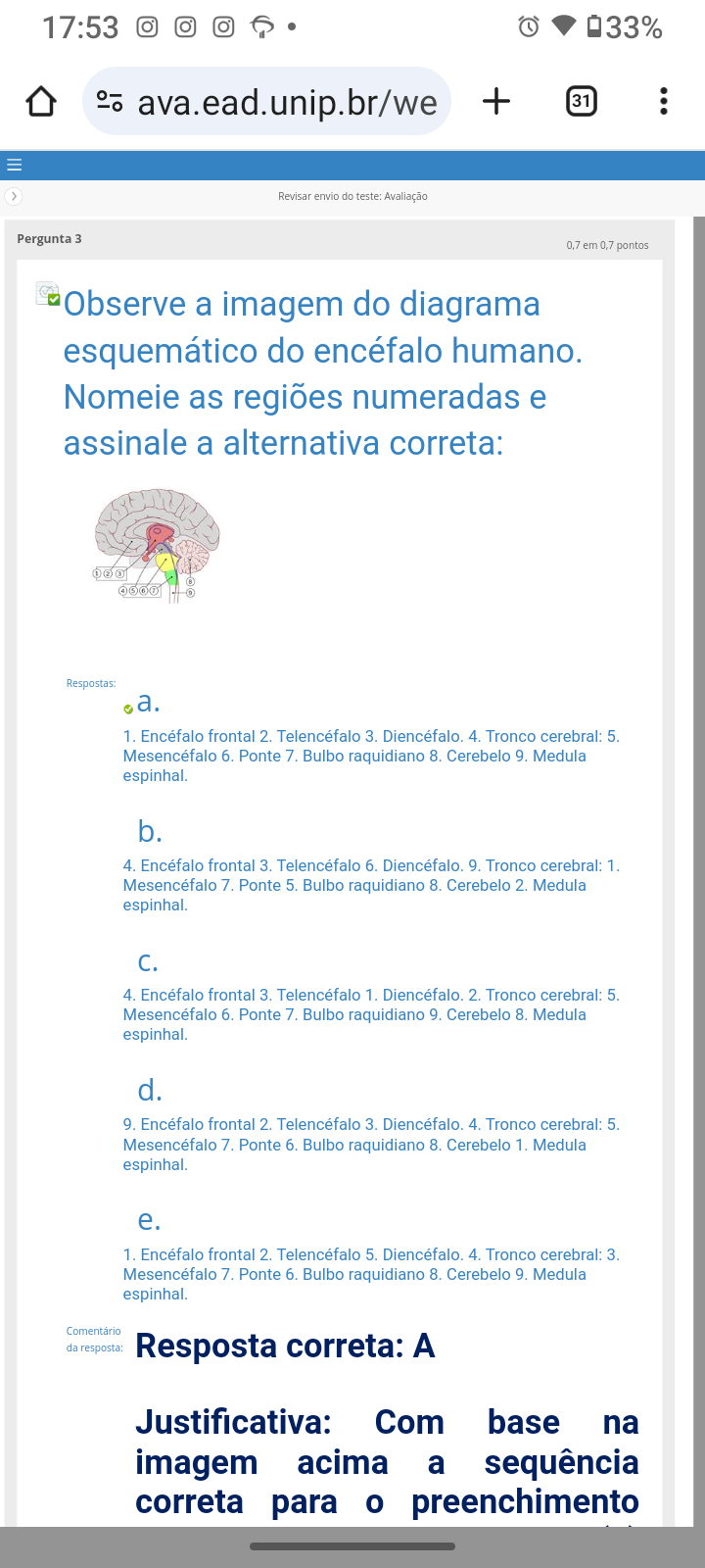 17:53 33% ava.ead.unip.br/we + 31 = > Revisar envio do teste: Avaliação Pergunta 3 0.7 em 0.7 pontos Observe a imagem do diagrama esquemático do encéfalo humano. Nomeie as regiões numeradas e assinale a alternativa correta: Respostas a. 1. Encéfalo frontal 2. Telencéfalo 3. 4. Tronco 5. Mesencéfalo 6. Ponte 7. Bulbo raquidiano 8. Cerebelo 9. Medula espinhal. b. 4. Encéfalo frontal 3. Telencéfalo 6. 9. Tronco cerebral: 1. Mesencéfalo 7. Ponte 5. Bulbo raquidiano 8. Cerebelo 2. Medula espinhal. C. 4. Encéfalo frontal 3. Telencéfalo 1. 2. Tronco cerebral: 5. Mesencéfalo 6. Ponte 7. Bulbo raquidiano 9. Cerebelo 8. Medula espinhal. d. 9. Encéfalo frontal 2. Telencéfalo 3. 4. Tronco cerebral: 5. Mesencéfalo 7. Ponte 6. Bulbo raquidiano 8. Cerebelo 1. Medula espinhal. e. 1. Encéfalo frontal 2. Telencéfalo 5. 4. Tronco cerebral: 3. Mesencéfalo 7. Ponte 6. Bulbo raquidiano 8. Cerebelo 9. Medula espinhal. Comentário da Resposta correta: A Justificativa: Com base na imagem acima a sequência correta para o preenchimento