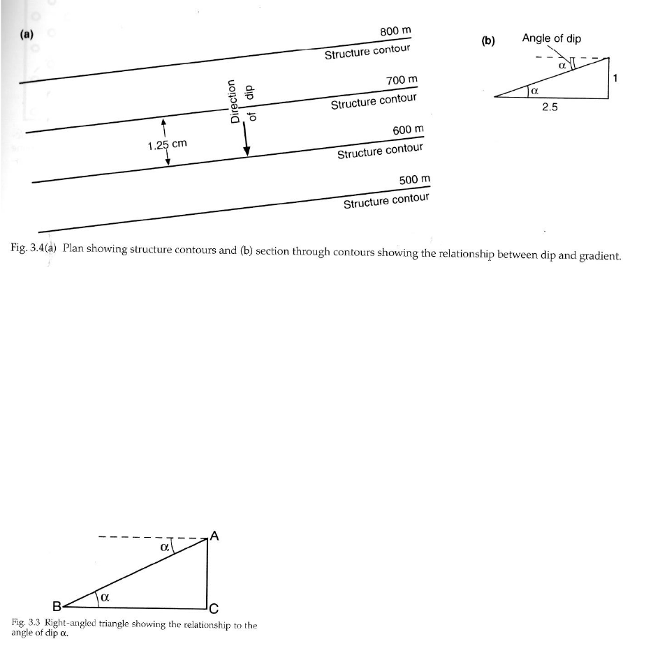 Mapa 4 – Instruções CONSTRUÇÃO DE LINHAS DE CONTORNO ESTRUTURAL A cota de um contato geológico pode ser encontrada onde o mesmo intercepta uma curva de nível. Por exemplo, o contato entre as camadas S e T no Mapa 4 corta a curva 700 m em três pontos. Esses pontos estão na curva de nivel 700', que pode ser desenhada através deles. Uma vez que estes mapas retratam simplesmente superfícies planas inclinadas, as linhas de contorno vão ser contínuas, paralelas e - se os mergulhos forem constantes - igualmente espaçadas. Tendo encontrado a direção da camada ser 85° sabemos que o sentido do mergulho é perpendicular à direção da camada, mas devemos determinar se o mergulho é "para o norte" ou "para o sul". Uma segunda linha de contorno pode ser desenhada sobre o mesmo contato geológico S-T através dos dois pontos onde essa linha corta a curva de nível 600. A partir do espaçamento das linhas de contorno estrutural podemos calcular o mergulho ou o gradiente das camadas. (Fig. 3.4a). O gradiente é = 700 m – 600 m em 1,25 cm, isto é 100 m em 1,25 cm. Na escala do mapa é considerado 2,5 cm = 500 m, (ou 1 cm = 200 m) 100 m em 1,25 cm é equivalente a 100 m em 250 m (1,25 x 200 m). Portanto o gradiente é 1 em 2,5, para 175°. Frequentemente é mais conveniente utilizar gradientes expressos deste modo, 1 em 2,5, 1 em 5 etc, embora mergulhos sejam sempre exibidos como ângulos (em relação a horizontal) em mapas geológicos. No triângulo da fig 3.3, o ângulo de mergulho é α. O gradiente é a diferença vertical A-C dividido pela distância horizontal entre A e C medida no mapa, isto é B-C. AC/BC = a tangente do ângulo α. Substituindo valores, tem-se 1/2,5 = 0,4 Consultado uma tabela de tangentes de ângulos, tem-se que 0,4 é a tangente de um ângulo de 22° Mapa 4 – As linhas contínuas são contatos geológicos separando os afloramentos das camadas inclinadas P, Q, R, S, T e U. Examine o mapa e observe que os contatos geológicos não são paralelos as curvas de nível, mas as intersectam. Isto mostra que as camadas estão mergulhando. Antes de construir as linhas de contorno estrutural podemos deduzir a direção de mergulho das camadas considerando o fato que seus afloramentos estão em forma de V em direção ao vale? Como podemos deduzir a direção de mergulho se sabemos que que a camada U é a mais antiga e a camada P é a mais jovem da sequência? Desenhe linhas de contorno estrutural para cada interface geológica e calcule a direção e o mergulho. Instruções para desenhar as linhas de contorno estrutural são dadas no texto acima e uma linha estrutural posicionada no contato geológico Q/R foi inserida no mapa como exemplo. FONTE: An introduction to Geological Structures & Maps George M Benisson, Paul A. Over, Keith A. Moseley Hodder Education – 8 ed. – 2011 – 168 p.