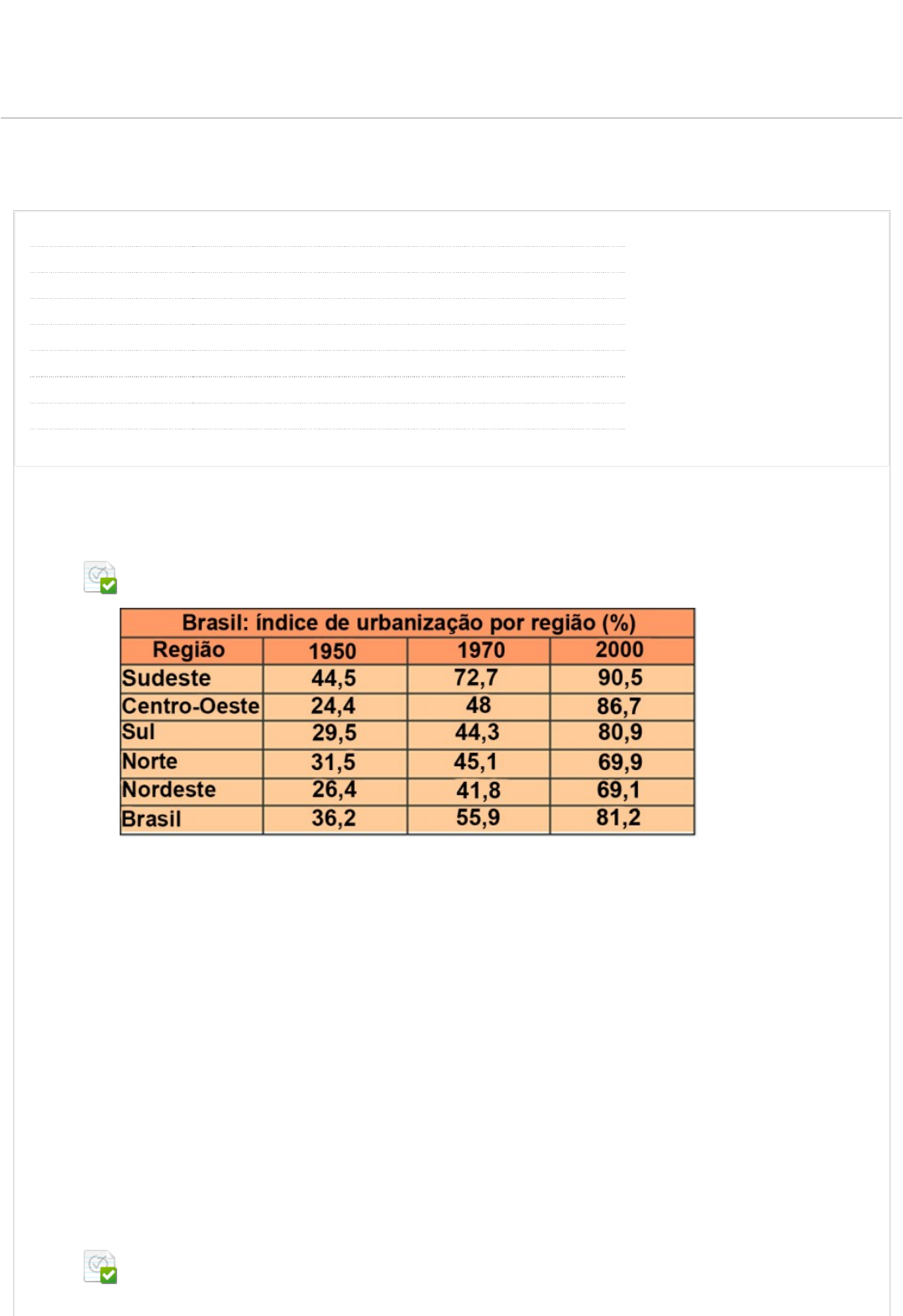 Revisar envio do teste: AVALIAÇÃO I ESTUDOS DISCIPLINARES III 6579-05_SEPI_EF_0124_R_20242 CONTEÚDO Usuário LUIS ALBERTO RIBEIRO GOMES Curso ESTUDOS DISCIPLINARES III Teste AVALIAÇÃO I Iniciado 27/11/24 10:28 Enviado 28/11/24 07:07 Status Completada Resultado da tentativa9 em 10 pontos Tempo decorrido 20 horas, 38 minutos Resultados exibidos Respostas enviadas, Perguntas respondidas incorretamente Pergunta 1 Resposta Selecionada: a. Os dados estatísticos são referentes ao crescimento do índice de urbanização no Brasil. Urbanização é o aumento proporcional da população urbana em relação à população rural. Fonte: “Estatísticas históricas do Brasil: séries econômicas demográficas e sociais de 1550 a 1988”. 2. ed. Rio de Janeiro: IBGE, 1990, p. 36-7. I. Segundo os dados estatísticos, a urbanização ocorre no país devido à população urbana ser superior ao crescimento da população rural. II. O maior índice de urbanização ocorreu na região Sudeste, em que há os estados mais industrializados: São Paulo e Rio de Janeiro. III. Quanto maior o número do índice de urbanização no Brasil, maior o índice do êxodo rural. Assinale a alternativa correta: I, II e III Pergunta 2 (FGV-SP) A partir de levantamentos demográficos, o órgão da ONU que estuda a população elaborou as pirâmides etárias que representam modelos de estrutura demográfica dos UNIP EAD BIBLIOTECAS MURAL DO ALUNO TUTORIAISCONTEÚDOS ACADÊMICOS 1 em 1 pontos 1 em 1 pontos 28/11/2024, 07:07 Revisar envio do teste: AVALIAÇÃO I – ESTUDOS ... https://ava.ead.unip.br/webapps/assessment/review/review.jsp?attempt_id=_109795423_1&course_id=_373755_1&content_id=_4267256_1&retu… 1/7 http://company.blackboard.com/ https://ava.ead.unip.br/webapps/blackboard/execute/courseMain?course_id=_373755_1 https://ava.ead.unip.br/webapps/blackboard/content/listContent.jsp?course_id=_373755_1&content_id=_4266578_1&mode=reset https://ava.ead.unip.br/webapps/portal/execute/tabs/tabAction?tab_tab_group_id=_10_1 https://ava.ead.unip.br/webapps/portal/execute/tabs/tabAction?tab_tab_group_id=_27_1 https://ava.ead.unip.br/webapps/portal/execute/tabs/tabAction?tab_tab_group_id=_47_1 https://ava.ead.unip.br/webapps/portal/execute/tabs/tabAction?tab_tab_group_id=_29_1 https://ava.ead.unip.br/webapps/portal/execute/tabs/tabAction?tab_tab_group_id=_25_1 https://ava.ead.unip.br/webapps/login/?action=logout Resposta Selecionada: d. continentes. Observe as pirâmides I, II e III; referentes ao ano de 2010, apresentadas a seguir. (http://esa.un.org/wpp/population-pyramids/population-pyramids_percentage.htm) Considerando a dinâmica demográfica predominante em cada continente, pode-se afirmar que a pirâmide: III é característica da África, onde a transição demográ�ca encontra- se nas fases iniciais. Pergunta 3 Leia o texto a seguir. Aquecimento global “Emitimos cerca de 9 bilhões de toneladas de monóxido de carbono (CO2) por ano, sendo que menos da metade dessa quantidade permanece na atmosfera. O CO2 é um dos causadores do efeito estufa, juntamente com o metano (CH4) e os cloro�uorcarbonos (CFC). Medindo a concentração de carbono em rochas, os cientistas determinaram um aumento súbito na concentração de carbono na atmosfera entre as eras paleocena e eocena. Esse evento, seguido de uma queda lenta na concentração de carbono, foi denominado Evento Termal Máximo do Paleoceno-Eoceno (PETM) e estendeu-se por cerca de 150 mil anos, até que todo o carbono em excesso fosse reabsorvido (�gura 1). Figura 1: Acredita-se que o PETM foi desencadeado por um aumento da temperatura global, que teria causado o derretimento dos depósitos de hidrato de metano, liberando metano na atmosfera. Uma molécula de metano contribui cerca de 20 vezes mais para o aquecimento da atmosfera do que uma molécula de CO2. Com o tempo, o metano passa por um processo de oxidação, produzindo CO2, o que continua provocando elevação na temperatura. 1 em 1 pontos 28/11/2024, 07:07 Revisar envio do teste: AVALIAÇÃO I – ESTUDOS ... https://ava.ead.unip.br/webapps/assessment/review/review.jsp?attempt_id=_109795423_1&course_id=_373755_1&content_id=_4267256_1&retu… 2/7 Resposta Selecionada: d. O PETM teve como consequência um aumento da acidez dos mares, provocando a extinção de algumas espécies e a migração de outras em direção aos polos, além da diminuição do tamanho dos mamíferos durante o período de concentração alta de carbono na atmosfera. Estamos lançando cada vez mais CO2 na atmosfera e a temperatura do planeta vem aumentando desde o início da era industrial. É questão de tempo até atingirmos uma temperatura global similar à que antecedeu o PETM, fazendo com que o metano das reservas de hidrato de metano existentes nos polos e no fundo dos oceanos seja liberado, causando um novo episódio de aumento de temperatura global com todas suas implicações à vida no planeta.” (Fonte: National Geographic Brasil. Edição especial CO2. outubro 2011 [com adaptações]). I. O aquecimento gerado pelas emissões de CO2 serviria como desencadeante para o derretimento das reservas de hidrato de metano, liberando metano na atmosfera. II. Como o metano é mais e�ciente para o aquecimento global, teríamos um aumento acentuado da temperatura do planeta. É, aproximadamente, equivalente à concentração de CO2 anterior ao pico. III. É necessário reduzir a quantidade de gás carbônico na atmosfera para evitar outro evento catastró�co. Todas estão corretas. Pergunta 4 Observe os grá�cos, que são referentes ao per�l da população carcerária da cidade do Rio de Janeiro com base no Censo Demográ�co de 2000: Grá�co A - Origem da população carcerária do município do Rio de Janeiro (em %): Grá�co B - Comparação entre as faixas etárias da população total do município e da sua população carcerária (em %): Indique a alternativa que melhor compreende os dados apresentados em ambos os