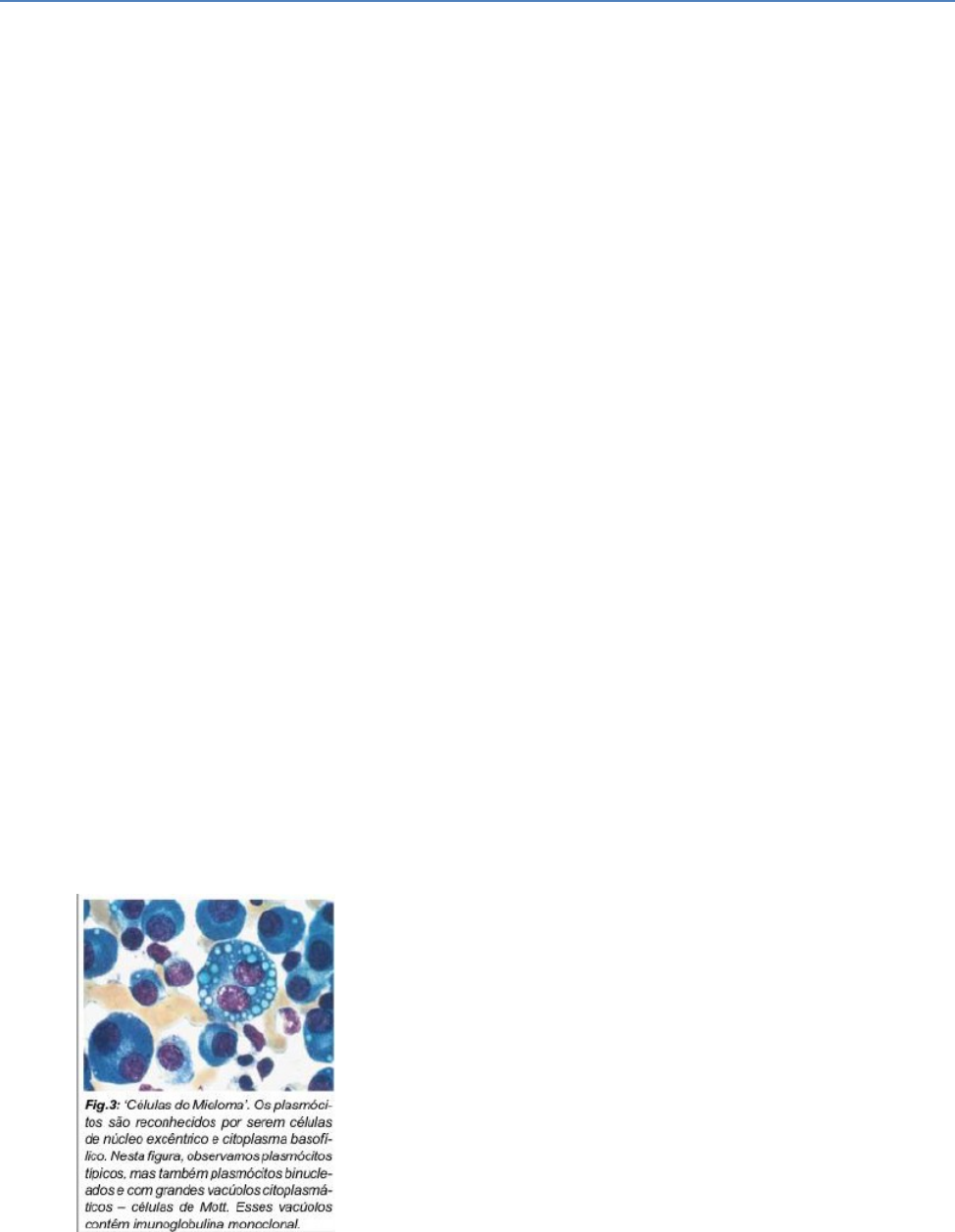 MIELOMA MÚLTIPLO (MIELOMATOSE) O QUE É? É uma doença maligna que afeta a medula óssea e se caracteriza pelo aumento de plasmócitos, células capazes de produzir e secretar anticorpos (imunoglobulinas IgG, IgA, IgM, IgD, IgE) - proteínas. O plasmócito anormal/neoplásico do mieloma irá produzir uma imunoglobulina única (monoclonal) e anormal, denominado proteína M ou paraproteína. Obs: Normalmente as imunoglobulinas são policlonais e representam a produção combinada de milhões de plasmócitos diferentes. Principal representante das neoplasias plasmocitárias. MARCOS DA DOENÇA: Plasmocitose medular + gamopatia monoclonal + lesões de órgão alvo (anemia, lesões ósseas líticas, hipercalcemia e insuficiência renal). PATOGÊNESE: A origem do clone neoplásico do mieloma parece ser um linfócito B de memória ou um plasmablasto. Essas células – linfócito B de memória ou plasmoblasto - são formadas no tecido linfoide (linfonodos, baço) a partir dos centrócitos (células B presentes nos centros germinativos e que foram selecionadas pela estimulação antigênica). O plasmablasto sai do tecido linfoide e migra para a medula óssea, onde se transforma em plasmócito, uma célula altamente capaz de produzir anticorpos. No mieloma múltiplo, o clone neoplásico pode surgir inicialmente no tecido linfoide, porém somente no microambiente da M.O encontra as devidas condições para se proliferar. A medula então se torna repleta de plasmócitos neoplásicos (“células do mieloma”), alguns de morfologia semelhante aos plasmócitos normais e outros com características atípicas: · Assincronia núcleo-citoplasmática · Plasmócitos grandes, binucleados ou trinucleados com vacúolos citoplasmáticos células de Mott As “células do mieloma” se proliferam na M.O, ocupando o espaço das céulas hematopoiéticas. Neste processo liberam substâncias que inibem a proliferação de eritroblastos e ativam osteoclastos (reabsorção óssea). A hiperatividade osteoclástica em volta dos focos de neoplasia medular é o principal mecanismo da destruição óssea que acompanha a doença. As “células do mieloma” interagem com diversas células da M.O ativando umas, inibindo algumas e sendo ativada por outras (células dendríticas, osteoblastos, osteoclastos, células do estroma). A IL-6 é uma citocina fundamental para a proliferação das células mielomatosas. Anomalias cromossômicas são encontradas em até 50% dos casos monossomia do 13, trissomia do 9 e algumas translocações – t(4;14) e t(14;16) EPIDEMIOLOGIA · População > 50 anos (idade média de apresentação = 65 anos) · Raro em indivíduosA lesão glomerular pela proteína amiloide constitui outra causa de IRC em portadores de MM Decorre do depósito tecidual progressivo de cadeias leves que se transformaram em fibrilas amiloides. Órgãos mais afetados: língua (macroglossia), coração (cardiomiopatia restritiva), nervos periféricos (polineuropatia) e glomérulos (nefropatia amiloide). Vermelho congo + A glomeruloparia amiloide evolui via de regra com síndrome nefrótica manifesta. O tto é o mesmo do MM, com preferência pelo transplante autólogo. Doença de cadeia leve ** doença relacionada É uma variante da amiloidose AL, diferenciada pelo fato dos depósitos de cadeia leve não formarem fibrilas amiloides. 4) Envolvimento neurológico · Compressão medular: emergência oncológica As células do mieloma provenientes do acometimento vertebral adjacente, invadem o canal espinhal e podem provocar compressão extradural da medula espinhal ou de suas raízes nervosas. dor radicular Outro motivo: Fx vertebral patológica · Crise hipercalcêmica: Principal mecanismo de alteração do estado mental no paciente com MM. Níveis de cálcio > 12 mg/dL cefaleia, náusea, vômitos, evolui com desorientação, convulsões generalizadas, torpor e coma · Polineuropatia periféria Complicação incomum geralmente associada a amiloidose AL ou a síndrome de POEMS. Porém, é um efeito colateral comum do tratamento do MM com talidomida e/ou bortezomib. 5) Síndrome da hiperviscosidade Algumas imunoglobulinas (principalmente IgM, seguida pela IgG e IgA) quando presentes em excesso, podem levar a um aumento importante da viscosidade sérica, produzindo sinais e sintomas da síndrome (cefaleia, fadiga, distúrbios visuais, papiledema, epistaxe, hemorragias retinianas, tinido e ataxia). Tto: plasmaférese de urgência. 6) Mieloma osteoclerótico (síndrome de POEMS) ** doença relacionada É diferente do mieloma clássico. Apresenta um menor número de lesões ósseas, é indolor e com sobrevida média de 13 anos. Presença de polineuropatia (P), organomegalia (O), endocrinopatia (E), proteína monoclonal (M) e alterações de pele (S). O QUE ESTÁ NO SLIDE SOBRE MANIFESTAÇÕES CLÍNICAS: Dor óssea: · Lesões ósseas são comuns nos sítios que produzem medula M.O funcionante. · A hiperatividade osteoclástica em volta dos focos de neoplasia medular é o principal mecanismo da destruição óssea que acompanha a doença. · Dor de alta intensidade (refratária ao uso de AINES), intermitente (movimento dependente), em região lombar. Pode irradiar, sugerindo radiculopatia associada. · Fraturas patológicas (fx por compressão dos corpos vertebrais) dor contínua suspeitar de fx patológica. · RX: lesões líticas · DD: metástases ósseas dor contínua c/ piora noturna · Sinais e sintomas de anemia (letargia, fraqueza, dispneia, palidez, taquicardia): decorrente da ocupação medular e principalmente dos fatores inibitórios da eritropoiese, que são secretados pelas “células do mieloma”. Na doença avançada surgem neutropenia e trombocitopenia Infecções recidivantes: Infecção bacteriana é a principal causa de morte em pacientes com MM. · DIMINUIÇÃO da produção e AUMENTO da degradação periférica das imunoglobulinas normais, levando a hipogamaglobulinemia funcional. A imunoglobulina do co