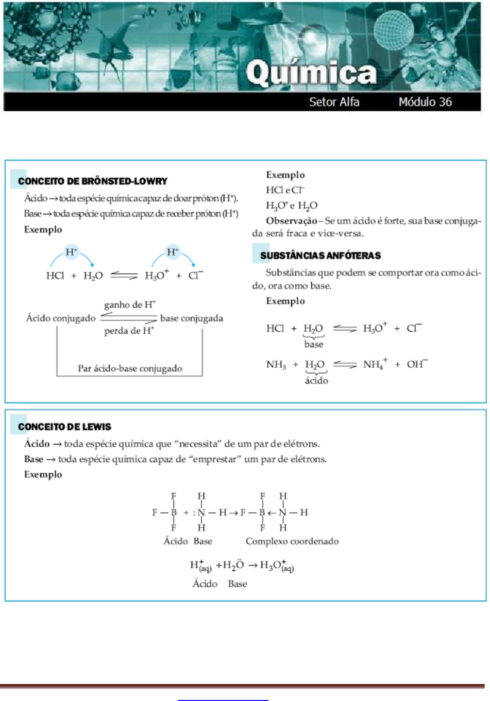 Portal de Estudos em Química (PEQ) – www.profpc.com.br Página 1 CONCEITOS MODERNOS DE ÁCIDOS E BASES Portal de Estudos em Química (PEQ) – www.profpc.com.br Página 2 EXERCÍCIOS DE APLICAÇÃO 01 Na reação segundo a equação: 1 1 1 43 2 2 NH H O NH OH a) Qual o doador de próton na reação direta (1)? b) Qual o receptor de próton na reação direta (1)? c) Qual o ácido de Bronsted-Lowry na reação direta (1)? d) Qual a base de Bronsted-Lowry na reação direta (1)? e) Qual o doador de próton na reação inversa (2)? f) Qual o receptor de próton na reação inversa (2)? g) Qual o ácido de Bronsted-Lowry na reação inversa (2)? h) Qual a base de Bronsted-Lowry na reação inversa (2)? i) Qual os pares conjugados? 02 Indique os ácidos e bases pela teoria de Bronsted-Lowry, e os respectivos pares conjugados nas reações abaixo equacionadas: a) H2CO3 + H2O ⇌ H3O + + HCO3 - b) HCO3 - + H2O ⇌ H3O + + CO3 2- c) HCO3 - + H2O ⇌ H2CO3 + OH- d) HF + HNO3 ⇌ H2F + + NO3 - e) H2SO4 + HCℓO4 ⇌ H3SO4 + + CℓO4 - 03 Na reação segundo a equação: HCℓO + [O] HCℓO2 a) Qual o doador de par eletrônico? b) Qual o receptor de par eletrônico? c) Qual o ácido de Lewis? d) Qual a base de Lewis? e) Qual o reagente eletrófilo? f) Qual o reagente nucleófilo? 04 Faça a associação: ( ) Doador de próton ( ) Doador de par eletrônico ( ) Receptor de próton ( ) Receptor de par eletrônico ( ) Reagente eletrófilo ( ) Reagente nucleófilo (a) Base de Bronsted-Lowry (b) Ácido de Bronsted-Lowry (c) Base de Lewis (d) Ácido de Lewis Portal de Estudos em Química (PEQ) – www.profpc.com.br Página 3 05 Assinale (V) verdadeiro ou (F) falso nas seguintes afirmações: ( ) Todo ácido de Bronsted-Lowry é ácido de Lewis. ( ) Todo ácido de Lewis é ácido de Bronsted-Lowry ( ) Toda base de Arrhenius é base de Bronsted-Lowry ( ) Toda base de Bronsted-Lowry é base de Arrhenius 06 Dadas as espécies químicas, abaixo, é um ácido de Arrhenius: a) Na2CO3 b) KOH c) Na2O d) HCℓ e) LiH 07 Qual das substâncias abaixo pode ser uma base de Arrhenius? a) CH3COOH. b) HCℓ. c) KOH. d) H2SO4. e) CH3OH. 08 No conceito de ácido-base de Bronsted-Lowry, ácido é a espécie química que: a) cede prótons. b) cede OH–. c) recebe prótons. d) recebe OH–. e) cede um par de elétrons. 09 Considere as espécies: HSO4 –, NH4 +, H2O, SO4 2– Há possibilidade de classificar como ácido de Bronsted: a) HSO4 –, NH4 + e H2O. b) H2O e SO4 2–. c) HSO4 –, apenas. d) NH4 +, apenas. e) SO4 2–. 10 (FUC-MT) No equilíbrio abaixo, de acordo com o conceito ácido-base de Brönsted-Lowry, podemos afirmar que: HCℓ + NH3 ⇌ NH4 + + Cℓ- a) NH4 + atua como base. b) NH3 atua como base. c) HCℓ atua como base. d) Cℓ– atua como ácido. e) NH3 atua como ácido. Portal de Estudos em Química (PEQ) – www.profpc.com.br Página 4 EXERCÍCIOS PROPOSTOS 11 Podemos dizer que os ácidos HCℓ e HCN apresentam, respectivamente, as seguintes bases conjugadas: a) H2Cℓ + e H2CN+. b) Cℓ– e CN–. c) OH– e OH– . d) NaOH e KOH. e) H+ e OH–. 12 A(s) coluna(s) que contém(êm) somente ácidos, segundo a teoria de Bronsted-Lowry, é(são): a) somente a 1ª coluna. b) somente a 2ª coluna. c) somente a 3ª coluna. d) somente a 1ª e a 3ª coluna. e) somente a 2ª e a 4ª coluna. 13 Assinale a alternativa que contém um par conjugado no conceito de Brönsted-Lowry: a) NO3 – e Cℓ–. b) Na+ e SO4 2–. c) HCℓO4 e CℓO4 –. d) OH– e NO3 –. e) HNO3 e NaOH. 14 (UMC-SP) Aponte a espécie química que é a base conjugada do íon H2P2O7 2–: a) H4P2O7. b) H3P2O7 1–. c) H2P2O7 2–. d) HP2O7 3–. e) P2O7 4–. 15 (UFRO) Na reação entre um hidreto metálico e amônia líquida, representada pela equação abaixo, são bases de Brönsted: H- + NH3 ⇌ NH2 - + H2 a) H– e H2. b) NH2 – e NH3. c) H2 e NH3. d) H– e NH2 –. e) NH3 e H–. Portal de Estudos em Química (PEQ) – www.profpc.com.br Página 5 16 (PUC-SP) Assinale a afirmativa que não é correta: a) Um ácido e sua base conjugada diferem entre si por um próton. b) A força de um ácido de Brönsted pode ser medida pela capacidade de ceder próton. c) Quanto mais forte for um ácido de Brönsted, mais fraca será sua base conjugada. d) Um processo ácido-base de Brönsted é espontâneo no sentido de formação do ácido mais fraco, a partir do ácido mais forte. e) O HF é o ácido de Brönsted, no processo HF + HCℓO4 ⇌ ClO4 – + H2F +. 17 (UFSM-RS) Observe as equações: I. H3O + + CN- ⇌ HCN + H2O II. NH3 + CO3 2- ⇌ NH2 - + HCO3 - III. C2H5O - + NH3 ⇌ C2H5OH + NH2 - De acordo com Brönsted-Lowry, os compostos destacados são, respectivamente: a) base – ácido – ácido. b) base – base – ácido. c) ácido – ácido – base. d) ácido – base – ácido. e) base – ácido – base. 18 (UFSC) Nas reações: I. NH3 + H2O ⇌ NH4 + + OH- II. HBr + H2O ⇌ H3O + + Br- De acordo com Bronsted-Lowry a água é: 01. Um ácido nas reações I e II. 02. Uma base nas reações I e II. 04. Um ácido na reação I e uma base na reação II. 08. Um receptor de próton na reação I e um doador de próton na reação II. 16. O ácido conjugado da base OH- na reação I. Soma ( ) 19 (UFES-ES) Pela teoria de Brönsted-Lowry, na reação abaixo os ácidos são: NH3 + H2O ⇌ NH4 + + OH- a) NH3 e NH4 +. b) H2O e NH4 +. c) NH3 e OH–. d) H2O e OH–. e) NH3 e H2O. Portal de Estudos em Química (PEQ) – www.profpc.com.br Página 6 20 Segundo Arrhenius, Brönsted-Lowry e Lewis, uma base é, respectivamente: a) fonte de OH– em água, receptor de OH–, doador de 1 elétron. b) fonte de OH– em água, receptor de H+, doador de par de elétrons. c) fonte de H+ em água, doador de H+, doador de par de elétrons. d) fonte de OH– em água, doador de H+, receptor de par de elétrons. e) fonte de H+ em água, receptor de H+, receptor de par de elétrons. 21 (UNICAP) Analisando as espécies a seguir: S2–, H+, H2O, NH3, BF3, A