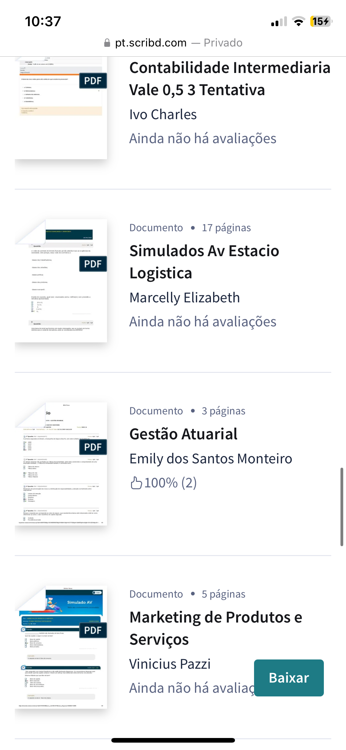 10:37 154 pt.scribd.com - Privado Contabilidade Intermediaria PDF Vale 0,5 3 Tentativa Ivo Charles Ainda não há avaliações Documento 17 páginas Simulados Av Estacio PDF Logistica Marcelly Elizabeth Ainda não há avaliações Documento 3 páginas Gestão Atuarial PDF Emily dos Santos Monteiro 100% (2) Documento 5 páginas Simulado AV Marketing de Produtos e PDF Serviços Vinicius Pazzi Baixar Ainda não há