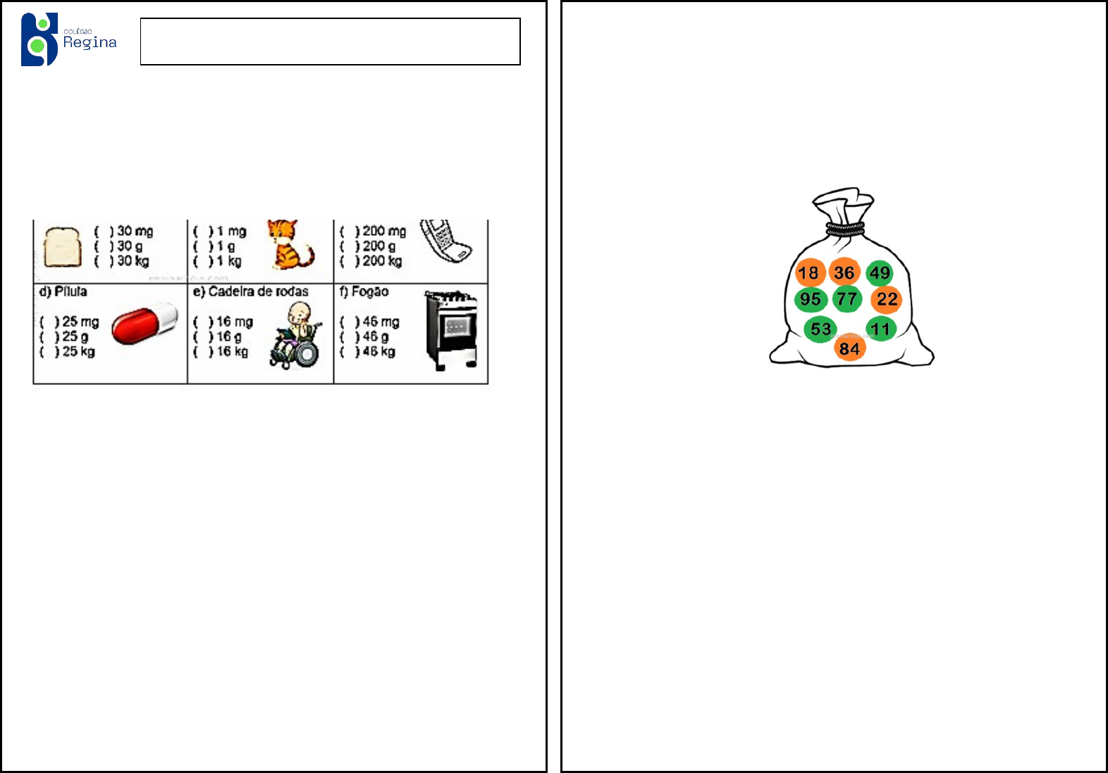 Revisão de Matemática – 3° ano 4) Complete as frases com litros ou mililitros. a. Na caixa de água da escola cabem 5.000________________. b. Esta lata contém 350 ________________. c. Helena tomou uma dose 25________________. d. Comprei 2 ________________ de leite para fazer arroz-doce. e. Quero um copo com 300________________. 5) Em um saquinho há bolinhas com números pares e ímpares, veja. a) Ao todo há quantas bolinhas no saco? ____________________ b) Quantas bolinhas possuem números pares?________________ c) Quantas bolinhas possuem números ímpares?_______________ d) Ao colocar a mão no saco e pegar uma bolinha, qual tipo de número tem mais chances de sair: par ou ímpar? Por quê? ____________________________________________________________________________________ 6) Carlinhos está em uma lanchonete que oferece dois tipos de suco: laranja e limão. A mesma lanchonete oferece três tipos de salgado: coxinha, empada e esfirra. De quantas maneiras diferentes, Carlinhos pode lanchar um salgado e um suco? 1) Cada medida é adequada para medir a massa de determinados itens. Quando o item é pequeno podemos medir com miligramas (mg) quando o item tem porte médio podemos medir com gramas (g) e quando é algo grande podemos pedir com quilogramas (kg). Marque a medida de massa mais adequada para cada item. 2) Relacione as siglas abaixo com suas unidades de medida correspondentes. 3) Identifique a unidade de medida mais adequada para calcular o tamanho dos seguintes objetos. a) Medir a altura de um prédio. ______________________________ b) Calcular o tamanho de uma rodovia.________________________ c) Medir o comprimento de um lápis._________________________ image3.png image4.png image1.png image2.png