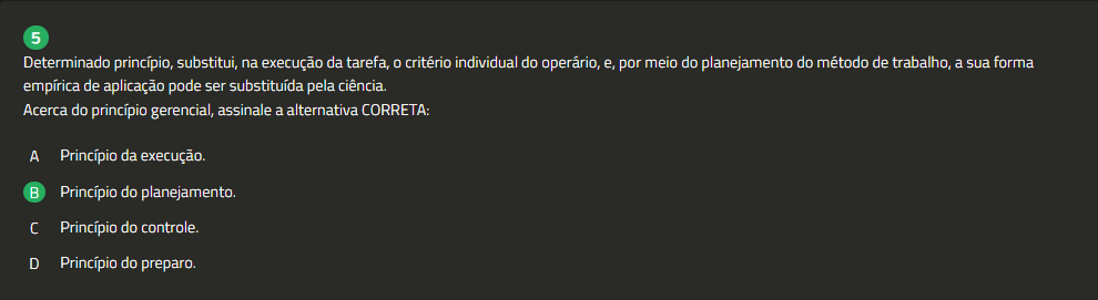 5 Determinado princípio, substitui, na execução da tarefa, critério individual do operário, e. por meio do planejamento do método de trabalho, a sua forma empírica de aplicação pode ser substituída pela ciência. Acerca do princípio assinale a alternativa CORRETA: A Princípio da execução. B Princípio do planejamento. C Princípio do controle. D Princípio do preparo.