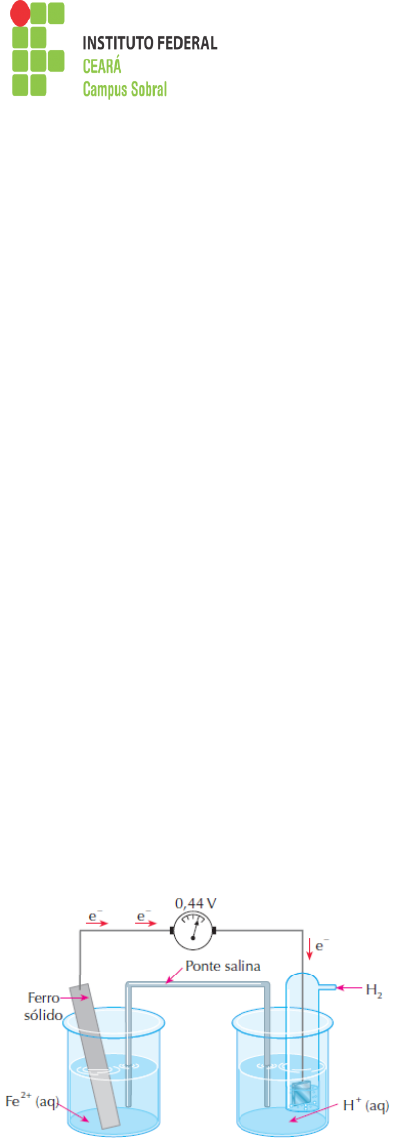 Disciplina: Química Geral – Profª: Edla Melo. Aluno:___________________________________________ Data:___/___/___ Turma:____________________________________ Semestre:____________ 1. Em uma pilha Ni°, Ni+2, Ag+ , Ag°, os metais estão mergulhados em soluções aquosas 1,0 M de seus respectivos sulfatos, a 25 °C. Dados: Ni+2 + 2e- Ni° (E°red= - 0,25 V) Ag+ + 1e- Ag° (Eºred= 0,80 V) Determine: a) a equação global da pilha; b) o sentido do fluxo de elétrons; c) o valor da força eletromotriz (fem) da pilha. 2. O ferro galvanizado apresenta-se revestido por uma camada de zinco. Se um objeto desse material for riscado, o ferro ficará exposto às condições do meio ambiente e poderá formar o hidróxido ferroso. Nesse caso, o zinco, por ser mais reativo, regenera o ferro, conforme a reação representada abaixo. Fe(OH)2 + Zn → Zn(OH)2 + Fe Sobre essa reação, pode-se afirmar que: a) o ferro sofre oxidação, pois perderá elétrons. b) o zinco sofre oxidação, pois perderá elétrons. c) o ferro sofre redução, pois perderá elétrons. d) o zinco sofre redução, pois ganhará elétrons. e) o ferro sofre oxidação, pois ganhará elétrons. 3. A equação seguinte indica as reações que ocorrem em uma pilha: Zn(s) + Cu+2 (aq) → Zn+2 (aq) + Cu(s) Podemos afirmar que: a) o zinco metálico é o cátodo. b) o íon cobre sofre oxidação. c) o zinco metálico sofre aumento de massa. d) o cobre é o agente redutor. e) os elétrons passam dos átomos de zinco metálico aos íons de cobre. 4. O esquema abaixo representa a pilha ferro-hidrogênio (eletrodo-padrão). O voltímetro indica a força eletromotriz em condiçõespadrão. O anodo dessa pilha e o potencial-padrão de redução do ferro são, respectivamente: a) eletrodo de ferro e - 0,44 V. b) eletrodo de ferro e 0,22 V. c) eletrodo de ferro e 0,44 V. d) eletrodo de hidrogênio e - 0,44 V. e) eletrodo de hidrogênio e 0,44 V. 5. Sabendo que o cobalto pode ceder elétrons espontaneamente para os íons Au+3 e considerando a pilha: Co°|Co+2||Au+3|Au° responda às seguintes perguntas: a) Qual é a reação global do processo?Quais as semireações? b) Quem se oxida? Quem se reduz? c) Qual é o eletrodo positivo ou catodo? Qual é o negativo ou anodo? d) Em que sentido fluem os elétrons pelo fio? e) Qual eletrodo será gasto? Qual terá sua massa aumentada? f) Qual das duas soluções irá diluir-se? Qual irá concentrar-se? g) Quais os íons em trânsito na solução? Em que sentido? 6. A vida de uma pilha, na qual as duas semi-reações são Zn°/Zn+2 e Cu+2/Cu°, pode ser aumentada, usando-se: a) um eletrodo maior de zinco. b) um eletrodo maior de cobre. c) uma solução de sulfato de cobre (II) concentrada. d) uma solução de sulfato de zinco diluída. e) uma ponte salina entre as soluções. 7. Relativamente à pilha abaixo, começando a funcionar, fazem-se as afirmações: I. A reação global da pilha é dada pela equação: Cu + 2Ag+ → Cu+2 + 2Ag II. O eletrodo de prata é o pólo positivo. III. No anodo, ocorre a oxidação do cobre. IV. A concentração de íons de Ag" na solução irá diminuir. V. A massa da barra de cobre irá diminuir. São corretas: a) III, IV e V somente. b) I, III e V somente. c) II e IV somente. d) I, IV e V somente. e) I, II, III, IV e V. 8. Nas semi-reações: Ni+2 (aq) + 2e- Ni°(s) Ag+ (aq) + 1e- Ag°(s) O ΔE da pilha, o cátodo e o ânodo são, respectivamente: a) 1,04 V, prata, níquel. b) 1,04 V, níquel, prata. c) - 0,56 V, prata, níquel. d) - 1,04 V, níquel, prata. e) 0,56 V, prata, níquel. Dados: E°red. Ag= 0,80 V; E°red. Ni= -0,24 V 9. Com base nos seguintes potenciais de redução: Mg+2 (aq) +2e- → Mg(s) E°= -2,37 V Ni+2 (aq) +2e- → Ni(s) E°= -0,25 V Fe+3 (aq) + e- → Fe+2 (aq) E°= 0,77 V Cu+2 (aq) + 2e- → Cu(s) E°= 0,34 V A equação que corresponde à única reação espontânea é: a) Mg+2 (aq) + Ni(s) → Mg(s) + Ni+2 (aq) b) Cu+2 (aq) + Mg(s) → Cu(s) + Mg+2 (aq) c) Ni+2 (aq) + 2 Fe+2 (aq) → Ni(s) + 2 Fe+3 (aq) d) Cu+2 (aq) + 2 Fe+2 (aq) → Cu(s) + 2 Fe+3 (aq) e) Ni+2 (aq) + Cu(s) → Ni(s) + Cu+2 (aq) 10. Considere os metais com seus respectivos potenciais-padrão de redução: Al+3 + 3e- → Al (E= - 1,66 V) Zn+2 + 2e- → Zn (E= - 0,76 V) Fe+2 + 2e- → Fe (E= - 0,44 V) Cu+2 + 2e- → Cu (E= 0,34 V) Hg+2 + 2e- → Hg (E= 0,85 V) Analise as seguintes afirmativas: I. O melhor agente redutor é o Hg. II. O Al cede elétrons mais facilmente que o Zn. III. A reação Cu+2 + Hg → Cu + Hg+2 não é espontânea. IV. O íon Al+3 recebe elétrons mais facilmente do que o íon Cu+2. V. Pode-se estocar, por longo prazo, uma solução de sulfato ferroso num recipiente à base de cobre. A opção que contém somente afirmativas corretas é: a) I, II e IV b) II, III e IV c) III, IV e V d) II, III e V e) I, II e III 11. Baterias de óxido de prata-zinco tornaram-se, recentemente, de grande aplicabilidade. São utilizadas em quase tudo: relógios de pulso, calculadoras, aparelhos de escuta e muitos outros aparelhos eletrônicos. As semi-reações, durante o processo de descarga, podem ser representadas pelas equações: Zn(s) + 2OH(aq) → Zn(OH)2(s) + 2e- Ag2O(s) + H2O(l) + 2e- → 2Ag(s) + 2OH- (aq) Responda: a) Qual equação representa a semi-reação que ocorre no cátodo? b) Qual a equação representativa da reação global na pilha? c) Qual a direção do fluxo de elétrons? 12. Dois metais diferentes são colocados, cada qual numa solução aquosa de um de seus sais, e conectados a um voltímetro, que registra a diferença de potencial no sistema, conforme ilustrado abaixo. Considere os metais e os respectivos potenciais de redução dados nesta tabela: A maior diferença de potencial no sistema está registrada quando os metais utilizados forem quais? a) Prata e cobre. b) Prata e zinco. c) Cobre e zinco. d) Cobre e chumbo. e) Chumbo e zinco. 13. Nas pilhas 1 e 2, formadas pelos eletrodos dados acima, com os respectivos potenciais-padrão de redução, 