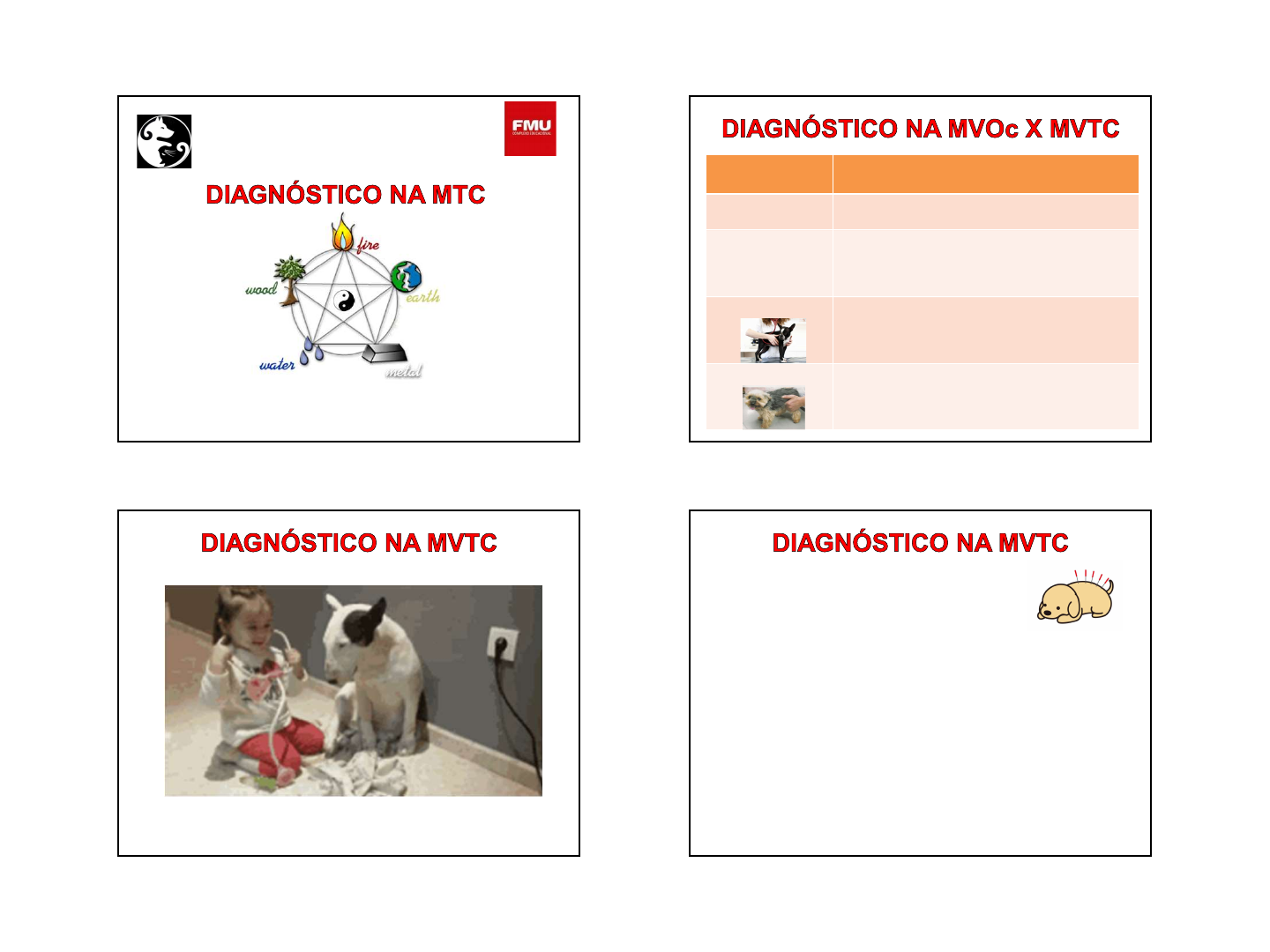 10/16/2024 1 Complexo Educacional - FMU Fisioterapia e ReabilitaçãoAnimal Profa. Dra Iracema Nunes de Barros Medicina Veterinária Tradicional ChinesaMedicina Veterinária Ocidental - Perguntar ao tutor sobre a história clínica - Perguntar ao tutor sobre hábitos Anamnese - Observar o aspecto da língua - Observar o Shen - Observar o aspecto pelagem - Observar o aspecto geral do corpo Inspeção - Escutar a qualidade da voz - Auscultar a respiração - Auscultar coração e pulmões - Sentir o hálito ou odor do corpo Auscultação/ Olfação - Sentir pulso - Palpar os meridianos - Palpar os pontos Shu dorsais e Mu ventrais (pontos de alarme) Palpação Cinco elementos Oito princípios Exame de língua / Olho Pulsologia Pontos Shu dorsais (Assentimento) Pontos Mu (Alarme) 1 2 3 4 10/16/2024 2 FOGO C/ID CS/TA TERRA E/BP MADEIRA F/VB ÁGUA R/B Metal P/IG YANGYINELEMENTOS Vesícula BiliarFígadoMADEIRA IDCoração FOGO Triplo AquecedorPericárdio ou Circulação- sexo EstômagoBaço - PâncreasTERRA IGPulmãoMETAL BexigaRimÁGUA Rim: Dor lombar, fraqueza em membros pélvicos ou joelhos, doença crônica, alterações ósseas. Fígado: Contratura muscular ou espasmos, tremores, alterações tendíneas, distúrbios oculares, irritabilidade, distúrbios no ciclo estral. Coração: Agitação, ansiedade, insônia, palpitação, confusão mental. Baço/Pâncreas: Perda de apetite, cansaço, diarreia, hérnias, prolapso de órgãos, sinais de umidade. Pulmão: Tosse, espirros, dispneia, debilidade no latido/miado. 5 6 7 8 10/16/2024 3 Ativos e cheios de energia; Dinâmicos; Impacientes, competitivos e se irritam com facilidade, podendo ser agressivos; Inteligentes; Gostam de companhia; Raças: Beagle, Schnauzer, Cocker Spaniel Inglês, Fox Paulistinha. Cães do Tipo Madeira Raças: Beagle, Schnauzer, Cocker Spaniel Inglês, Fox Paulistinha. Cães do Tipo Madeira Brincalhões e vibrantes; Muita vitalidade; Amam pessoas e são carismáticos; Líderes e lutadores; Autoconfiantes e com facilidade de aprendizado. Raças: Doberman,Poodle, Dálmatas, Pinscher, Rottweiler, Pit Bull, Bull Terrier. Cães do Tipo Fogo Cães do Tipo Fogo Raças: Doberman,Poodle, Dálmatas, Pinscher, Rottweiler, Pit Bull, Bull Terrier. 9 10 11 12 10/16/2024 4 Fiéis, amistosos, companheiros, solidários; Conformação grande, musculosos e pesados; Levam mais tempo para aprender; Não gostam de mudanças; Obcessivos, metódicos e sistemáticos; Raças: São Bernardo, Terra Nova,Fila, Basset Hound, Bernese mountain Dog. Cães do Tipo Terra Raças: São Bernardo, Terra Nova,Fila, Basset Hound, Bernese mountain Dog. Cães do Tipo Terra Facilidade de aprendizado; Conformação robusta e angular; Confiantes, auto-suficientes e as vezes podem ter natureza triste ou frieza Magoam-se facilmente (Chorão) Independentes, fazem as coisas sozinhos; Raças: Collie, cães de caça, Terrier, Akita, Husky Siberiano, Pastor Alemão. Cães do Tipo Metal Raças: Collie, cães de caça, Terrier, Akita, Husky Siberiano, Pastor Alemão. Cães do Tipo Metal 13 14 15 16 10/16/2024 5 Observadores e sob pressão ficam tensos e apreensivos, podendo ser tranquilo, ansioso e medroso; Sociáveis, flexíveis e adaptáveis; Respeitam o tutor Conformação grande, robusta e ótima pelagem; Pouco poder de decisão Raças: Labrador, Boxer, Afghan Hound, Shi tzu, Pequinês, Lhasa Apso, Teckel. Cães do Tipo Água Raças: Labrador, Boxer, Afghan Hound, Shi tzu, Pequinês, Lhasa Apso, Teckel. Cães do Tipo Água YANGYIN PLENITUDE ou EXCESSO VAZIO ou DEFICIÊNCIA CALORFRIO EXTERNAINTERNA Permite identificar a localização e a natureza da desarmonia, assim como estabelecer o princípio do tratamento. 17 18 19 20 10/16/2024 6 PLENITUDE / EXCESSO VAZIO / DEFICIÊNCIA Inspeção hiperemotividade Hipoemotividade forte e ativo fraco e passivo tez e escleróticas vermelhas tez sombria, ou pálida, com bochechas vermelhas músculos hipertônicos músculos hipotônicos, atróficos respiração forte, tórax alargado respiração superficial pouca transpiração transpirações abundantes língua de cor acentuada, cobertura espessa língua pálida, cobertura fina e esbranquiçada Ausculta Voz forte Voz fraca Interrogatório gosta de companhia Gosta de ficar só Prefere claridade Prefere escuridão Infadigável Fadigável Sem variação de temperatura, sem febre temperatura baixa, membros frios, às vezes; sensação de calor à tarde dores agravadas pela massagem dores aliviadas pela massagem dores queimantes hipoestesia, prurido digestão rápida, fome (exceto períodos de febre ou constipação) em digestão lenta, anorexia constipação ou disenteria com fezes amareladas brilhantes diarréia com alimentos mal digeridos e fezes esbranquiçadas hipertonia intestinal hipotonia intestinal queimação e dor no ânus frio no ânus urina pouco transpira pouco regras abundantes e vermelhas dor no baixo-ventre pré-menstrual urina abundante transpira muito regras poucas e pálidas dor pós-menstrual Palpação zonas quentes frio geral ou localizada abdome resistente, distendido e doloroso à palpação abdômen mole, facilmente depressível, e dor melhora pela pressão flatulência gástrica ou intestinal pulso forte e pleno pulso fraco e vazio 21 22 24 25 10/16/2024 7 YANGYIN ExcessoDeficiência HiperatividadeHipoatividade Doença agudaDoença crônica Inquietude / InsôniaLetargia / Sonolência Extremidades quentesExtremidades frias Secura excessivaUmidade excessiva Doenças inflamatóriasDoenças degenerativas VENTO FRIO CALOR UMIDADE SECURA Dor que anda; Vento é movimento e gera movimento Pruridos Erupções de pele Tremores nas extremidades Dores (contraturas) Tonturas Excesso de Yin ou Yang deficiente. Arrepios Palidez Membros Frios Diarreia com alimentos não digeridos Urina clara e abundante Dores graves / câimbras 26 27 28 29 10/16/2024 8 Calor verdadeiro (Yang em excesso/ calor externo) X falso (Yin deficiente) X Fogo interno Sintomas de calor melhoram com frio Se