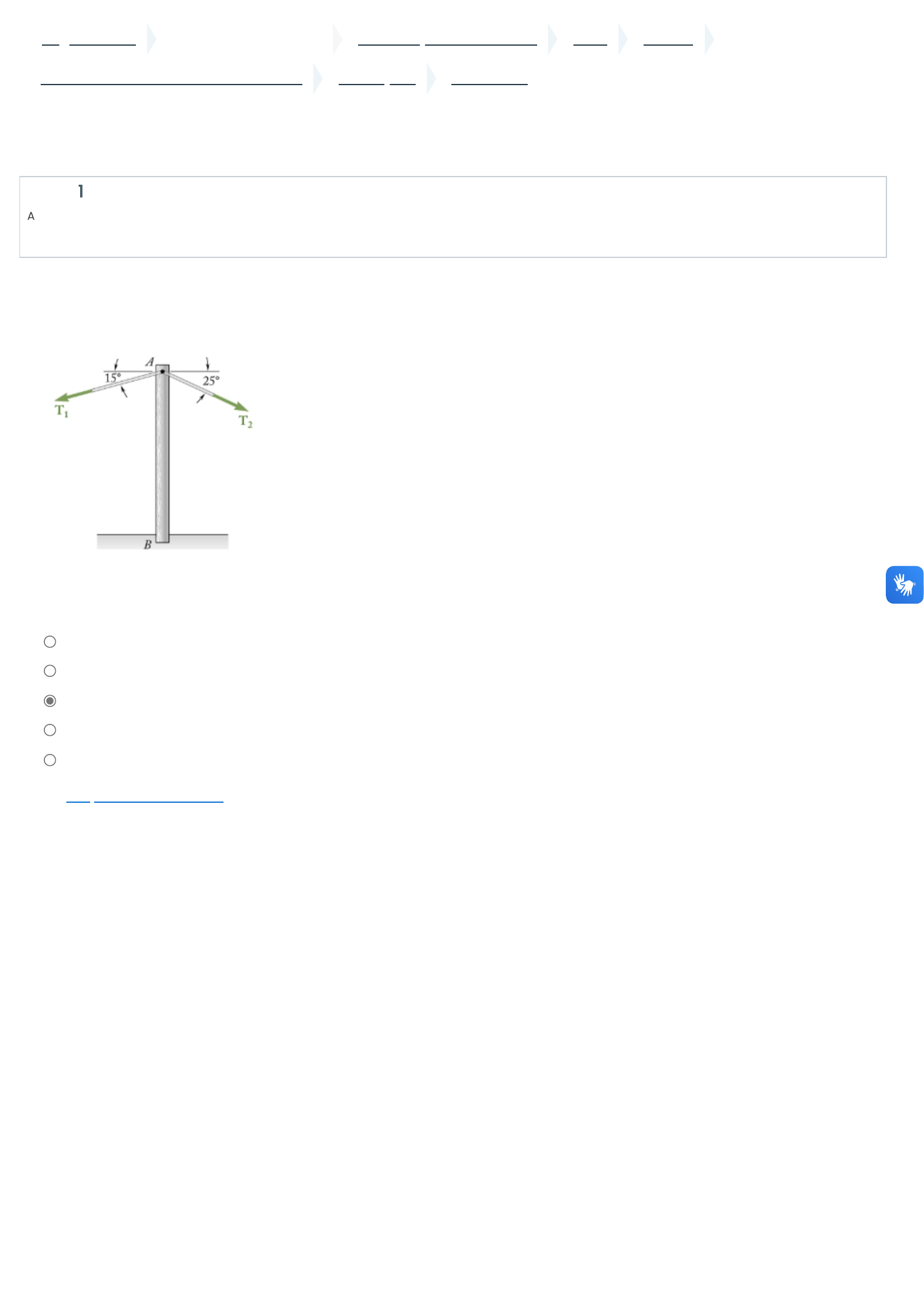 ... Página inicial Disciplinas e Espaços GRADUAÇÃO A DISTÂNCIA 2024 2024-3 Mecânica Estática - 2024_03_EAD_B Avaliações Prova Final Questão 1 Ainda não respondida Vale 1,00 ponto(s). Um cabo de telefone está preso a A no poste AB. Sabendo que a tração no lado esquerdo do cabo T1 = 800 N e que a tração que ocorre do outro lado vale T2= 1 kN, determine a intensidade e direção da força resultante. Escolha uma opção: a. Fr= 123,13 N e θ = -78,02º b. Fr= -643,69 N e θ = 78,02º c. Fr= 643,69 N e θ = -78,02º d. Fr= 643,69 N e θ = -67,11º e. Fr= 123,13 N e θ = -101,98º Limpar minha escolha https://ava.candidomendes.edu.br/moodle/ https://ava.candidomendes.edu.br/moodle/course/index.php?categoryid=8 https://ava.candidomendes.edu.br/moodle/course/index.php?categoryid=175 https://ava.candidomendes.edu.br/moodle/course/index.php?categoryid=185 https://ava.candidomendes.edu.br/moodle/course/view.php?id=15054 https://ava.candidomendes.edu.br/moodle/course/view.php?id=15054§ion=4 https://ava.candidomendes.edu.br/moodle/mod/quiz/view.php?id=509425 https://ava.candidomendes.edu.br/moodle/mod/quiz/attempt.php?attempt=619564&cmid=509425 Questão 2 Ainda não respondida Vale 1,00 ponto(s). Questão 3 Ainda não respondida Vale 1,00 ponto(s). Dada a seção transversal ilustrada abaixo, calcule o centroide. Escolha uma opção: a. X= 24,23 mm e Y=42,23 mm b. X= 36 mm e Y=24,23 mm c. X= 42,23 mm e Y=22,5 mm d. X= 42,23 mm e Y=24,23 mm e. X= 9,23 mm e Y=14,23 mm Limpar minha escolha Para a viga ilustrada na figura, determine o maior esforço cortante e o maior momento fletor que atuam no material. Escolha uma opção: a. Esforço cortante máximo: 22,5 kN; Momento fletor máximo: 19,8 kN*m. b. Esforço cortante máximo: 50,5 kN; Momento fletor máximo: 19,8 kN*m. c. Esforço cortante máximo: 50,5 kN; Momento fletor máximo: 39,8 kN*m. d. Esforço cortante máximo: 22,5 kN; Momento fletor máximo: 39,8 kN*m. e. Esforço cortante máximo: 39,8 kN; Momento fletor máximo: 50,5 kN*m. Limpar minha escolha https://ava.candidomendes.edu.br/moodle/mod/quiz/attempt.php?attempt=619564&cmid=509425 https://ava.candidomendes.edu.br/moodle/mod/quiz/attempt.php?attempt=619564&cmid=509425 Questão 4 Ainda não respondida Vale 1,00 ponto(s). Questão 5 Ainda não respondida Vale 1,00 ponto(s). Uma força horizontal de 3 kN é aplicada no pino A da estrutura mostrada na figura. Determine as forças que ocorrem nos elementos AB e CD. Escolha uma opção: a. Fab= 7,8 kN (saindo do elemento) e Fcd= 5,2 kN (entrando no elemento). b. Fab= 5,2 kN (saindo do elemento) e Fcd= 5,2 kN (saindo do elemento). c. Fab= 5 kN (entrando no elemento) e Fcd= 5 kN (entrando no elemento). d. Fab= 5 kN (saindo do elemento) e Fcd= 5 kN (saindo do elemento). e. Fab= 5,2 kN (saindo do elemento) e Fcd= 7,8 kN (entrando no elemento). Limpar minha escolha Dois elementos estruturais B e C estão aparafusados a uma braçadeira A conforme indicado na figura. Sabendo que os elementos estão em tração e que P = 10 kN e Q = 15 kN, determine graficamente a intensidade, a direção e o sentido da força resultante exercida sobre a braçadeira. Escolha uma opção: a. Fr= 20,06 kN e θ = 71,22º b. Fr= -20,06 kN e θ = 101,22º c. Fr= 20,06 kN e θ = 21,22º d. Fr= 27,12 kN e θ = 21,22º e. Fr= 27,12 kN e θ = 71,22º Limpar minha escolha https://ava.candidomendes.edu.br/moodle/mod/quiz/attempt.php?attempt=619564&cmid=509425 https://ava.candidomendes.edu.br/moodle/mod/quiz/attempt.php?attempt=619564&cmid=509425 Questão 6 Ainda não respondida Vale 1,00 ponto(s). Questão 7 Ainda não respondida Vale 1,00 ponto(s). Um cilindro de 200 kg está pendurado por meio de dois cabos AB e AC, presos ao topo de uma parede vertical. Uma força horizontal P perpendicular à parede segura o cilindro na posição mostrada na figura. Determine a intensidade de P e a tração em cada cabo. Escolha uma opção: a. P=1402N; Tab= 235N; Tac=1238N. b. P=1402N; Tab= 1238N; Tac=235N. c. P=235N; Tab= 1238N; Tac=1402N. d. P=1238N; Tab= 1402N; Tac=235N. e. P=235N; Tab= 1402N; Tac=1238N. Limpar minha escolha Uma força vertical de 500 N é aplicada na extremidade de uma alavanca que está ligada a um eixo em O, conforme a figura. Determine o momento da força de 500 N em relação a O. Escolha uma opção: a. Momento de 150 Nm no sentido horário. b. Momento de 150 Nm no sentido anti-horário. c. Momento de 250 Nm no sentido horário. d. Momento de 300 Nm no sentido horário. e. Momento é nulo. Limpar minha escolha https://ava.candidomendes.edu.br/moodle/mod/quiz/attempt.php?attempt=619564&cmid=509425 https://ava.candidomendes.edu.br/moodle/mod/quiz/attempt.php?attempt=619564&cmid=509425 Questão 8 Ainda não respondida Vale 1,00 ponto(s). Questão 9 Ainda não respondida Vale 1,00 ponto(s). A estrutura representada na figura sustenta parte do teto de um pequeno edifício. Sabendo que a tração no cabo é 150 kN, determine a reação na extremidade fixa E. Escolha uma opção: a. Ex= 80,0 kN; Ey= 200 kN; Me= 110,0 kN*m. b. Ex= 200,0 kN; Ey= 90 kN; Me= 180,0 kN*m. c. Ex= 90,0 kN; Ey= 200 kN; Me= 110,0 kN*m. d. Ex= 90,0 kN; Ey= 200 kN; Me= 180,0 kN*m. e. Ex= 80,0 kN; Ey= 100 kN; Me= 180,0 kN*m. Limpar minha escolha A figura a seguir apresenta um elemento de uma máquina formada por barras. Sabendo que os pontos B e C são pinos, determine as componentes internas y do ponto B e C. Escolha uma opção: a. By= 2400N e Cy=2400N. b. By= 1200N e Cy=3600N. c. By= 1200N e Cy=0N. d. By= 0N e Cy=3600N. e. By= 3600N e Cy=1200N. Limpar minha escolha https://ava.candidomendes.edu.br/moodle/mod/quiz/attempt.php?attempt=619564&cmid=509425 https://ava.candidomendes.edu.br/moodle/mod/quiz/attempt.php?attempt=619564&cmid=509425 Questão 10 Ainda não respondida Vale 1,00 ponto(s). Calcule o centro de gravidade da figura abaixo: Escolha uma opção: a. X= 2,401 cm e Y=1,636 cm b. X= 0,912 cm e Y=2,25 cm c. X= 1,636 cm e Y=0,912 cm d. X= 0,912 cm e Y=2,401 cm e. X= 0,651 cm e