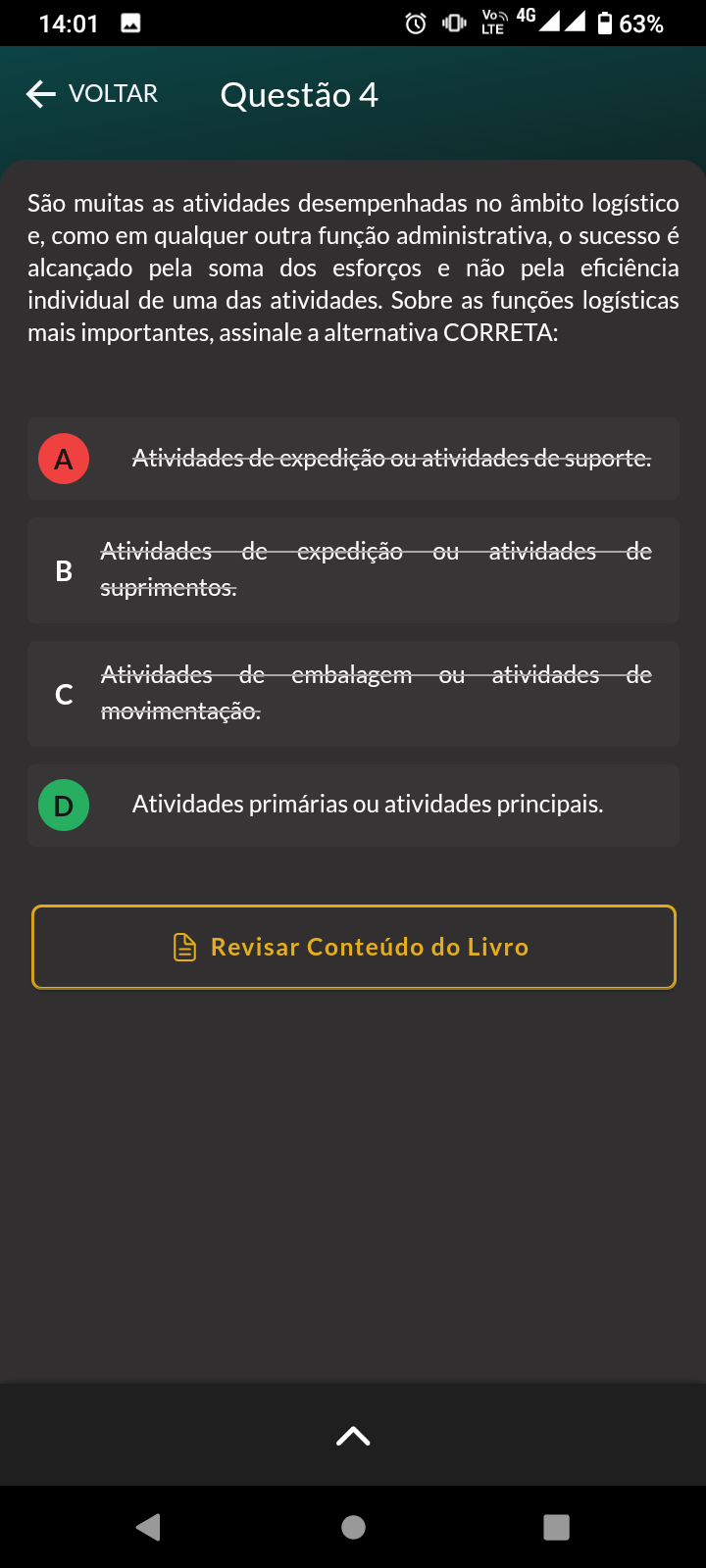 Vo 4G 14:01 LTE 63% VOLTAR Questão 4 São muitas as atividades desempenhadas no âmbito logístico e, como em qualquer outra função administrativa, sucesso é alcançado pela soma dos esforços e não pela eficiência individual de uma das atividades. Sobre as funções logísticas mais importantes, assinale a alternativa CORRETA: A Atividades de expedição ou atividades de suporte. Atividades de expedição ou atividades de suprimentos. Atividades de embalagem ou atividades de movimentação. D Atividades primárias ou atividades principais. Revisar Conteúdo do Livro
