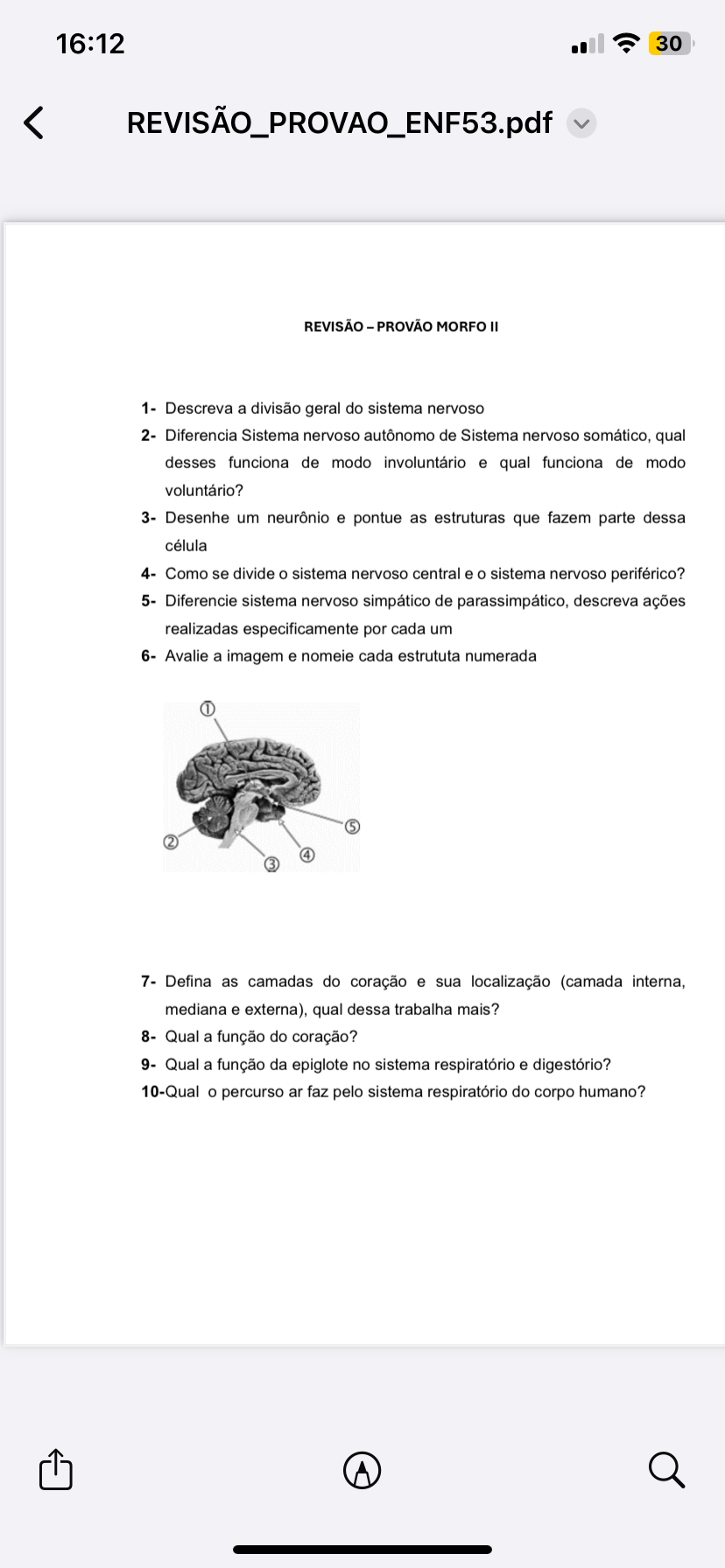 16:12 30 REVISÃO - PROVÃO MORFO II 1- Descreva a divisão geral do sistema nervoso 2- Diferencia Sistema nervoso autônomo de Sistema nervoso somático, qual desses funciona de modo involuntário e qual funciona de modo voluntário? 3- Desenhe um neurônio e pontue as estruturas que fazem parte dessa célula 4- Como se divide sistema nervoso central e sistema nervoso periférico? 5- Diferencie sistema nervoso simpático de descreva ações realizadas especificamente por cada um 6- Avalie a imagem e nomeie cada estrututa numerada 1 5 4 3 7- Defina as camadas do coração e sua localização (camada interna, mediana e externa), qual dessa trabalha mais? 8- Qual a função do coração? 9- Qual a função da epiglote no sistema respiratório e digestório? 10-Qual o percurso ar faz pelo sistema respiratório do corpo humano?