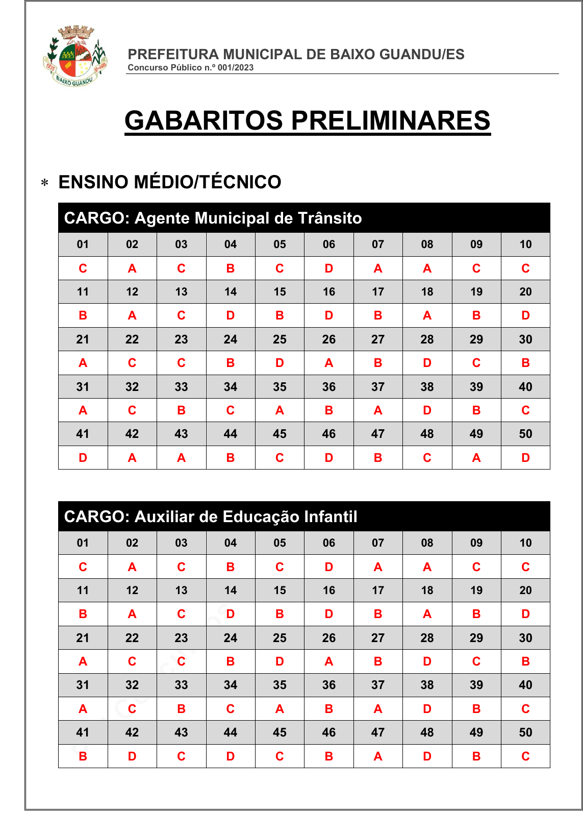 pcimarkpci MjgwNDowMzg4OjQxMzE6YTVkNTpjZDBkOjA0YjU6YzdmYTpkNzkw:V2VkLCAxNiBPY3QgMjAyNCAxNDowNTo0OCAtMDMwMA== www.pciconcursos.com.br PREFEITURA MUNICIPAL DE BAIXO GUANDU/ES Concurso Público n.º 001/2023 GABARITOS PRELIMINARES ENSINO MÉDIO/TÉCNICO CARGO: Agente Municipal de Trânsito 01 02 03 04 05 06 07 08 09 10 C A C B C D A A C C 11 12 13 14 15 16 17 18 19 20 B A C D B D B A B D 21 22 23 24 25 26 27 28 29 30 A C C B D A B D C B 31 32 33 34 35 36 37 38 39 40 A C B C A B A D B C 41 42 43 44 45 46 47 48 49 50 D A A B C D B C A D CARGO: Auxiliar de Educação Infantil 01 02 03 04 05 06 07 08 09 10 C A C B C D A A C C 11 12 13 14 15 16 17 18 19 20 B A C D B D B A B D 21 22 23 24 25 26 27 28 29 30 A C C B D A B D C B 31 32 33 34 35 36 37 38 39 40 A C B C A B A D B C 41 42 43 44 45 46 47 48 49 50 B D C D C B A D B C pcimarkpci MjgwNDowMzg4OjQxMzE6YTVkNTpjZDBkOjA0YjU6YzdmYTpkNzkw:V2VkLCAxNiBPY3QgMjAyNCAxNDowNTo0OCAtMDMwMA== www.pciconcursos.com.br PREFEITURA MUNICIPAL DE BAIXO GUANDU/ES Concurso Público n.º 001/2023 CARGO: Cuidador 01 02 03 04 05 06 07 08 09 10 C A C B C D A A C C 11 12 13 14 15 16 17 18 19 20 B A C D B D B A B D 21 22 23 24 25 26 27 28 29 30 A C C B D A B D C B 31 32 33 34 35 36 37 38 39 40 A C B C A B A D B C 41 42 43 44 45 46 47 48 49 50 C B D B C A B D C A CARGO: Escriturário 01 02 03 04 05 06 07 08 09 10 C A C B C D A A C C 11 12 13 14 15 16 17 18 19 20 B A C D B D B A B D 21 22 23 24 25 26 27 28 29 30 A C C B D A B D C B 31 32 33 34 35 36 37 38 39 40 A C B C A B A D B C 41 42 43 44 45 46 47 48 49 50 B D A A C A C D B C pcimarkpci MjgwNDowMzg4OjQxMzE6YTVkNTpjZDBkOjA0YjU6YzdmYTpkNzkw:V2VkLCAxNiBPY3QgMjAyNCAxNDowNTo0OCAtMDMwMA== www.pciconcursos.com.br PREFEITURA MUNICIPAL DE BAIXO GUANDU/ES Concurso Público n.º 001/2023 CARGO: Oficial Administrativo 01 02 03 04 05 06 07 08 09 10 C A C B C D A A C C 11 12 13 14 15 16 17 18 19 20 B A C D B D B A B D 21 22 23 24 25 26 27 28 29 30 A C C B D A B D C B 31 32 33 34 35 36 37 38 39 40 A C B C A B A D B C 41 42 43 44 45 46 47 48 49 50 C A B C D C D B A C CARGO: Secretário Escolar 01 02 03 04 05 06 07 08 09 10 C A C B C D A A C C 11 12 13 14 15 16 17 18 19 20 B A C D B D B A B D 21 22 23 24 25 26 27 28 29 30 A C C B D A B D C B 31 32 33 34 35 36 37 38 39 40 A C B C A B A D B C 41 42 43 44 45 46 47 48 49 50 A D C B C A B D A C pcimarkpci MjgwNDowMzg4OjQxMzE6YTVkNTpjZDBkOjA0YjU6YzdmYTpkNzkw:V2VkLCAxNiBPY3QgMjAyNCAxNDowNTo0OCAtMDMwMA== www.pciconcursos.com.br PREFEITURA MUNICIPAL DE BAIXO GUANDU/ES Concurso Público n.º 001/2023 CARGO: Técnico Agrícola 01 02 03 04 05 06 07 08 09 10 C A C B C D A A C C 11 12 13 14 15 16 17 18 19 20 B A C D B D B A B D 21 22 23 24 25 26 27 28 29 30 A C C B D A B D C B 31 32 33 34 35 36 37 38 39 40 A C B C A B A D B C 41 42 43 44 45 46 47 48 49 50 C D A B C A D D B B CARGO: Técnico em Contabilidade 01 02 03 04 05 06 07 08 09 10 C A C B C D A A C C 11 12 13 14 15 16 17 18 19 20 B A C D B D B A B D 21 22 23 24 25 26 27 28 29 30 A C C B D A B D C B 31 32 33 34 35 36 37 38 39 40 A C B C A B A D B C 41 42 43 44 45 46 47 48 49 50 B A B A B D B C B D pcimarkpci MjgwNDowMzg4OjQxMzE6YTVkNTpjZDBkOjA0YjU6YzdmYTpkNzkw:V2VkLCAxNiBPY3QgMjAyNCAxNDowNTo0OCAtMDMwMA== www.pciconcursos.com.br PREFEITURA MUNICIPAL DE BAIXO GUANDU/ES Concurso Público n.º 001/2023 CARGO: Técnico em Edificações 01 02 03 04 05 06 07 08 09 10 C A C B C D A A C C 11 12 13 14 15 16 17 18 19 20 B A C D B D B A B D 21 22 23 24 25 26 27 28 29 30 A C C B D A B D C B 31 32 33 34 35 36 37 38 39 40 A C B C A B A D B C 41 42 43 44 45 46 47 48 49 50 B C D A A C B A C A CARGO: Técnico em Enfermagem 01 02 03 04 05 06 07 08 09 10 C A C B C D A A C C 11 12 13 14 15 16 17 18 19 20 B A C D B D B A B D 21 22 23 24 25 26 27 28 29 30 A C C B D A B D C B 31 32 33 34 35 36 37 38 39 40 A C B C A B A D B C 41 42 43 44 45 46 47 48 49 50 A B C B C A D B D A pcimarkpci MjgwNDowMzg4OjQxMzE6YTVkNTpjZDBkOjA0YjU6YzdmYTpkNzkw:V2VkLCAxNiBPY3QgMjAyNCAxNDowNTo0OCAtMDMwMA== www.pciconcursos.com.br PREFEITURA MUNICIPAL DE BAIXO GUANDU/ES Concurso Público n.º 001/2023 CARGO: Técnico em Informática 01 02 03 04 05 06 07 08 09 10 C A C B C D A A C C 11 12 13 14 15 16 17 18 19 20 B A C D B D B A B D 21 22 23 24 25 26 27 28 29 30 A C C B D A B D C B 31 32 33 34 35 36 37 38 39 40 A C B C A B A D B C 41 42 43 44 45 46 47 48 49 50 D C A B D A C B D A CARGO: Técnico em Meio Ambiente 01 02 03 04 05 06 07 08 09 10 C A C B C D A A C C 11 12 13 14 15 16 17 18 19 20 B A C D B D B A B D 21 22 23 24 25 26 27 28 29 30 A C C B D A B D C B 31 32 33 34 35 36 37 38 39 40 A C B C A B A D B C 41 42 43 44 45 46 47 48 49 50 C B D A C B D A C D pcimarkpci MjgwNDowMzg4OjQxMzE6YTVkNTpjZDBkOjA0YjU6YzdmYTpkNzkw:V2VkLCAxNiBPY3QgMjAyNCAxNDowNTo0OCAtMDMwMA== www.pciconcursos.com.br PREFEITURA MUNICIPAL DE BAIXO GUANDU/ES Concurso Público n.º 001/2023 ATENÇÃO Conforme previsto no Edital nº 001/2023: ✓ O candidato, após a divulgação dos gabaritos oficiais preliminares da Prova Objetiva, que será feita às 19 horas do dia 19/11/2023, na página do processo seletivo acessível através do site www.idesg.org.br, poderá peticionar RECURSO à banca examinadora, quando julgar que ocorreu erro na formulação das questões e do gabarito, nos dias 20/11/2023 e 21/11/2023. ✓ Os recursos serão interpostos exclusivamente através do preenchimento de formulário digital, que estará disponível na página do processo acessível através do site www.idesg.org.br, a partir das 0h01min do dia 20/11/2023 às 23h59min do dia 21/11/2023 considerando-se o horário de Brasília observado o prazo estabelecido QUADRO I – CRONOGRAMA GERAL DE DATAS E EVENTOS DO CONCURSO PÚBLICO. ✓ As petições deverão ser elaboradas em formulário digital no site www.idesg.org.br, devendo estar MINUCIOSAMENTE fundamentadas e contendo argumentação lógica, consistente, e no caso de questões de provas, com BIBLIOGRAFIA PESQUISADA E INDICADA pelo candidato, referente a cada questão, caso contrário, serão indef