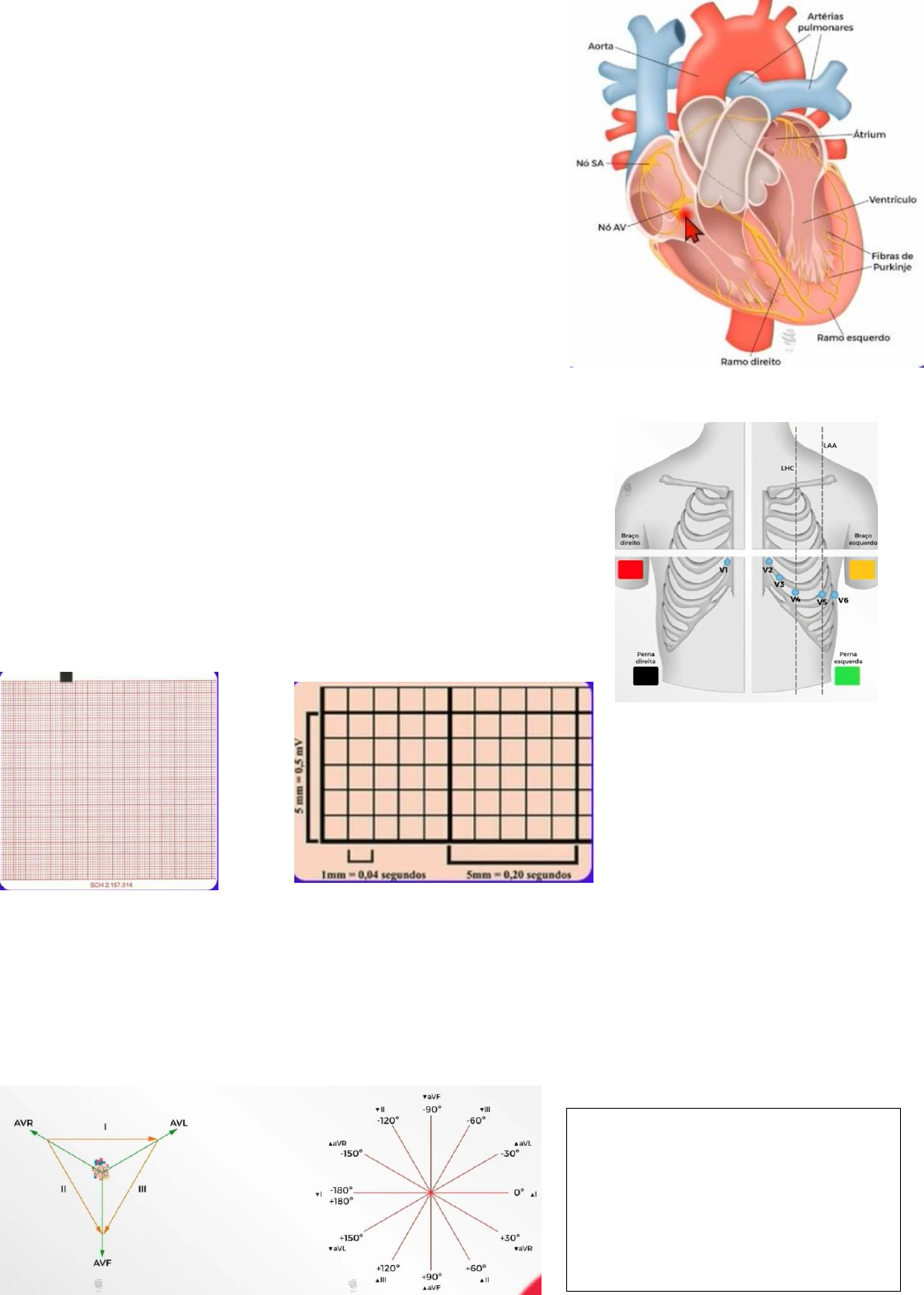 CM ECG NORMAL ANATOMIA DO SISTEMA DE CONDUÇÃO Sistema de condução (nó sinusal > nó atrioventricular > fibras de Purkinje > músculo cardíaco) o Estímulo tem início no nó sinusal/sinoatrial, passa pelos feixes internodais até o nó atrioventricular. Feixe manda o estímulo para o lado esquerdo via transeptal. Do nó atrioventricular, vai para o feixe de His, ramo direito, ramo esquerdo (se subdivide em fascículos) e fibras de Purkinje, em contato com o músculo miocárdio. Despolarizando (contraindo) o músculo cardíaco. TÉCNICA Posicionamento dos Eletrodos o Derivações Bipolares e Unipolares Membro Superior Direito (vermelho) Membro Superior Esquerdo (amarelo) Membro Inferior Direito (preto) Membro Inferior Esquerdo (verde) OBS: alguns monitores vêm com as letras (RA, LA e LL) o Derivações Precordiais V1 4º EIC paraesternal direito V2 4º EIC paraesternal esquerdo V3 distância média entre V2 e V4 V4 5º EIC esquerdo, linha hemiclavicular V5 5º EIC esquerdo, linha axilar anterior V6 5º EIC esquerdo, linha axilar média Papel o Velocidade normal = 25mm/s DERIVAÇÕES Bipolares – polo negativo e positivo o D1, D2, D3 Unipolares – polo negativo feito pelo aparelho e polo positivo nas extremidades o aVF (foot), aVR (right), aVL (left) Precordiais o V1, V2, V3, V4, V5 e V6 TRÍGONO DE EINTHOVEN Trígono de Einthoven – representação gráfica do plano bidirecional das derivações uni e bipolares, importante para o cálculo do eixo QRS, permitindo diagnóstico de algumas doenças (ex: bloqueios divisionais, sobrecarga de câmaras). DESPOLARIZAÇÃO VENTRICULAR E ATRIAL Despolarização atrial o As ondas de despolarização do átrio direito e esquerdo resultam em um vetor com orientação para baixo e para esquerda. Tal vetor, transforma-se na onda P no ECG de 12 derivações. Despolarização ventricular o O vetor da despolarização dos ventrículos resulta da soma das energias dos dois ventrículos. o Ordem de despolarização: região septal > paredes livres dos ventrículos direito e esquerdo > porções póstero-basais. o O ventrículo esquerdo apresenta musculatura maior que o lado direito, deslocando fisiologicamente a direção do vetor para a esquerda. O mesmo raciocínio se aplica quando ocorre o crescimento patológico das paredes, mudando o eixo QRS conforme o lado acometido. o Análise da despolarização ventricular no DII: Q – despolarização do septo ventricular; R – despolarização da parede livre ventricular; S – despolarização da base e parede posterior do coração. ONDAS E INTERVALOS Onda P o Representa a despolarização atrial o Positiva em D1, D2, aVF, V2-V6 o Negativa em aVR o Possui 2 componentes: Átrio direito e átrio esquerdo o Duração normal: 120 ms (3mm) o Amplitude normal: 0,25 mV (2,5mm) o Vetor entre 0 e +90° Nó sinusal gera estímulo, que passa pelo músculo, o despolarizando. Forma-se uma onda de energia, transformando-se em um vetor. Onda que representa o átrio esquerdo – vai para esquerda. Onda que representa átrio direito – vai para direita e para baixo. Vetor resultante – soma da energia dos dois componentes – orientação para esquerda e para baixo. - Onda P: despolarização atrial - Complexo QRS: despolarização ventricular - Onda T: repolarização ventricular - Intervalo PR: início da onda P até início do QRS (onda Q ou onda R) - Intervalo QT: entre início do QRS e o final da onda T. - Segmento PR: intervalo entre o final da onda P e início do QRS. - Segmento ST (famoso do infarto): intervalo entre o final do QRS e início da onda T. onda P Complexo QRS o Representa a despolarização ventricular Q: Primeira deflexão negativa após onda P R: primeira deflexão positiva S: segunda deflexão negativa R’: segunda deflexão positiva (ou 1º deflexão positiva pós S) S’: segunda deflexão negativa (ou 1ª deflexão negativa pós R’) o Positivo em D1 e aVF o Eixo entre -30° e +90° o Duração: 35mm Cornell (R aVL + S V3 > 28mm) R aVL > 11mm Romhilt-Estes >5 o Amplitude diminuída (baixa voltagem) QRS