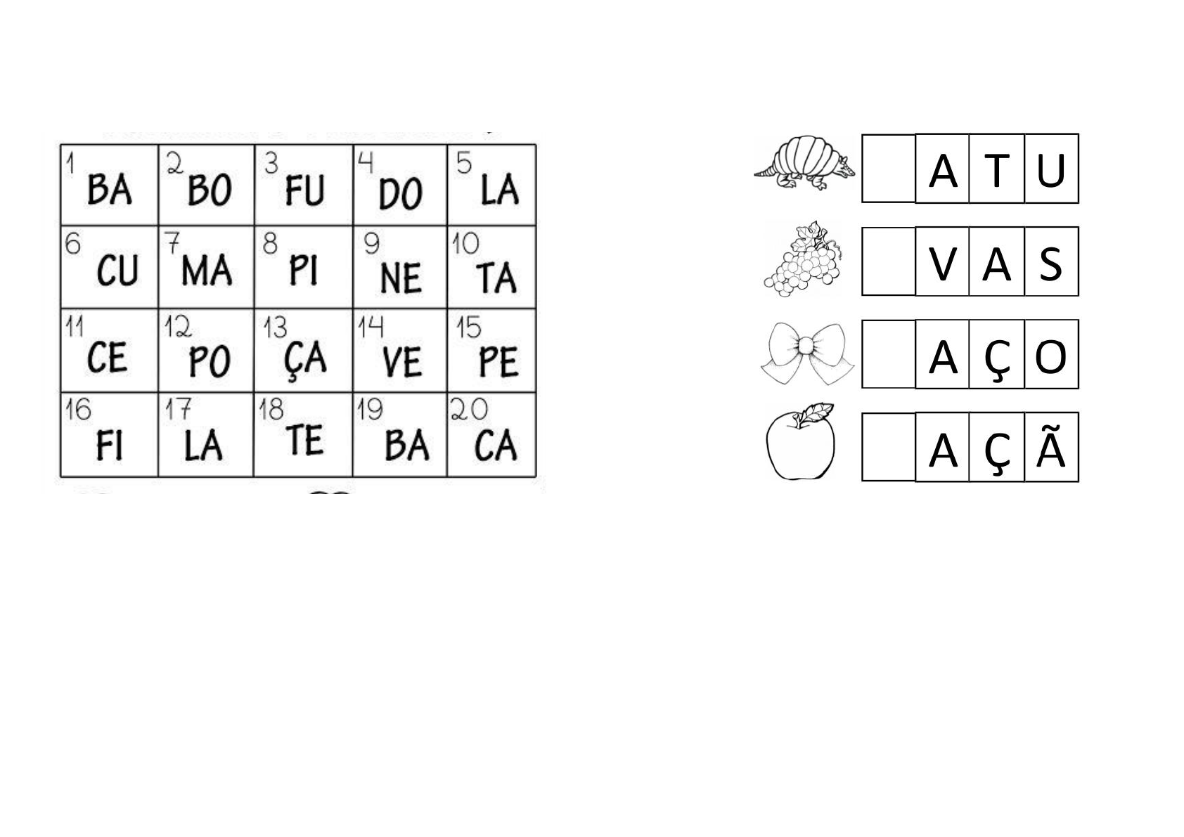 ATIVIDADE 1 ATIVIDADE 2 FORME PALAVRAS, JUNTANDO AS SÍLABAS INDICADAS ESCREVA A LETRA INICIAL DAS PALAVRAS, PRESTE ATENÇÃO PELOS NÚMEROS: AOS SONS: 1 E 5 =_________________ ATIVIDADE 3 6 e 2 =_________________ ESCREVA UMA FRASE PARA CADA PALAVRA DA ATIVIDADE 4 e 11 = _______________ ANTERIOR: 10 e 15 e 18 =________________ 1 - _____________________________________________________ 8 e 12 e 20 = _________________ 2 - _____________________________________________________ VOCÊ CONSEGUIU ACHAR OUTRAS: _________________________ 3 - ______________________________________________________ ___________________________________________________________ 4 - ______________________________________________________ ATIVIDADE 4 ATIVIDADE 5 COMPLETAR COM AS VOGAIS QUE FALTAM: PINTAR A PALAVRA CORRETA: ATIVIDADE 6 ATIVIDADE 7 RESOLVER OS CÁLCULOS: CIRCULE O NÚMERO QUE ESTÁ NO LUGAR ERRADO; ATIVIDADE 8 ATIVIDADE 9 LIGAR PINTAR AS PEÇAS DO MATERIAL DOURADO CONFORME O NÚMERO EM DESTAQUE:
