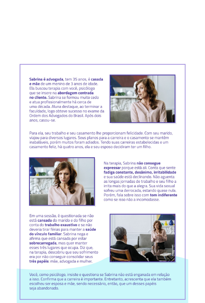 Gabarito Unidade A terapia não diretiva de Carl Rogers Desafio A abordagem centrada no cliente tem como um de seus princípios a não direcionalidade, que incide no fato de não direcionar a percepção do cliente a partir de uma interpretação do psicólogo, já que qualquer interpretação é sempre parcial. De acordo com essa abordagem psicoterápica, a pessoa é um organismo unitário, de modo que todas as suas vivências se relacionam, propiciando ao indivíduo uma imagem de si próprio. Uma situação muito nova, seja ela casual ou planejada, tende a ir de encontro a essa imagem pessoal e criar um paralelo em sua experiência, isto é, algo dela que não parece pertencer a ela própria. A isso o psicólogo rogeriano chama de incongruência. Com base no contexto, responda as seguintes perguntas: a) Em que pontos da vivência de Sabrina está a sua incongruência? b) Após essa sessão, você reflete sobre seu andamento e sua atuação como terapeuta. Essa reflexão, importantíssima a todo psicólogo, leva você a se perguntar o seguinte: minha atuação neste diálogo parece estar correta ou incorreta? Por quê? c) Qual intervenção você considera que seria mais adequada de acordo com os preceitos da terapia centrada no cliente? Padrão de resposta esperado a) Sendo a incongruência o processo pelo qual a pessoa sofre por conta de não mais identificar seu self com suas vivências, pode-se supor que ela se dá justamente pela aparição de uma terceira pessoa, isto é, a mãe. O self de Sabrina encontrava-se fortemente consolidado com as instâncias de advogada e esposa, mas, ao surgir essa terceira exigência, a da maternidade, seu self integrado em uma unidade não conseguiu se adaptar a essa nova vivência. Todo o self se modificou com a vinda do filho e ela ainda não consegue se relacionar de maneira fluida com essa nova experiência. b) A atuação, como psicólogo, neste diálogo está incorreta. O terapeuta abdicou da neutralidade e da não diretividade de sua atitude terapêutica. Ele sugere um significado para a vivência de Sabrina, ao que ela responde de forma educada, mas negativa. Entretanto, o psicólogo parece colocar seus próprios valores em jogo, contrapondo-os aos da cliente diante de sua experiência pessoal. c) Essa intervenção está destoante do método rogeriano. O ideal seria questioná-la empaticamente a fim de que sua situação se abrisse aos olhos da paciente. Ela parece já estar ciente de que seu cansaço acontece por conta de estar sobrecarregada com muitas responsabilidades, algo que descobriu sem condicionamento por parte do terapeuta. Mais correto pareceria interrogar o que, para Sabrina, seria o mais correto fazer para que consiga recuperar suas forças. Também seria interessante investigar se ela consegue aceitar esse cansaço com responsabilidade com o intuito de tomar consciência das limitações de seu corpo e de seu tempo. O que ela descobrisse em seguida poderia oferecer novos caminhos para a terapia, desde conciliar os espaços que ocupa até separá-los – caso opte por isso –, para conseguir o tempo necessário para se reestabelecer em sua singularidade. Exercícios 1. Em meados do século XX, Carl Rogers atuava como psicólogo clínico. Essa experiência lhe permitiu observar a relação terapêutica e a maneira como o terapeuta deve atuar de forma ideal. Com as observações que colheu da própria experiência, pôde criar o método inicialmente chamado de não diretivo. Observe as proposições a seguir: I. O objetivo da não diretividade da atuação terapêutica é permitir ao paciente expressar-se por si mesmo e a partir de sua própria experiência, sem a necessidade da interpretação de outra pessoa para compreender suas vivências. II. A abordagem não diretiva leva em consideração a capacidade própria de cada ser humano de encontrar as respostas para suas questões, não importando quão imbricadas e complexas elas são. III. Ao propor uma abordagem não diretiva, Carl Rogers estava sendo revolucionário dentro do campo da psicologia, pois, em geral, a atuação terapêutica centrava-se em aconselhamentos. Assinale a alternativa que aponta a(s) proposição(ões) corretas. D. I, II e III. 2. O psicólogo deve exprimir consideração positiva incondicional, admitindo os sofrimentos e as histórias do cliente, não os contestando ou julgando com seus próprios valores. Sobre a consideração positiva e a empatia, assinale a alternativa correta. C. A postura neutra do psicólogo é uma base da consideração positiva, aproximando-se do que o cliente sente. Buscando a compreensão disso, o psicoterapeuta evita a objeção com base nos seus próprios valores. 3. Uma das diretrizes para que a abordagem centrada no cliente seja efetiva é que uma das partes, o cliente, apresente incongruência em sua personalidade, isto é, que o indivíduo se encontre em estado de vulnerabilidade ou ansiedade. Sobre o conceito de incongruência, assinale a opção correta. C. O indivíduo é um organismo total e indivisível, orgânica e psicologicamente, integrando-se em uma estrutura de self. Esse self é construído e reconstruído no decorrer da vida. Entretanto, algumas vivências são tão estressantes e contrárias a essa estrutura que o indivíduo tem dificuldades para integrá-las na organização funcional de seu self. Isso gera vulnerabilidade e sofrimento. É o que se entende por incongruência. 4. A prática clínica centrada na pessoa foi desenvolvida por Carl Rogers com base na metodologia de seus estudos sobre como a subjetividade e a individualidade do cliente intercedem na psicoterapia e como a execução tomada pelo terapeuta direciona o resultado dela. De acordo com as práticas da clínica centrada na pessoa, analise as seguintes proposições: I. Os conflitos pessoais do cliente são provenientes de sua relação com os outros e com o mundo, o que implica uma visão subjetiva, pessoal e, portanto, única de cada p