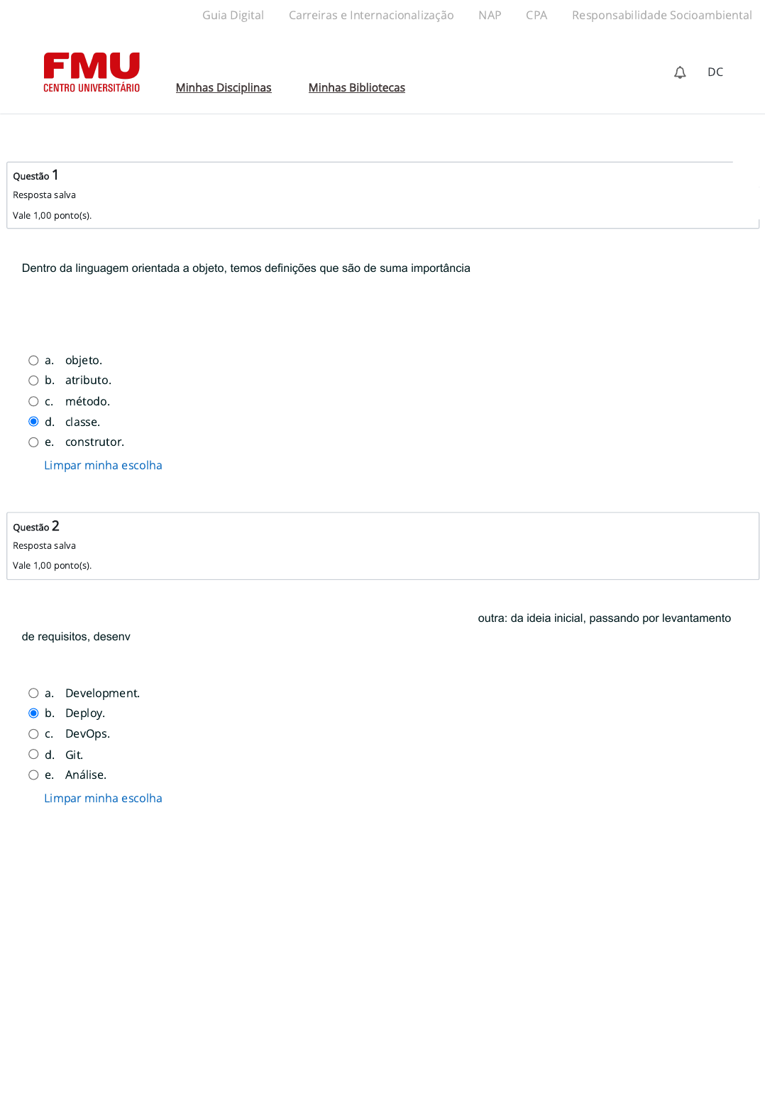 13/12/2023, 13:42 N2 (A5) https://ambienteacademico.com.br/mod/quiz/attempt.php 1/6 Questão 1 Resposta salva Vale 1,00 ponto(s). Questão 2 Resposta salva Vale 1,00 ponto(s). Dentro da linguagem orientada a objeto, temos definições que são de suma importância. Entre elas, temos uma definição em que contém a representação de dados, atributos, métodos, rotina que o processam, assim como representa um conjunto de similaridade. Considerando o exposto acima, o conceito refere-se a: a. objeto. b. atributo. c. método. d. classe. e. construtor. Limpar minha escolha Um projeto de software passa por diferentes fases, em que cada uma é complemento da outra: da ideia inicial, passando por levantamento de requisitos, desenvolvimento, testes e implantação do sistema em si no servidor Web. A fase final de instalação e implantação do sistema é conhecida por: a. Development. b. Deploy. c. DevOps. d. Git. e. Análise. Limpar minha escolha Guia Digital Carreiras e Internacionalização NAP CPA Responsabilidade Socioambiental Minhas Disciplinas Minhas Bibliotecas DC https://codely-fmu-content.s3.amazonaws.com/Moodle/GuiaDigital/Guia+digital/index.html https://carreiras.fmu.br/ https://codely-fmu-content.s3.amazonaws.com/Moodle/NAP/inicial/nap/fmu/index.html https://codely-fmu-content.s3.amazonaws.com/Moodle/CPA/landing_CPA/index.html https://portal.fmu.br/sustentabilidade https://ambienteacademico.com.br/ https://ambienteacademico.com.br/ https://ambienteacademico.com.br/course/view.php?id=236 13/12/2023, 13:42 N2 (A5) https://ambienteacademico.com.br/mod/quiz/attempt.php 2/6 Questão 3 Resposta salva Vale 1,00 ponto(s). Questão 4 Resposta salva Vale 1,00 ponto(s). Além de serviços básicos de repositórios de arquivos, SaaS possui outros serviços em nuvem como a hospedagem de sistemas e sites para web, ofertados de maneira escalar onde o crescimento da aplicação permite que o serviço se expanda, com um aumento gradativo no valor do serviço. Assinale a alternativa que apresenta corretamente apenas empresas que oferecem esse tipo de serviços como SaaS. a. Google, Microsoft, Mitsubishi. b. Microsoft, IBM, Amazon. c. Bosch, Apple, Google. d. Amazon, Toshiba, Sony. e. Disney, Uber, Dell. Limpar minha escolha A eXtreme Programming, conhecida como XP, surgiu como uma das metodologias ágeis mais populares. É uma abordagem que busca fornecer um software de alta qualidade, de forma rápida e de maneira contínua. Desta forma, a melhoria da qualidade e a capacidade de resposta do software acontecem diante das mudanças nos requisitos do cliente. A partir do apresentado, analise as asserções a seguir e a relação proposta entre elas. I. A XP possui uma qualidade estrutural, promovendo o envolvimento de dois programadores, sem levar em conta ideias dos clientes, já que duas pessoas programando possuem uma visão diferenciada. Pois: II. Uma das características mais marcantes da XP é a programação em par, onde duas pessoas trabalham juntas no desenvolvimento, o que possibilita um melhor mecanismo para a solução de problemas. A seguir, assinale a alternativa correta. a. A asserção I é uma proposição falsa, e a II é uma proposição verdadeira. b. As asserções I e II são proposições verdadeiras, e a II é uma justi�cativa correta da I. c. As asserções I e II são proposições falsas. d. As asserções I e II são proposições verdadeiras, mas a II não é uma justi�cativa correta da I. e. A asserção I é uma proposição verdadeira, e a asserção II é uma proposição falsa. Limpar minha escolha Guia Digital Carreiras e Internacionalização NAP CPA Responsabilidade Socioambiental Minhas Disciplinas Minhas Bibliotecas DC https://codely-fmu-content.s3.amazonaws.com/Moodle/GuiaDigital/Guia+digital/index.html https://carreiras.fmu.br/ https://codely-fmu-content.s3.amazonaws.com/Moodle/NAP/inicial/nap/fmu/index.html https://codely-fmu-content.s3.amazonaws.com/Moodle/CPA/landing_CPA/index.html https://portal.fmu.br/sustentabilidade https://ambienteacademico.com.br/ https://ambienteacademico.com.br/ https://ambienteacademico.com.br/course/view.php?id=236 13/12/2023, 13:42 N2 (A5) https://ambienteacademico.com.br/mod/quiz/attempt.php 3/6 Questão 5 Resposta salva Vale 1,00 ponto(s). Questão 6 Resposta salva Vale 1,00 ponto(s). Sua metodologia consiste em que cada projeto tem seu próprio modelo exclusivo, o que resultará em uma lista de recursos. As últimas três atividades são processos iterativos curtos, com um recurso que não leva mais de duas semanas para ser construído. Assinale a alternativa que representa corretamente a metodologia ágil com as características descritas acima. a. Kanban. b. XP (eXtreme Programming). c. TDD. d. FDD (Feature-Driven Development). e. Scrum. Limpar minha escolha Um software desenvolvido para web, assim como qualquer outro, possui características importantes conhecidas como requisitos funcionais, requisitos não funcionais e regra de negócios (ou requisitos de domínio). A análise deve ocorrer de forma adequada para que futuramente evite-se possíveis problemas. Considerando os requisitos que compõem um sistema de compra de ingressos via web, em relação aos requisitos funcionais, analise as afirmativas a seguir: I - A arquitetura da aplicação será on-line, configurada num ambiente cloud. II - Nas compras realizadas pela internet, serão acrescidas a taxa de serviço. III - O sistema irá controlar a quantidade de ingressos vendidas na mesma sessão. VI - O sistema irá validar o cadastro de cliente ao realizar a compra de ingresso. Está correto o que se afirma em: a. I, II e III. b. II e III. c. III e IV. d. I e II. e. I, III e IV. Limpar minha escolha Guia Digital Carreiras e Internacionalização NAP CPA Responsabilidade Socioambiental Minhas Disciplinas Minhas Bibliotecas DC https://codely-fmu-content.s3.amazonaws.com/Moodle/GuiaDigital/Guia+digital/index.html https://carreiras.fmu.br/ https://codely-fmu-content.