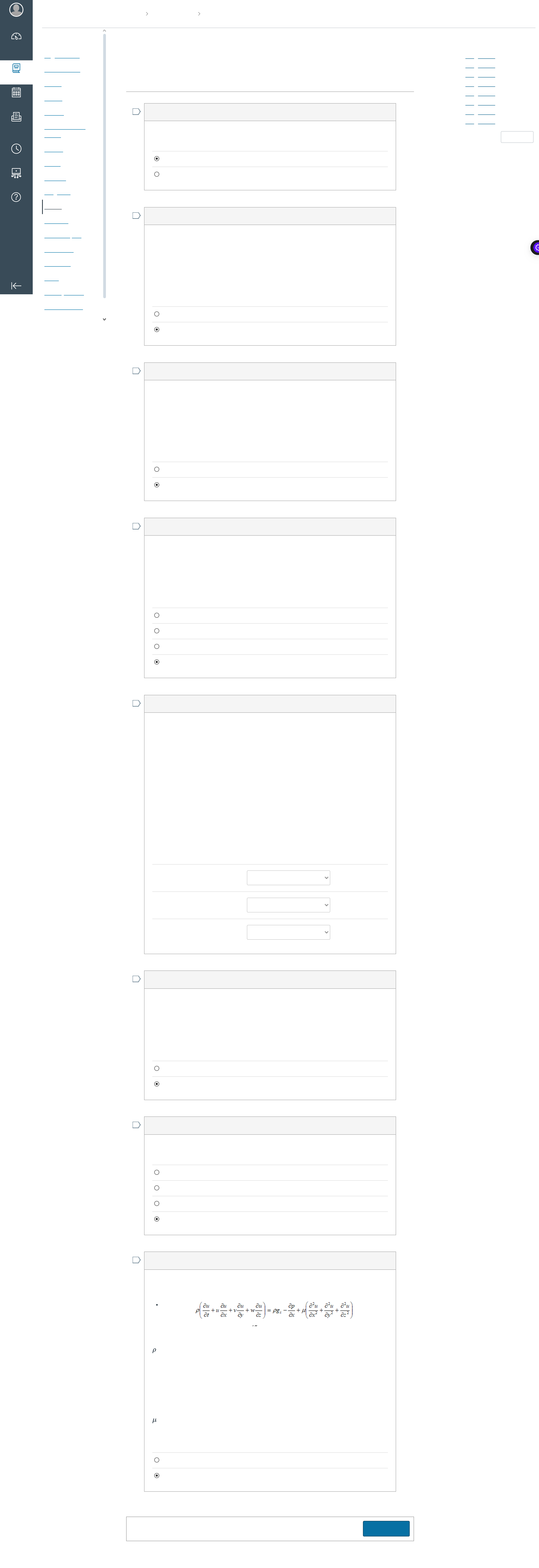 Fenômenos de Transpo… Ques�onários ATIVIDADE OBJETIVA … ATIVIDADE OBJETIVA 1_2_2024 Iniciado: 23 ago em 16:29 Instruções do teste Salvo em 16:53 0,5 ptsPergunta 1 A composição de um sistema fechado não muda. Falso Verdadeiro 0,5 ptsPergunta 2 MORAN, Michael J. SHAPIRO, Howard N.; Princípios de Termodinâmica para Engenharia. 8 ed., Rio de Janeiro: Livros Técnicos e Cien�ficos Editora Ltda, 2018. 947 p. Órgãos como o coração, que têm seu volume alterado durante o funcionamento normal, podem ser estudados como volumes de controle. Falso Verdadeiro 0,5 ptsPergunta 3 MORAN, Michael J. SHAPIRO, Howard N.; Princípios de Termodinâmica para Engenharia. 8 ed., Rio de Janeiro: Livros Técnicos e Cien�ficos Editora Ltda, 2018. 947 p. Um volume de controle é um �po especial de sistema fechado o qual não interagem de forma alguma com as vizinhanças. Verdadeiro Falso 0,5 ptsPergunta 4 MORAN, Michael J. SHAPIRO, Howard N.; Princípios de Termodinâmica para Engenharia. 8 ed., Rio de Janeiro: Livros Técnicos e Cien�ficos Editora Ltda, 2018. 947 p. Unidades SI incluem: kg, m, N K, N, s s, m, lbf K, m, s 0,5 pts MLtT Sistema Internacional de Unid FLtT Gravitacional Britânico. FMLtT Inglês de Engenharia. Pergunta 5 Correlacione a coluna da esquerda com a coluna da direita : MLtT ( ) Inglês de Engenharia. FLtT ( ) Gravitacional Britânico. FMLtT ( ) Sistema Internacional de Unidades. 0,5 ptsPergunta 6 MORAN, Michael J. SHAPIRO, Howard N.; Princípios de Termodinâmica para Engenharia. 8 ed., Rio de Janeiro: Livros Técnicos e Cien�ficos Editora Ltda, 2018. 947 p. 1 N equivale a (1 kg.m/s ), mas 1 lbf não equivale a 1 (lb.�/s )2 2 Falso Verdadeiro 0,5 ptsPergunta 7 Qual dos seguintes objetos pesa aproximadamente 1 N? um grão de arroz uma melancia grande um morango pequeno uma maçã de tamanho médio 0,5 ptsPergunta 8 A equação abaixo é dimensionalmente homogênea: Sendo: = massa específica u, v, w = componentes do vetor velocidade na direção x,y,z x, y ,z = coordenadas t = tempo p = pressão = coeficiente de viscosidade dinâmica g = gravidade na direçãox Falso Verdadeiro Enviar teste Perguntas Pergunta 1 Pergunta 2 Pergunta 3 Pergunta 4 Pergunta 5 Pergunta 6 Pergunta 7 Pergunta 8 Tempo transcorrido: Prazo da tenta�va encerrado: 25 ago em 23:59 24 Minutos, 13 Segundos Ocultar hora Graduação Presencial Assínc… Página inicial Atendimento Teams Avisos Tarefas Biblioteca PUC Minas Fóruns Notas Pessoas Programa Testes Módulos Colaborações Office 365 Medalhas Lucid Avaliação CPA PUC Carreiras Conta Painel de controle Cursos Calendário Caixa de entrada Histórico Studio Ajuda ATIVIDADE OBJETIVA 2_2_2024 Iniciado: 31 ago em 1:40 Instruções do teste Pergunta 1 0,2 pts Pergunta 2 0,2 pts FOX, Robert W.; McDONALD, Alan T.; PRITCHARD, Philip J.; Mitchell, John W. Introdução à Mecânica dos Fluidos. 9 ed., RJ: LTC, 2018. O CFD (Computational Fluid Dynamics) permite a simulação do escoamento de um fluido em diversas configurações e cenários, reduzindo, ao final, o número de testes experimentais necessários para um projeto de Engenharia. Falso Verdadeiro FOX, Robert W.; McDONALD, Alan T.; PRITCHARD, Philip J.; Mitchell, John W. Introdução à Mecânica dos Fluidos. 9 ed., RJ: LTC, 2018. Uma placa infinita é movimentada sobre uma segunda placa em uma camada de líquido, conforme mostrado no diagrama. Para um espaçamento “d” pequeno entre as placas, supõe-se uma distribuição linear de velocidades no líquido. As propriedades do fluido são coeficiente de viscosidade cinemática 0,65 cSt e densidade relativa igual a 0,88. Determinar a viscosidade absoluta do fluido em (lbf.s/ft ).2 7,39x10 lbf.s/ft-5 2 1,36x10 lbf.s/ft-2 2 1,36x10 lbf.s/ft-5 2 31/08/2024, 03:16 Teste: ATIVIDADE OBJETIVA 2_2_2024 https://pucminas.instructure.com/courses/217501/quizzes/506612/take 1/8 Pergunta 3 0,2 pts Pergunta 4 0,2 pts Pergunta 5 0,2 pts 7,39x10 lbf.s/ft-7 2 FOX, Robert W.; McDONALD, Alan T.; PRITCHARD, Philip J.; Mitchell, John W. Introdução à Mecânica dos Fluidos. 9 ed., RJ: LTC, 2018. Um fio magnético deve ser recoberto com verniz para fins de isolamento, puxando-o através de um orifício circular de 0,9 mm de diâmetro. O diâmetro do fio é de 0,8 mm e está centrado no orifício. O verniz (m = 20 centipoise) enche completamente o espaço entre o fio e as paredes do orifício, que tem um comprimento (profundidade) de 20 mm. O fio é puxado através do orifício a uma velocidade de 50 m/s. Determinar a força requerida para puxar o fio em (N). 0,101 N 1,01 N 10,1 N 9,908 N Quando a água se congela, seu volume: Fica instável. Diminui. Aumenta. Não se altera. A massa específica do mercúrio é 13550 kg/m . Determinar o peso específico, em N/m , na Terra e na Lua (g = 1,67 m/s ). Determinar a densidade relativa e o volume específico, em m /kg. 3 3 2 3 13550; 8113,77; 7,38.10 ; 13,55-5 31/08/2024, 03:16 Teste: ATIVIDADE OBJETIVA 2_2_2024 https://pucminas.instructure.com/courses/217501/quizzes/506612/take 2/8 Pergunta 6 0,2 pts Pergunta 7 0,2 pts 132925,5; 8113,77; 13,55; 7,38.10-5 8113,77; 13550; 7,38.10 ; 13,55-5 132925,5; 22628,5; 13,55; 7,38.10-5 Um eixo de 7,62 cm de diâmetro escorrega com 0,12 m/s dentro de uma bucha de comprimento 20,32 cm e com folga radial 0,008 cm, conforme figura abaixo, quando uma força de 9,08 kgf é aplicada. Determinar a viscosidade absoluta do fluido entre o eixo e a bucha em (poise). Considere o perfil de velocidade linear. 0,12208 poise 1,2208 poise 122,08 poise 12,208 poise A correia na figura, move-se a uma velocidade constante e desliza na parte superior de um tanque de óleo de viscosidade m, como mostra a figura abaixo. Considerando uma distribuição linear de velocidade no óleo, determinar a potência P necessária para acionamento da correia, em (W), se ela move a 2,5 m/s em óleo SAE30W a 20° (viscosidade dinâmica igual a 0,29 Pa.s), com L = 2 m; b = 60 cm e h = 3 cm. 31/08/2024, 03:16 Teste: AT