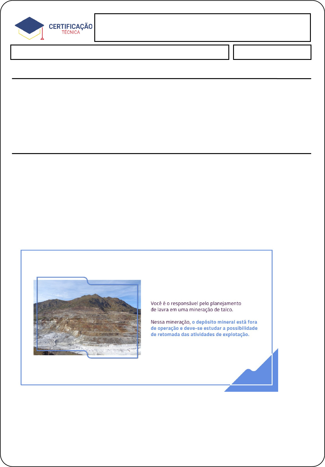 Topografia de Minas - sg Aluno (a): Tiago Soares Marinho Data:30/09/2024 Na mineração, é essencial a constante busca pelo aumento da produtividade nas operações unitárias e redução de custos de produção. Esses objetivos são alcançados a partir da utilização de ferramentas e métodos que auxiliem a tomada de decisão nas rotinas de trabalho dos diversos setores do processo produtivo dessa indústria, que abrangem desde a pesquisa mineral, o planejamento das atividades e controle das operações unitárias inerentes ao ciclo produtivo mineral até o monitoramento das áreas mineradas. Imagine que você atua como engenheiro de minas. Nesse contexto, o que você faria para planejar a retomada das operações de lavra? Justifique sua resposta e apresente como você desenvolveria a solução. Resposta: 1. Avaliação do Depósito Mineral: Primeiro, eu realizaria uma avaliação completa do depósito mineral para entender a quantidade e a qualidade do talco disponível. Isso envolveria a coleta e análise de amostras do depósito. 2. Estudo de Viabilidade: Em seguida, eu conduziria um estudo de viabilidade para determinar se a retomada das operações de mineração seria economicamente viável. Isso incluiria a análise dos custos de produção, preços de mercado do talco, demanda esperada e possíveis receitas. 3. Planejamento da Lavra: Com base nos resultados do estudo de viabilidade, eu desenvolveria um plano de lavra detalhado. Isso incluiria a definição das técnicas de mineração a serem utilizadas, o sequenciamento das operações de mineração e a estimativa dos recursos necessários. 4. Gestão Ambiental: Eu também desenvolveria um plano de gestão ambiental para minimizar o impacto das operações de mineração no meio ambiente. Isso incluiria medidas para prevenir a poluição, proteger a biodiversidade local e recuperar a área após a conclusão das operações de mineração. 5. Segurança e Saúde Ocupacional: Por fim, eu implementaria medidas para garantir a segurança e a saúde dos trabalhadores. Isso incluiria a formação de uma equipe de segurança, a implementação de protocolos de segurança e a realização de treinamentos regulares de segurança. Esses passos ajudariam a garantir que a retomada das operações de mineração seja realizada de maneira eficiente, rentável e sustentável. image1.png image2.jpeg