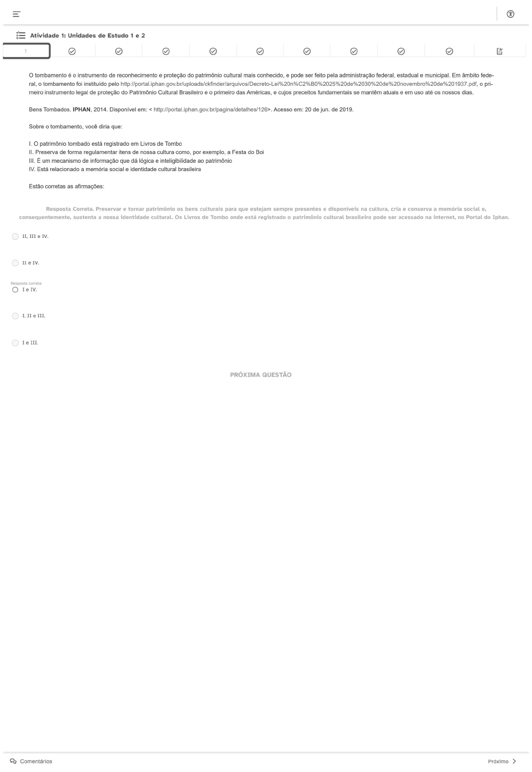 Atividade 1: Unidades de Estudo 1 e 2 1 o tombamento é o instrumento de reconhecimento e proteção do patrimônio cultural mais conhecido, e pode ser feito pela administração federal, estadual e municipal. Em âmbito fede- ral, tombamento pri- meiro instrumento legal de proteção do Patrimônio Cultural Brasileiro e o primeiro das Américas, e cujos preceitos fundamentais se mantêm atuais e em uso até os nossos Bens IPHAN, 2014. Disponível em:Atividade 1: Unidades de Estudo 1 e 2 2 termo "raça" vem do latim ratio, que significa categoria, espécie ou tipo. Desde a antiguidade, na história das ciências naturais, raça é o conceito utilizado pra classificar as espé- cies animais e vegetais. Durante a Idade Média, o termo começa a ser utilizado para classificar a diversidade humana em grupos fisicamente diferentes, designando, também, a descendência, e identificando um grupo que tinha um antepassado compartilhado e que, por isso, mantinha características físicas em comum (LÉVI-STRAUSS, 1973). LAAI, T. Antropologia e Cultura Brasileira. Capítulo 2 Foram consequências do conceito de raça humana: I. Os nobres se considerarem superiores aos que pertenciam a outras classes sociais porque possuíam "sangue puro". II. A evolução dos seres humanos dividida em: selvageria, barbarismo e civilização. III. Os gauleses se considerarem superiores aos francos e, por isso, terem o direito de IV. o surgimento de "novos humanos" com habilidades cognitivas especiais. Selecione a alternativa que aponta os itens corretos: Resposta Correta. Os nobres se consideravam superiores por serem descendentes dos Francos e acreditavam ter habilidades e aptidões para reinar.Já a Antropologia evolutiva, colocava a evolução como uma linha que partia da selvageria e chegava a civilização. III e IV. II e IV. I. III IV. I, II III. Resposta correta II. PRÓXIMA QUESTÃO Comentários Próximo >* Atividade 1: Unidade Resposta correta e 2 3 É comum, no entanto, pensamos nos índios de forma genérica, como um ser humano que vive nu na mata, caça com arco e flechas, mora em come mandioca, cultua e fala Tupi. na realidade, o termo "índio" é definido em oposição a Esse ideal do senso comum não existe, sendo que o que temos são diversas etnias com suas próprias costumes e visões de mundo, como os bororós, os pataxós e os xavantes. LAAI, T. Antropologia e Cultura Brasileira. Capítulo Considere as asserções abaixo e a relação proposta entre elas. I. A representatividade das culturas indígenas nas artes e no entretenimento está, na maioria das vezes, vinculada a um passado colonial idealizado. PORQUE II. Atualmente, segundo a o índio é um cidadão brasileiro, pertencente a minoria étnica, com seus costumes e valores. É correto afirmar que: Resposta Correta. A representatividade e O conhecimento da cultura são pequenos devido a qualidade ruim e pequena quantidade de exposição na As asserções I II são proposições Resposta correta As asserções I e II são proposições verdadeiras, mas a II não é uma justificativa correta da I. As asserções I II são proposições verdadeiras, e a II é uma justificativa correta da I. A asserção I é uma proposição falsa, e a II é uma proposição verdadeira. A asserção é uma proposição verdadeira, e a II é uma proposição falsa. PRÓXIMA QUESTÃO Comentários Próximo >* Atividade 1: Unidades de Estudo 1 e 2 4 A Antropologia e a História questionam a noção de descobrimento, uma vez que o território brasileiro já era habitando antes da chegada dos Nesse sentido, pode- mos dizer que ocorreu uma invasão, seguida de uma conquista. Isso porque a conquista do continente americano revelou aos europeus a existência de uma população até então desconhecida. LAAI, T. Antropologia e Cultura Brasileira. Capítulo 2 (Apostila) Avalie as afirmações abaixo: I. A população indígena brasileira sofreu a perda de sua cultura devido a processos de subordinação aos portugueses, no século XVI. II. No século XX, a convivência entre índios nativos e invasores portugueses tornou-se amigável. III. Estudos sobre a demografia indígena indicam que antes do descobrimento existiam mais de mil povos indígenas e hoje existem 227 etnias. IV. Independente das boas condições oferecidas pelas cidades é insignificante o número de indígenas que migram. Resposta Correta. Com a chegada dos portugueses, a população sofreu a perda de sua cultura em função dos processos de subordinação e doutrinação religiosa. Com passar do tempo a população indigena continuou diminuindo em nosso país, além da redução na quantidade de povos houve grande redução no número deles. IV. II IV. IV. II III. Resposta correta III. PRÓXIMA QUESTÃO Comentários Próximo >Atividade 1: Unidades de Estudo 1 e 2 5 Para Ribeiro (1977), o impacto da civilização europeia sobre as populações indígenas foram uma "transfiguração étnica" na medida em que não houve exatamente uma assimila- ção cultural ou uma aculturação, pois muitos grupos foram exterminados e os que sobreviveram não foram em nenhum momento devidamente absorvidos pela sociedade Com isso, os índios fazem parte do imagi- nário da identidade nacional miscigenada, mas ainda lutam por seus LAAI, T. Antropologia e Cultura Brasileira. Capítulo 2.(Apostila) Considere as asserções abaixo e a relação proposta entre elas. I. Os indígenas no Brasil se tornaram escravos, servos, foram ignorados e, muito recentemente, receberam autonomia, mas são pobres e desprovidos de direitos. PORQUE II. Os portugueses jamais consideraram ou trataram as populações indígenas como nações. É correto afirmar que: Resposta Correta. Os no Brasil se tornaram escravos, servos, foram ignorados e, muito recentemente, receberam autonomia, mas ainda são pobres e desprovidos de direitos. Isso porque os portugueses jamais consideraram ou trataram as populações como nações e sim, como "[...] vassalos, h