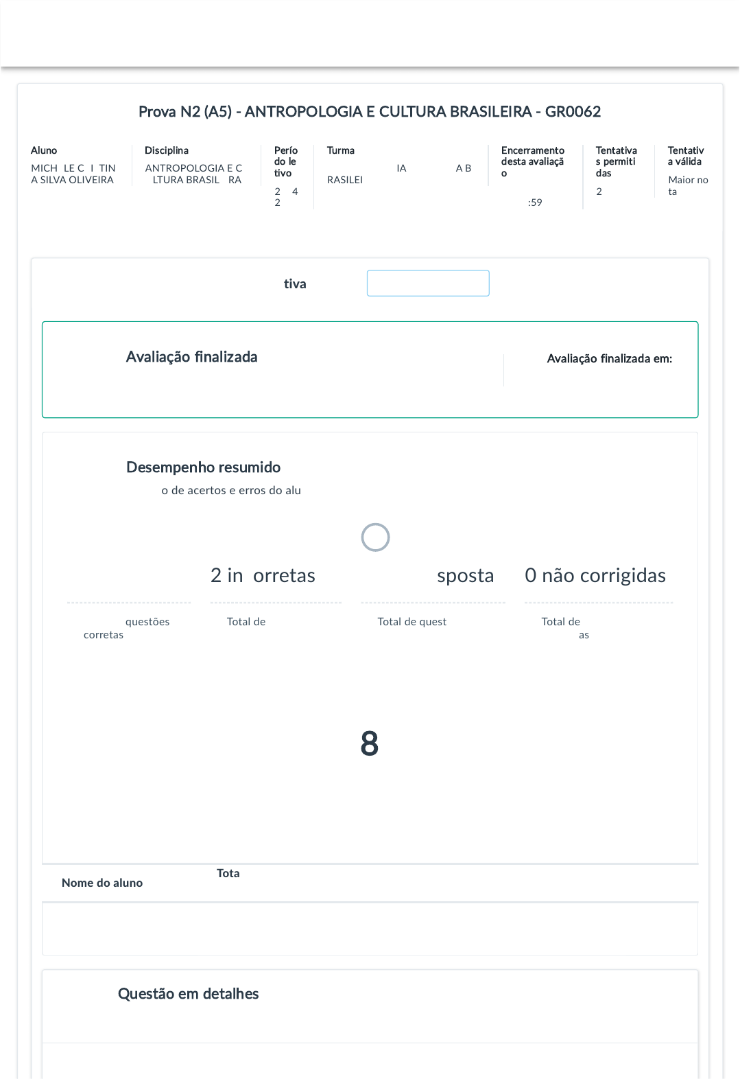 Respostas Desempenho do aluno Prova N2 (A5) - ANTROPOLOGIA E CULTURA BRASILEIRA - GR0062 Aluno MICHELE CRISTIN A SILVA OLIVEIRA Disciplina ANTROPOLOGIA E C ULTURA BRASILEIRA Perío do le tivo 2024 2 Turma ANTROPOLOGIA E CULTURA B RASILEIRA (242GGR0062A) Encerramento desta avaliaçã o 14/12/2024 - 23:59:59 Tentativa s permiti das 2 Tentativ a válida Maior no ta Tentativa 1 de 1 Avaliação finalizada Resultado final Avaliação finalizada em: 12/12/2024 - 09:29:38 Desempenho resumido Resumo de acertos e erros do aluno 8 corretas Total de questões corretas 2 incorretas Total de questões incorretas 0 sem resposta Total de questões sem resposta 0 não corrigidas Total de questões não corrigidas Nome do aluno Total de questões Questões objetivas Acertos em objetivas Valor da avaliação Nota final MICHELE CRISTINA SILVA OLIVEIRA 10 10 8 10 8 Tentativa válida 8 Nota final Questão em detalhes Gabarito e respostas das questões michele.oliveira Lápis michele.oliveira Lápis [...] Uma sociedade moderna, complexa e heterogênea como a brasileira se caracteriza por abrigar, em relativa harmonia, diversas tradições e diferentes visões de mundo. Assim, a existência desse complexo sociocultural abrangente está vinculado à ideia de nação, por isso, existe uma política cultural de Estado. Com isso, na medida em que o Brasil se considera um país democrático e pluralista, tais políticas se preocupam com a preservação de nossos patrimônios histórico, artístico e cultural, e, consequentemente, da memória social do país. [...] No Brasil, a proteção do patrimônio cultural está prevista na Constituição Federal. Em termos oficiais, os órgãos do Estado responsáveis pelo estudo, pela proteção e pela divulgação do que se refere aos patrimônios culturais são a Comissão Nacional de Folclore e o Instituto do Patrimônio Histórico e Artístico Nacional. [...] LAAI, T. Antropologia e Cultura Brasileira. Capítulo 2.(Apostila) Considere as asserções abaixo e a relação proposta entre elas. I. A antropologia utiliza-se apenas de documentação histórica ao estudar grupos sociais marginalizados. PORQUE II. Existem políticas públicas para preservar memórias que fazem parte de nosso patrimônio cultural. É correto afirmar que: D A asserção I é uma proposição falsa, e a II é uma proposição verdadeira. Resposta correta Questão 1: [...] Uma sociedade moderna, complexa e heterogênea como a brasileira se ... Questão obje�va 1 /1 A As asserções I e II são proposições verdadeiras, e a II é uma justificativa correta da I. B As asserções I e II são proposições verdadeiras, mas a II não é uma justificativa correta da I. C A asserção I é uma proposição verdadeira, e a II é uma proposição falsa. E As asserções I e II são proposições falsas. [...] Ainda conforme a autora, estereótipos como da "mulher negra sensual" ou do "fiel empregado negro" são uma constante nas telenovelas brasileiras, de maneira que reforçam certas percepções estereotipadas da realidade social, enfatizando uma extrema sexualização ou uma obediência servil. SCHIMITT, M. Antropologia e Cultura Brasileira. Capítulo 3. (Apostila) Considere o texto e seus estudos anteriores e analise as afirmações abaixo: I. Os meios de comunicação através, por exemplo, das novelas reforçam o preconceito racial. II. Os meios de comunicação não mostram afrodescendentes em posição de destaque por ser algo que não existe em nossa sociedade. III. O documentário "A negação do Brasil: o negro na telenovela brasileira", mostra a mídia buscando valorizar a posição do negro. IV. Nas telenovelas os personagens negros são considerados "personagens soltos" pois não possuem sua própria história. É correto afirmar que: A I e IV. Resposta correta Questão 2: [...] Ainda conforme a autora, estereó�pos como da \"mulher negra sensual\" ou... Questão obje�va 1 /1 B II e IV. C I e III. D II e III. E III e IV. [...] A primeira versão do documento foi apresentada em 1946, na I Assembleia Geral da ONU, ficando a cargo da Comissão de Direitos Humanos elaborar, a partir disso, um esboço preliminar da Declaração Universal dos Direitos Humanos (DUDH). Assim, o primeiro rascunho do documento que hoje conhecemos foi apresentado em setembro de 1948, ratificado em 10 de dezembro do mesmo ano, tendo participado da elaboração mais de 50 países. Isso se deu pelos efeitos devastadores da Segunda Guerra Mundial. Para além desse documento, o que hoje entendemos como direitos humanos foi consolidado a partir do século XVIII, época em que ocorria a Revolução Francesa. SCHIMITT, M. Antropologia e Cultura Brasileira. Capítulo 4. Disponível na Biblioteca Virtual. Sobre os Direitos Humanos, é correto dizer que: Questão 3: [...] A primeira versão do documento foi apresentada em 1946, na I Assembleia... Questão obje�va 1 /1 A A discussão sobre direitos humanos teve seu início simultâneo a DUHU. C Segundo a ONU os direitos humanos são fundados sobre o respeito pela dignidade e valor de cada pessoa Resposta correta B Existe um rol de direitos humanos e alguns deles devem, obrigatoriamente, ser respeitados. D A primeira versão do documento sobre os direitos humanos foi elaborada pelas lideranças norte americanas E Em alguns capítulos, os direitos humanos preveem a interferência do Estado na vida dos cidadãos. É possível afirmar que os meios de comunicação são representativos de parte da realidade em que vivemos. Apesar de, muitas vezes, não retratarem cenas fiéis do cotidiano de boa parte dos brasileiros, programas televisivos expressam peculiaridades de nossa sociedade. Assim, a partir do que é veiculado nas mídias, é possível construirmos uma interpretação - mesmo que parcialmente - da estrutura social em que estamos inseridos. Um exemplo disso é o que ocorre com a representação de pessoas negras em novelas, filmes e programas de entretenimento em geral. S