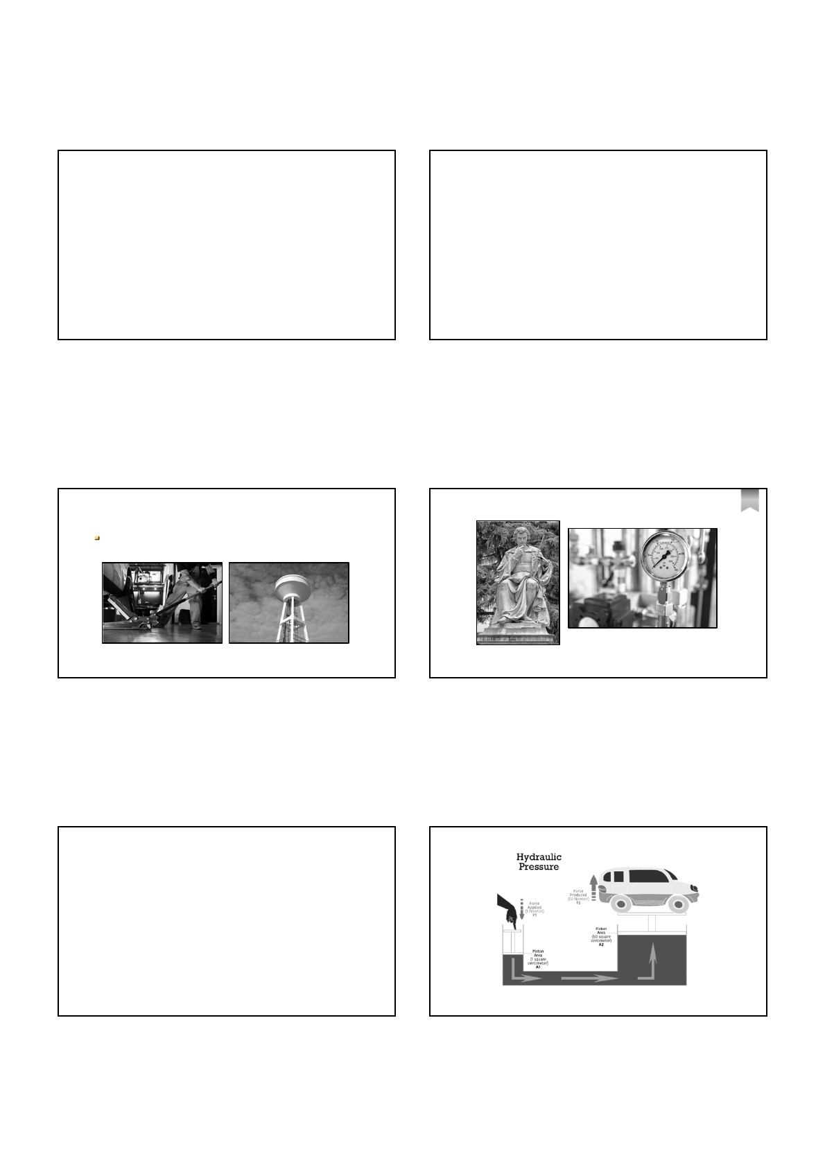 1 Profª Francielly Elizabeth de Castro Silva Mecânica dos Fluidos Aula 2 Conversa Inicial Trata das forças que atuam sobre um fluido em repouso Hidrostática Pressmaster/Shutterstock Athawit Ketsak/Shutterstock Alan.P/Shutterstock Fotogrin/Shutterstock Princípio de Pascal grayjay/Shutterstock 1 2 3 4 5 6 2 O P Z Creative/Shutterstock Pressmaster/Shutterstock Exemplo 1: considere o sistema de elevador hidráulico para elevar caixas, apresentado na figura ao lado. Sabendo que a caixa menor possui uma massa de 20 kg e que o êmbolo menor possui um diâmetro de 50 cm, determine a força transmitida à caixa maior, sabendo que ela possui uma massa de 40 kg e que o diâmetro do êmbolo maior é de 1 m. A carga da caixa menor é suficiente para elevar a caixa maior? tersetki/Shutterstock Solução Exemplo 2: considere um macaco hidráulico, como apresentado na figura ao lado, utilizado para elevar um automóvel. Sabendo que o êmbolo menor possui um diâmetro 𝐷 10 𝑚𝑚, determine a força (𝐹) necessária para elevar o carro de 1.250 kg, sabendo que o diâmetro do êmbolo maior é 𝐷 40 𝑚𝑚. (...) Fobosvobos/Shutterstock 𝐷 𝐹 𝑑 F 𝐹 𝐷 (...) Como a força é aplicada por meio de um sistema de alavanca, considere o comprimento da alavanca de 𝑐 30 𝑐𝑚, e o diâmetro do pino em que a alavanca é rotacionada para aplicação da carga é 𝑑 10 𝑚𝑚. Fobosvobos/Shutterstock 𝐷 𝐹 𝑑 F 𝐹 𝐷 Solução 7 8 9 10 11 12 3 Pressão absoluta e manométrica Alan.P/Shutterstock Sergey Merkulov/Shutterstock Evangelista Torricelli Fonte: Fox et al., 2018 Altitude geométrica (m) Temperatura (K) 𝒑/𝒑𝑵𝑴 𝝆/𝝆𝑵𝑴 -500 291,4 1,061 1,049 0 288,2 1,000a 1,000b 500 284,9 0,9421 0,9529 1000 281,7 0,8870 0,9075 1500 278,4 0,8345 0,8638 2000 275,2 0,7846 0,8217 2500 271,9 0,7372 0,7812 3000 268,7 0,6920 0,7423 3500 265,4 0,6492 0,7048 4000 262,2 0,6085 0,6689 5000 255,7 0,5334 0,6012 6000 249,2 0,4660 0,5389 7000 242,7 0,4057 0,4817 8000 236,2 0,3519 0,4292 9000 229,7 0,3040 0,3813 10.000 223,3 0,2615 0,3376 No Brasil, uma média de 40% de seu território se encontra abaixo de 200 metros, cerca de 45% fica entre 200 e 600 metros, e 12% fica entre 600 e 900 metros Campos do Jordão – São Paulo (1.620 metros) Monte Verde – Minas Gerais (1.554 metros) Senador Amaral – Minas Gerais (1.505 metros) Bom Repouso – Minas Gerais (1.360 metros) Gonçalves – Minas Gerais (1.350 metros) São Joaquim – Santa Catarina (1.350 metros) Urupema – Santa Catarina (1.335 metros) Pico da Neblina – Norte do Amazonas (2.994 metros) Pico 31 de março – Amazonas, Serra do Imeri (2.972 metros) Pico da Bandeira – Estado do Espírito Santo e Minas Gerais (2.891 metros) Pico Paraná – Paraná, Serra do mar (1.887 metros) 𝑃 ≅ 101,3 𝑘𝑃a 𝑃 ≅ 76 𝑐𝑚𝐻𝑔 𝑃 𝑧𝑒𝑟𝑜 𝑎𝑏𝑠𝑜𝑙𝑢𝑡𝑜 𝑃 𝑃 𝑧𝑒𝑟𝑜 𝑟𝑒𝑙𝑎𝑡𝑖𝑣𝑜 𝑃 𝑃 𝑃𝑟𝑒𝑠𝑠ã𝑜 𝑣𝑎𝑐𝑢𝑜𝑚é𝑡𝑟𝑖𝑐𝑎 𝑃𝑟𝑒𝑠𝑠ã𝑜 𝑚𝑎𝑛𝑜𝑚é𝑡𝑟𝑖𝑐𝑎 𝑜𝑢 𝑒𝑓𝑒𝑡𝑖𝑣𝑎 Fonte: Silva, 2022 𝑃 𝑃 𝑃 13 14 15 16 17 18 4 Fonte: Silva, 2022 pics five/Shutterstock Exemplo: suponha que a pressão do ar dentro da câmara de ar do pneu da bicicleta é de 10 psi, conforme medição no manômetro da bomba, como mostra a figura. Sabendo que a pressão atmosférica é de 101,3 kPa, determine a pressão absoluta na câmara no SI. photopixel/Shutterstock Solução: 1 𝑝𝑠𝑖 6894,76 𝑃𝑎 𝑃 𝑃 𝑃 Equação da estática dos fluidos Dudarev Mikhail/Shutterstock 𝜕𝑃 𝜕𝑦 ∆𝑦 𝐹 0 ; 𝑝 𝜕𝑃 𝜕𝑦 ∆𝑦 ∆𝐴 𝑝∆𝐴 0 𝑝∆𝐴 𝜕𝑃 𝜕𝑦 ∆𝑦∆𝐴 𝑝∆𝐴 0 𝜕𝑃 𝜕𝑦 ∆𝑦∆𝐴 0 Isso significa que, no plano horizontal, a variação da pressão é zero. Isso também ocorrerá no eixo 𝑥 ∆𝐴 𝑦 𝑧 ∆𝑦 Fonte: Silva, 2022 19 20 21 22 23 24 5 𝐹𝒛 0 ; 𝑝 𝜕𝑃 𝜕𝑧 ∆𝑧 ∆𝐴 𝛾 ∆𝐴𝑑𝑧 𝑝∆𝐴 0 𝑝∆𝐴 𝜕𝑃 𝜕𝑧 ∆𝑧∆𝐴 𝛾∆𝐴𝑑𝑧 𝑝∆𝐴 0 𝜕𝑃 𝑑𝑧 ∆𝑧∆𝐴 𝛾∆𝑧∆𝐴 → 𝑑𝑃 𝑑𝑧 𝛾 𝑑𝑃 𝛾𝑑𝑧 𝑑𝑃 𝜌𝑔𝑑𝑧 Fonte: Silva, 2022 𝑑𝑃 𝜌𝑔𝑑𝑧 𝑑𝑃 𝜌𝑔𝑑𝑧 𝑃 𝑃 𝜌𝑔 𝑧 𝑧 𝑃 𝑃 𝜌𝑔 𝑧 𝑧 𝑃 𝑃 𝜌𝑔 𝑧 𝑧 𝑃 𝑃 𝜌𝑔ℎ ou 𝑃 𝑃 𝛾ℎ Fonte: Silva, 2022 𝑃 𝑃 𝜌𝑔ℎ ou 𝑃 𝑃 𝛾ℎ Avil.pro/Shutterstock A equação nos mostra que, para qualquer ponto de um fluido, a pressão é igual à pressão no ponto zero (𝑃 ), que em geral é considerada a pressão na superfície do fluido, mais o peso da coluna de fluido sobre este ponto zero. Exemplo 1: o tanque mostrado na figura ao lado está cheio de gasolina e glicerina. Determine a pressão manométrica sobre a torneira do dreno em 𝐶 em psi. Considere 𝛾 45,3 𝑙𝑏/𝑝é𝑠³ e 𝛾 78,7 𝑙𝑏/𝑝é𝑠³. Jackeline Souza Solução: 𝑃 𝑃 𝛾ℎ Jackeline Souza 𝑃 𝑃 𝑒 / Em que 𝑅 é a constante do gás. Variação da pressão para fluidos compressíveis 25 26 27 28 29 30 6 Exemplo 2: o gás natural no tanque de armazenamento, mostrado na figura ao lado, está contido em uma membrana flexível e mantido sob pressão constante por meio de uma tampa pesada que se move à medida que o gás aumenta ou diminui dentro do tanque. Determine o peso dessa tampa sabendo que a pressão manométrica na saída do tanque em 𝐴 é igual a 600 kPa. O gás está a 20 °C. Jackeline Souza Solução PB Rildo Cardoso Fonte: Hibbeler, 2016. Gás Densidade Viscosidade dinâmica Viscosidade cinemática Constante do gás Razão do calor específico 𝝆 kg/m3 𝒖 N . s/m2 𝒗 m2/s R J/ kg . K 𝒌 𝒄𝒑/𝒄𝒗 Ar (15 ºC) 1,23 17,9 (10-6 14,6 (10-6 286,9 1,40 Oxigênio (20 ºC) 1,33 20,4 (10-6 15,2 (10-6 259,8