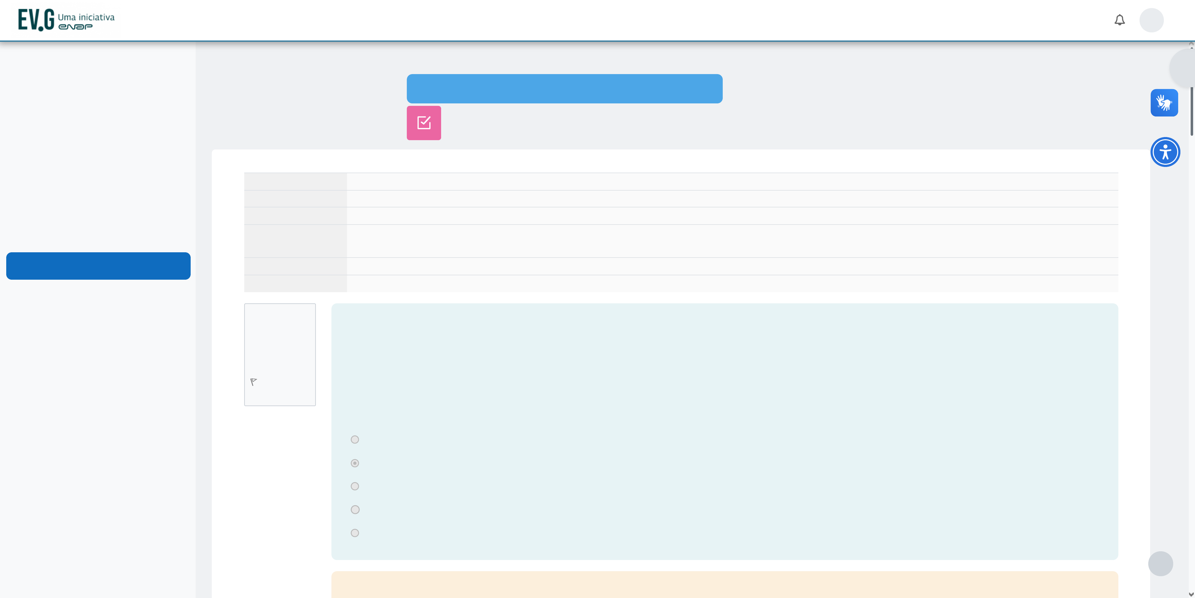 Área do Participante Guia do Participante Conteúdo em PDF Glossário Módulo 1: Conceitos iniciais… Conteúdo - Módulo 1 Exercício Avaliativo - Módulo 1 Módulo 2: Sou organizado? Conteúdo - Módulo 2 Exercício Avaliativo - Módulo 2 Módulo 3: Como (re)começ… Conteúdo - Módulo 3 Exercício Avaliativo - Módulo 3 Módulo 4: Ferramentas de … Conteúdo - Módulo 4 Exercício Avaliativo - Módulo 4 Módulo de Encerramento Avaliação de Satisfação com … Questão 1 Correto Atingiu 1,00 de 1,00 Marcar questão pop_trabalho | - Turma DEZ/2024 / Exercício Avaliativo - Módulo 1 Iniciado em terça-feira, 17 dez. 2024, 16:12 Estado Finalizada Concluída em terça-feira, 17 dez. 2024, 16:21 Tempo empregado 8 minutos 31 segundos Notas 7,00/8,00 Avaliar 30,63 de um máximo de 35,00(87,5%) QUESTIONÁRIO Exercício Avaliativo - Módulo 1 Analise as a�rmativas abaixo: Trata-se de visualizar o futuro e traçar o programa de ação. Compreende o ato de avaliar o futuro e preparar-se para ele ou mesmo criá-lo. É um processo de re�etir e tomar decisões sobre o futuro, desenvolvido para o alcance de uma situação desejada de um modo mais e�ciente, e�caz e efetivo, com a melhor concentração de esforços e recursos. Essas a�rmativas se referem a/ao: Escolha uma opção: a. Ciclo PDCA. b. Planejamento. c. Gestão do tempo. d. Planner. e. Objetivo. Todas as a�rmativas se referem à conceituação do que é planejamento, com base em: Fayol; Caravantes, G.; Caravantes, C.; Kloeckner (2005, p. 404), Maximiano (2011, p. ) li i ( ) Página inicial Painel Meus cursos Catálogo Área do aluno MB https://mooc41.escolavirtual.gov.br/course/view.php?id=8968#section-0 https://mooc41.escolavirtual.gov.br/mod/book/view.php?id=153872 https://mooc41.escolavirtual.gov.br/mod/folder/view.php?id=153873 https://mooc41.escolavirtual.gov.br/mod/glossary/view.php?id=153874 https://mooc41.escolavirtual.gov.br/course/view.php?id=8968#section-1 https://mooc41.escolavirtual.gov.br/mod/url/view.php?id=153875 https://mooc41.escolavirtual.gov.br/mod/quiz/view.php?id=153876 https://mooc41.escolavirtual.gov.br/course/view.php?id=8968#section-2 https://mooc41.escolavirtual.gov.br/mod/url/view.php?id=153877 https://mooc41.escolavirtual.gov.br/mod/quiz/view.php?id=153878 https://mooc41.escolavirtual.gov.br/course/view.php?id=8968#section-3 https://mooc41.escolavirtual.gov.br/mod/url/view.php?id=153879 https://mooc41.escolavirtual.gov.br/mod/quiz/view.php?id=153880 https://mooc41.escolavirtual.gov.br/course/view.php?id=8968#section-4 https://mooc41.escolavirtual.gov.br/mod/url/view.php?id=153881 https://mooc41.escolavirtual.gov.br/mod/quiz/view.php?id=153882 https://mooc41.escolavirtual.gov.br/course/view.php?id=8968#section-5 https://mooc41.escolavirtual.gov.br/mod/questionnaire/view.php?id=153883 https://mooc41.escolavirtual.gov.br/course/view.php?id=8968#section-1 https://mooc41.escolavirtual.gov.br/my/ https://mooc41.escolavirtual.gov.br/?redirect=0 https://mooc41.escolavirtual.gov.br/my/ https://mooc41.escolavirtual.gov.br/my/courses.php https://www.escolavirtual.gov.br/catalogo https://www.escolavirtual.gov.br/aluno/inicio