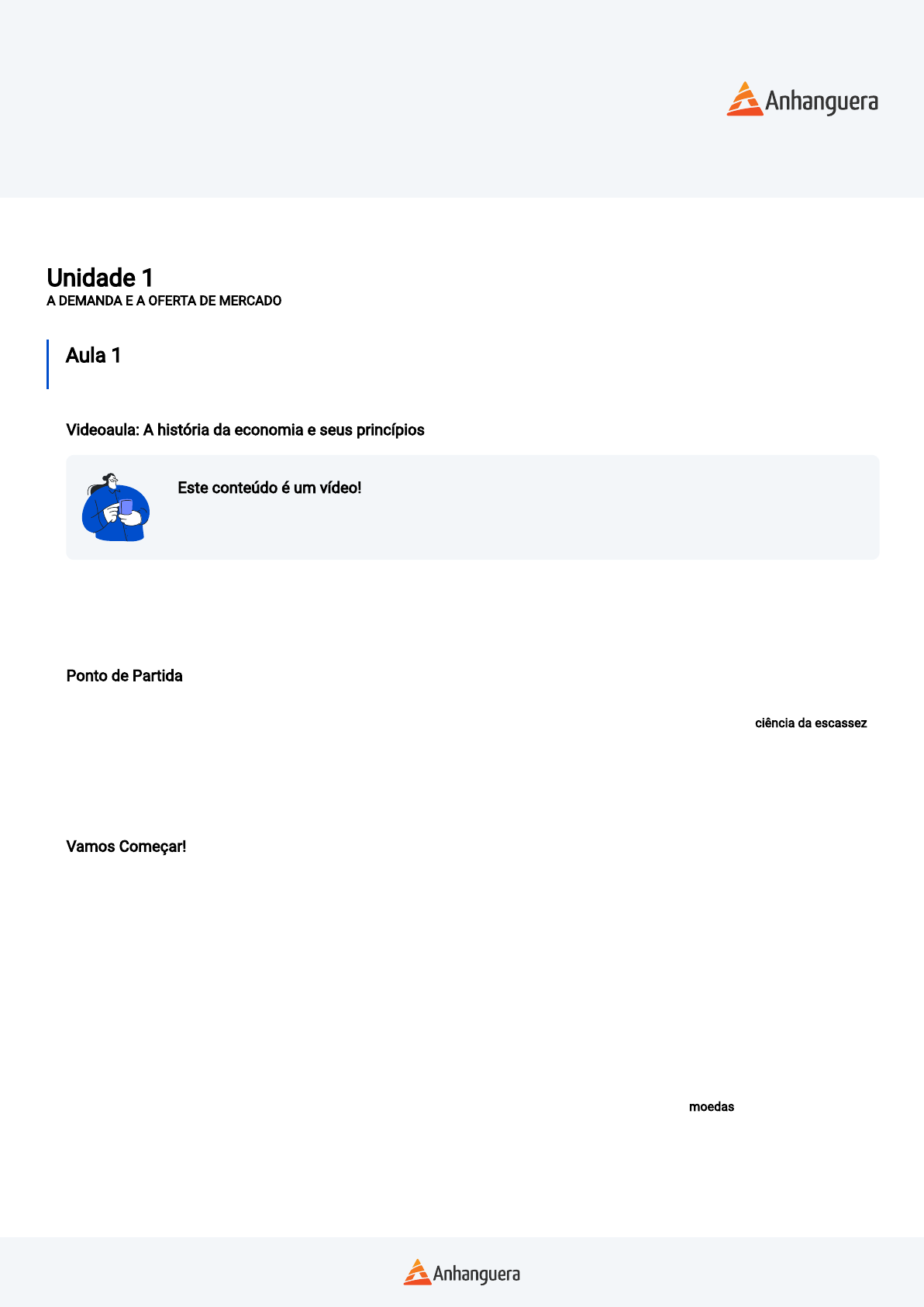 Disciplina FUNDAMENTOS ECONÔMICOS E CONTÁBEIS Unidade 1 A DEMANDA E A OFERTA DE MERCADO Aula 1 A História da Economia e sus Princípios Videoaula: A história da economia e seus princípios Este conteúdo é um vídeo! Para assistir este conteúdo é necessário que você acesse o AVA pelo computador ou pelo aplicativo. Você pode baixar os vídeos direto no aplicativo para assistir mesmo sem conexão à internet. Caro estudante, no vídeo desta aula, falaremos amplamente sobre os conceitos primordiais da Economia. Essa ciência não é exata, mas, sim, humana, e lida com diversas questões presentes no nosso cotidiano. Identi�caremos algumas dessas questões juntos e, com isso, potencializaremos nosso senso crítico para pensaremos de modo cada vez mais independente e, com isso, entregaremos ótimos resultados no mercado de trabalho. Ponto de Partida Caro estudante! Falar em economia, por vezes, pode remeter nosso entendimento a números e equações, dando-nos a falsa impressão de se tratar de uma ciência exata. Muito pelo contrário! A Economia é uma ciência humana, que diversos autores de�nem como a ciência da escassez. Por escassez, devemos entender todo recurso �nito e limitado, que pode ser desde um minério até uma máquina ou um serviço. Da situação de escassez em uma determinada oferta para satisfazer uma certa demanda surgem os principais conceitos econômicos. Você, estudante, já assimila muitos desses conceitos por simples inferência no seu dia a dia, e os nossos estudos darão a você ferramentas para aprimorar seu senso crítico e pensar de maneira cada vez mais independente. Vamos Começar! A melhor maneira de assimilar toda essa dinâmica econômica que existe atualmente é fazendo uma rápida revisão de como chegamos até aqui. Como não se trata de um curso de História, seremos breves; no entanto, sua atenção é necessária para assimilar o conteúdo futuro. Existiu e existe uma grande necessidade que moveu a humanidade: a troca. Eu poderia ter galinhas e ovos, mas não ter arroz. Meu vizinho poderia ter vacas e leite, mas não ter milho. Na Idade Antiga e na Idade Média, épocas em que praticamente toda sociedade vivia, basicamente, em um meio rural, o escambo era a principal forma de adquirir um bem ou serviço de que você precisava. Galinhas eram trocadas por leite, e certa quantidade de milho seria trocada por vacas, por exemplo. No entanto, essa forma não era muito e�ciente, pois não havia uma base de comparação igualitária, e a troca necessariamente deveria atender às necessidades dos dois lados. Foi da necessidade de tornar as trocas de bens e serviços mais e�cientes e justas para ambas as partes que as moedas começaram a nascer. Os registros indicam que as primeiras moedas cunhadas em material metálico, similares às que utilizamos atualmente, foram produzidas na Lídia (atual Turquia) no século VII a.C. Antes do surgimento das moedas, as trocas eram feitas com produtos possuídos por determinadas pessoas. Era quase possível identi�car quem possuía determinado animal ou alimento pelas características físicas. Porém, neste momento, o meio de troca o�cial se tornou padronizado, e o comércio ganhou escala. Não havia um controle e�caz em caso de roubo daquele dinheiro, fazendo surgir um problema: onde guardar meu dinheiro? Disciplina FUNDAMENTOS ECONÔMICOS E CONTÁBEIS Negociantes de ouro e prata, por já possuírem cofres e segurança apropriada para a época, aceitaram guardar o dinheiro de outras pessoas, emitindo certi�cados equivalentes à fortuna guardada, também conhecidos como papel moeda. Nascem, assim, as instituições bancárias, que são terceiros de con�ança cuja responsabilidade primária é guardar o dinheiro dos clientes. Os primeiros bancos reconhecidos o�cialmente datam de meados de 1650 a 1700. Com o tempo, os bancos entenderam que, além de guardar o dinheiro dos clientes, poderiam emprestar dinheiro aos que precisassem, cobrando um valor adicional, atualmente conhecido como juro. Já pensou se a sua mercadoria fosse a mais cobiçada e útil do mundo? Pois bem, essa é a realidade dos bancos, que, ao emprestarem dinheiro a seus clientes, estão “vendendo” dinheiro, ou seja, fornecendo crédito aos clientes, que deverão pagar com juros ao banco em uma data futura. Estabelece-se, portanto, uma relação comercial baseada em compra e venda de mercadorias, período conhecido como mercantilismo (ou pré- capitalismo). Naturalmente, com a evolução da tecnologia da época e o aumento da curiosidade humana de um modo geral, iniciou-se o período conhecido como expansão marítima. As grandes navegações, os descobrimentos, as novas rotas de comércio e os novos produtos começaram a trazer novas perspectivas aos comerciantes e às sociedades da época. Esse período marca o surgimento da primeira fase do capitalismo. Por capitalismo, entenderemos um sistema econômico que visa ao lucro e à consequente acumulação de capital (dinheiro) advindo de atividades que geram algum valor a alguém e, por isso, são comercializáveis. Décadas depois, viriam tanto a Primeira quanto a Segunda Revolução Industrial, que concretizariam o capitalismo como o modelo econômico vigente em todo o mundo. Siga em Frente... A Economia se divide em dois grandes blocos principais: macroeconomia e microeconomia. A macroeconomia trata de grandezas adjacentes às economias, como taxas de juros, in�ação, desemprego etc. Já a vertente da microeconomia olha para o comportamento das chamadas unidades econômicas individuais: consumidores, trabalhadores, empresas, investidores e qualquer indivíduo que participe dessa engrenagem. A microeconomia é responsável por estudar a forma e o porquê da tomada de determinadas decisões: hábitos de consumo, a quantidade de funcionários que uma empresa pode comportar. Uma das principais atenções da microeconomia é voltada a como as unidades econômicas (empresa