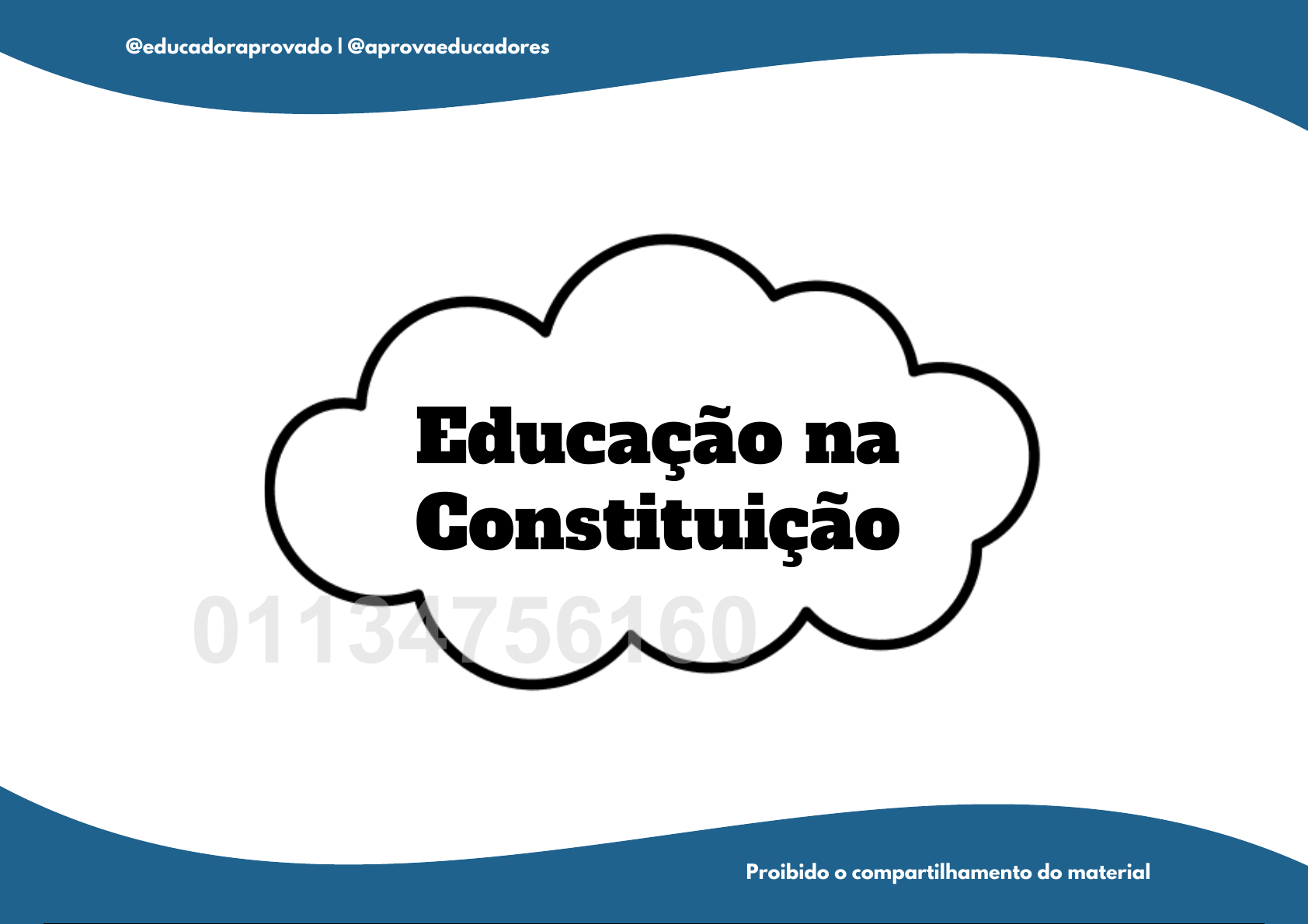 Proibido o compartilhamento do material Educação na Constituição @educadoraprovado | @aprovaeducadores 01134756160 1 / 8 A EDUCAÇÃO DIREITO DEVER PROMOVIDA E INCENTIVADA VISA DE TODOS DO ESTADO E DA FAMÍLIA COM A COLABORAÇÃO DA SOCIEDADE PLENO DESENVOLVIMENTO DA PESSOA QUALIFICAÇÃO PARA O TRABALHO PREPARO PARA O EXERCÍCIO DA CIDADANIA @educadoraprovado | @aprovaeducadores 01134756160 2 / 8 PRINCÍPIOS DO ENSINO IGUALDADE DE CONDIÇÕES P/ ACESSO E PERMANÊNCIA NA ESCOLA LIBERDADE DE APRENDER, ENSINAR, PESQUISAR E DIVULGAR O PENSAMENTO, A ARTE E O SABER GRATUIDADE DO ENSINO PÚBLICO EM ESTABELECIMENTOS OFICIAIS VALORIZAÇÃO DOS PROFISSIONAIS DA EDUCAÇÃO ESCOLAR ATRAVÉS DE PLANOS DE CARREIRA E SELEÇÃO POR CONCURSO PÚBLICO PLURALISMO DE IDEIAS E CONCEPÇÕES PEDAGÓGICAS, E COEXISTÊNCIA DAS INSTITUIÇÕES PÚBLICAS E PRIVADAS DE ENSINO @educadoraprovado | @aprovaeducadores 01134756160 3 / 8 PRINCÍPIOS DO ENSINO GESTÃO DEMOCRÁTICA DO ENSINO PÚBLICO, NA FORMA DA LEI PISO SALARIAL NACIONAL PARA OS PROFISSIONAIS DA EDUCAÇÃO ESCOLAR PÚBLICA GARANTIA DO DIREITO À EDUCAÇÃO E À APRENDIZAGEM AO LONGO DA VIDA GARANTIA DE PADRÃO DE QUALIDADE @educadoraprovado | @aprovaeducadores 01134756160 4 / 8 DIDÁTICO-CIENTÍFICA ADMINISTRATIVA GESTÃO FINANCEIRA E PATRIMONIAL ENSINO PESQUISA EXTENSÃO UNIVERSIDADES @educadoraprovado | @aprovaeducadores GOZAM DE AUTONOMIAS SEGUEM O PRINCÍPIO DA INDISSOCIABILIDADE ENTRE O TRIPÉ DE: 01134756160 5 / 8 DEVER DO ESTADO EFETIVADO MEDIANTE A GARANTIA DE: EDUCAÇÃO BÁSICA OBRIGATÓRIA E GRATUITA DOS 4 AOS 17 ANOS, ASSEGURADA INCLUSIVE AOS QUE NÃO TIVERAM ACESSO NA IDADE PRÓPRIA ATENDIMENTO EDUCACIONAL ESPECIALIZADO AOS PORTADORES DE DEFICIÊNCIA, PREFERENCIALMENTE NA REDE REGULAR DE ENSINO EDUCAÇÃO INFANTIL, EM CRECHE E PRÉ ESCOLA, ÀS CRIANÇAS DE ATÉ 5 ANOS DE IDADE PROGRESSIVA UNIVERSALIZAÇÃO DO ENSINO MÉDIO GRATUITO @educadoraprovado | @aprovaeducadores 01134756160 6 / 8 DEVER DO ESTADO EFETIVADO MEDIANTE A GARANTIA DE: ACESSO AOS NÍVEIS MAIS ELEVADOS DO ENSINO, DA PESQUISA E DA CRIAÇÃO ARTÍSTICA, SEGUNDO A CAPACIDADE DE CADA UM OFERTA DE ENSINO NOTURNO REGULAR, ADEQUADO ÀS CONDIÇÕES DO EDUCANDO ATENDIMENTO AO EDUCANDO, EM TODAS AS ETAPAS DA EDUCAÇÃO BÁSICA, ATRAVÉS DE PROGRAMAS SUPLEMENTARES DE: MATERIAL DIDÁDICO ESCOLAR TRANSPORTE E ALIMENTAÇÃO ASSISTÊNCIA À SAÚDE @educadoraprovado | @aprovaeducadores 01134756160 7 / 8 ORGANIZAÇÃO DA EDUCAÇÃO A UNIÃO, OS ESTADOS, O DISTRITO FEDERAL E OS MUNICÍPIOS ORGANIZARÃO EM REGIME DE COLABORAÇÃO OS SISTEMAS DE ENSINO UNIÃO ESTADOS E DISTRITO FEDERAL ATUARÃO PRIORITARIAMENTE NO ENSINO FUNDAMENTAL E MÉDIO ORGANIZARÁ O SISTEMA FEDERAL DE ENSINO E O DOS TERRITÓRIOS FINANCIARÁ AS INSTITUIÇÕES DE ENSINO PÚBLICAS FEDERAIS EXERCERÁ, EM MATÉRIA EDUCACIONAL, FUNÇÃO REDISTRIBUTIVA E SUPLETIVA MUNICÍPIOS ATUARÃO PRIORITARIAMENTE NO ENSINO FUNDAMENTAL E NA EDUCAÇÃO INFANTIL @educadoraprovado | @aprovaeducadores 01134756160 Powered by TCPDF (www.tcpdf.org) 8 / 8 http://www.tcpdf.org