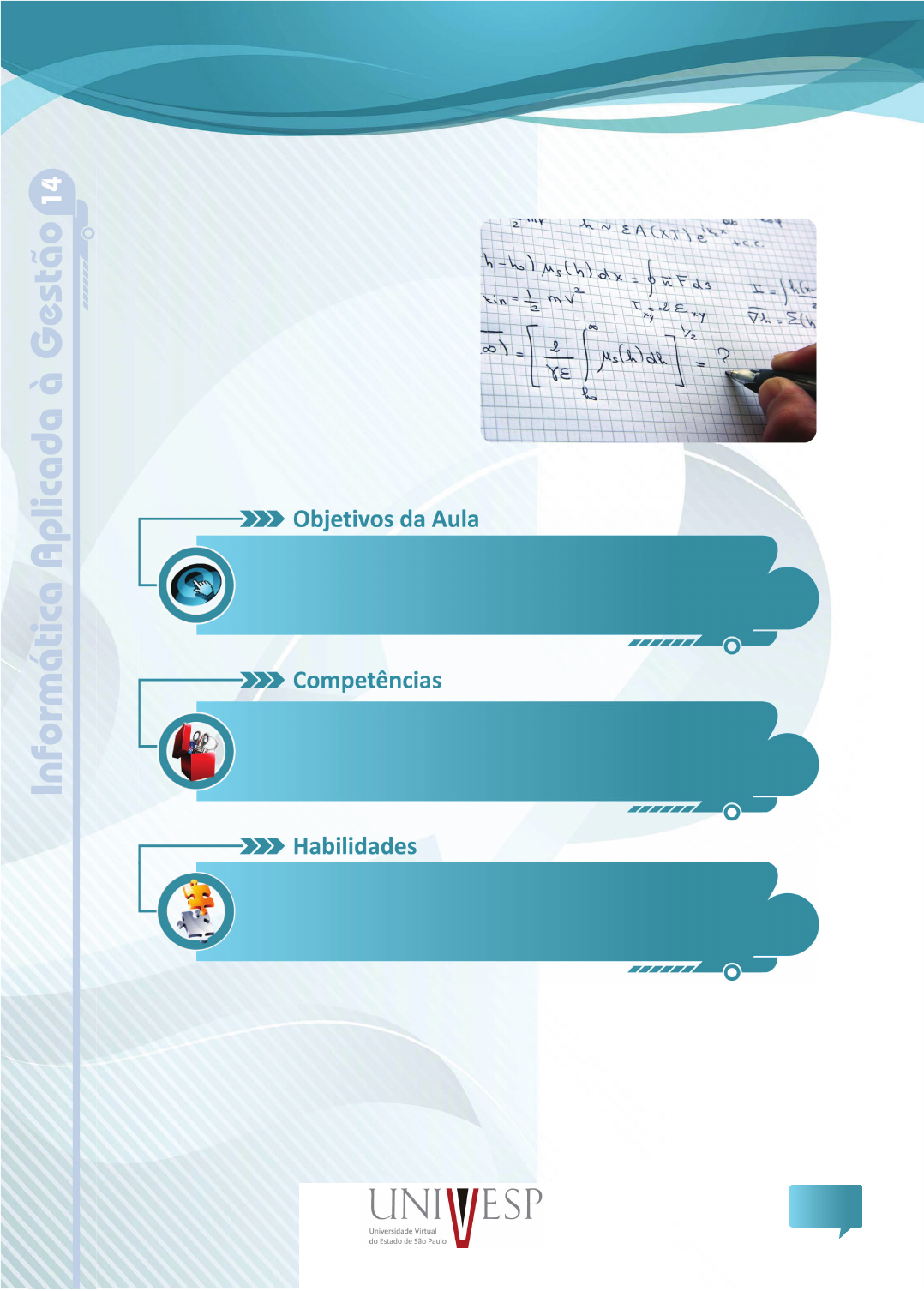 Unidade de Aprendizagem 14 01 Ao término da aula o aluno será capaz de criar fórmulas com uso da biblioteca de funções e que relacionem mais de uma planilha. Apresentar ao aluno os recursos de criação e verificação de fórmulas. Discutir os recursos da biblioteca de funções e seu uso na construção de fórmulas. Elaborar, formatar, editar, planejar e imprimir planilhas utilizando o Excel 2010. Fórmulas e funções no Excel Informática Aplicada à Gestão Apresentação Informática Aplicada à Gestão 02 Estamos em nossa terceira unidade do Excel 2010, com os recursos aprendidos suas planilhas estão muito sofisticas e com uma aparência profissional. Agora vamos sofisticar os conteúdos, nesta unidade vamos aprender a usar várias fórmulas do Excel. Você vai poder criar planilhas dinâmicas e mais funcionais. Ao final desta aula você conhecerá recursos mais poderosos do Excel. Nossa planilha já está formatada. Podemos então usar mais alguns recursos e torná-la mais agradável à leitura. Nossa primeira planilha está pronta. Algumas questões sobre o preenchimento de fórmulas ficaram sem resposta. Neste capítulo nós vamos explorar o potencial do Excel em trabalhar com fórmulas. O Excel apresenta grande número de funções, que permitem a manipulação dos dados e a obtenção de resultados muito interessantes. Figura 1: Guia – Formulas O uso de algumas funções pode estar relacionado com conhecimentos adquiridos “fora” do Excel. Funções Matemáticas, Estatísticas, de Engenharia ou de Cubo entre outras. A criação de fórmulas é sem dúvida um dos recursos mais poderosos do Excel, quanto mais funções você conhecer e souber usar melhores serão as fórmulas criadas 1 Formatação: mais recursos Vamos retomar o assunto da formatação da planilha para observar mais alguns recursos. Informática Aplicada à Gestão Figura 2: Planilha de orçamento Abra a pasta de trabalho Orçamento Doméstico.xlsx, em seguida, no Menu arquivo clique na no botão Salvar Como e altere o nome da pasta para Orçamento Doméstico Cores.xlsx. Selecione toda a planilha clicando em . No Menu Página Inicial clique na opção de Todas as Bordas e escolha a opção Sem Bordas. A planilha ficará sem as linhas que separavam linhas e colunas. Agora vamos à formatações: Selecione a região: A1:N1 em seguida clique na opção a região vai se transformar em uma única célula e o texto “Orçamento doméstico” fica centralizado, altere o alinhamento para a esquerda. Use a opção para alterar a cor do preenchimento da célula para azul. Para mudar a cor das letras para a cor branca e a opção Cor da Fonte ( ). As outras alterações de cores podem ser feitas da mesma forma, primeiro selecionando a região a ser formatada e em seguida alterando a formatação de acordo com o exemplo. Na linha saldo observamos que os valores negativos estão em um retângulo com bordas vermelhas. 03 Informática Aplicada à Gestão Informática Aplicada à Gestão ). 04 Neste caso foi usada a formatação condicional, esta formatação permite que uma célula tenha uma formatação diferente dependo do resultado ou do valor de seu conteúdo. Posicione o cursor no primeiro valor do saldo (C21), no Menu Página Inicial, clique na opção . Escolha a guia e nela clique na opção , digite zero no valor solicitado e clique em Ok. Use o Pincel de Formatação para copiar a formatação desta célula para os outros valores da linha do saldo. Pronto, a planilha está agora com uma nova formatação. Salve o trabalho e feche a pasta. 2 Endereços, fórmulas e funções no Excel. Na primeira unidade o Excel nós vimos alguns conceitos sobre elementos de planilhas do Excel: Célula: encontro de linha e coluna, menor porção de uma planilha que possui endereço único formado pelo endereço da coluna seguido pelo endereço da linha. Exemplo célula AAH234 – AAH linha e 234 linha. Região: conjunto formado por uma ou mais células formando um retângulo. Exemplo B4:J15 – B4 primeira célula – J15 última célula. Fórmulas: começam com o sinal “=” e podem conter endereços de células, operadores matemáticos, funções, etc. O resultado da fórmula aparece na célula onde a fórmula está colocada. Exemplo: =SOMA(B11:B18) – SOMA é a função matemática que soma os valores numéricos na região B11:B18. No exemplo do Orçamento doméstico nós trabalhamos com algumas fórmulas. A sugestão de solução do exercício foi a de se digitar todas as fórmulas. Com certeza esta não é a melhor solução para o preenchimento de fórmulas que têm o mesmo conteúdo relativo, isto é, efetuam os mesmos cálculos, porém alterando apenas os endereços usados. Figura 3: Preenchimento de fórmula Informática Aplicada à Gestão Informática Aplicada à Gestão Escolha a guia , . Note que as fórmulas nas células C20 e D20 têm as mesmas características da fórmula da célula B20. Elas calculam a soma das respectivas colunas de despesas. Nesta caso podemos efetuar a cópia da fórmula da célula B20 para as células que formam a linha do Total de Despesas. Posicione o cursor na célula B20, movimente o ponteiro do mouse para o canto inferior esquerdo da célula o ponteiro deve ficar com a seguinte forma: . Neste momento você pode pressionar o botão esquerdo do mouse e arrastar até a última célula dos totais de despesas na coluna M ou dar um duplo clique que o Excel vai preencher a linha até a última coluna com valores. A fórmula =SOMA(B12:B19) quando foi copiada para a célula C20 ela ser transformou em =SOMA(C12:C19), ou seja, os endereços foram alterados em “uma” coluna. O que era B virou C no movimento lateral de uma coluna. No caso da célula M20 o resultado é =SOMA(M12:M19) indicando um movimento de onze colunas. Cópia relativa: na figura abaixo podemos notar como funciona uma cópia relativa no Excel. Todos os endereços estão no formato normal. Na figura ao lado observe qu