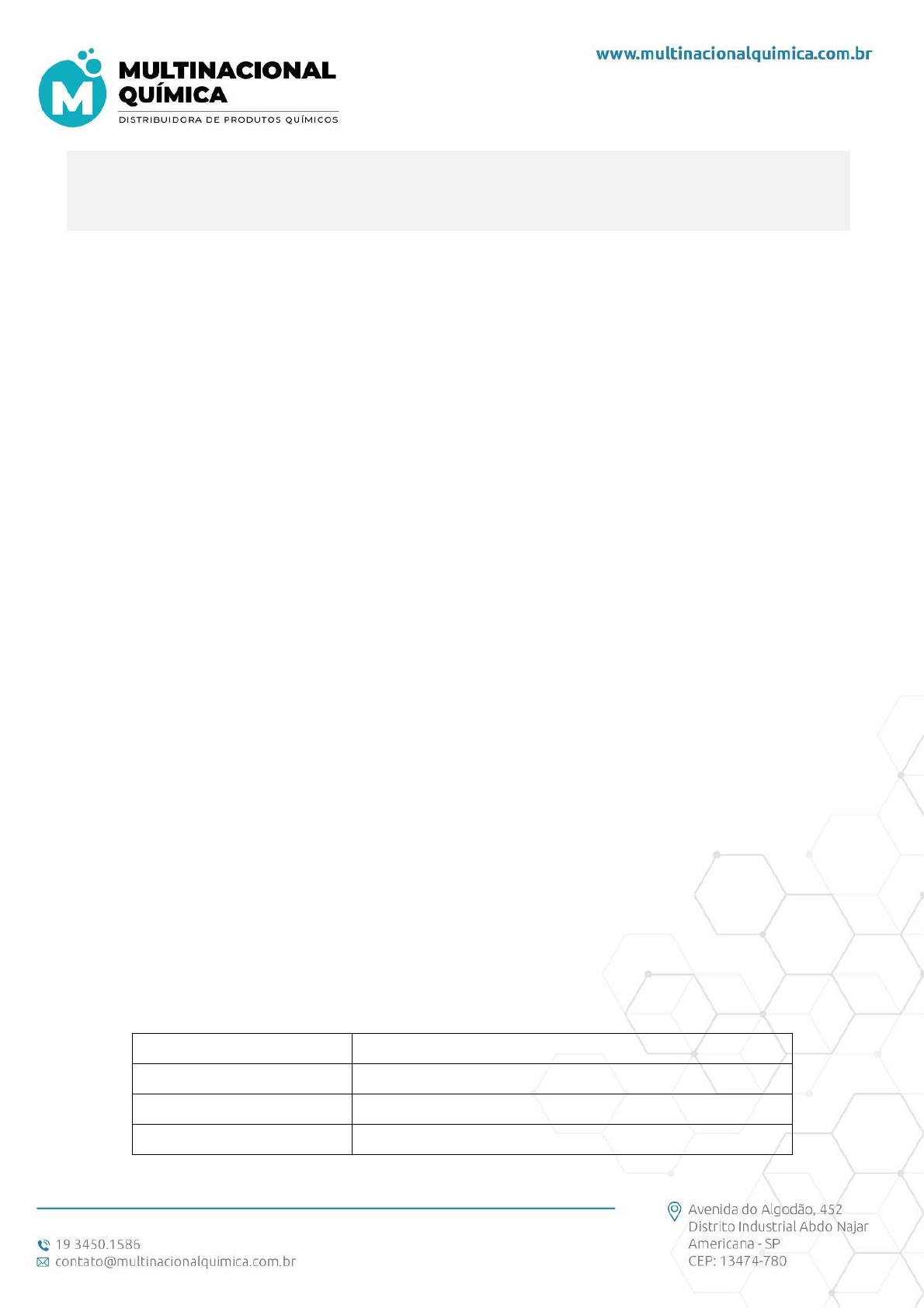 V FICHA DE INFORMAÇÕES DE SEGURANÇA DE PRODUTO QUÍMICO Produto: Anti Espumante 1 - IDENTIFICAÇÃO DO PRODUTO E DA EMPRESA Nome do Produto: Anti Espumante Nome da Empresa: Multinacional Química Endereço: Avenida do Algodão, 452 - Distrito Industrial Abdo Najar - Americana – SP CEP: 13474-780 Site: www.multinacionalquimica.com.br E-mail: contato@multinacionalquimica.com.br Telefone para Contato: 19 3450.1586 Emergência SUATRANS COTEC: 0800 591 4018 CEATOX: 0800-014-8110 Principais usos recomendados: Utilizado para eliminação de espumas dos processos de beneficiamento têxtil e aplicável em tratamento de efluentes, pode ser empregado em formulações de produtos de limpeza e limpeza de maquinários. 2 - IDENTIFICAÇÕES DE PERIGOS Classificação de perigo do produto químico: Não é uma substância ou uma mistura perigosa. Sistema de classificação utilizado: Norma ABNT-NBR 14725-2:2009 – versão corrigida 2:2010; Sistema Globalmente Harmonizado para a Classificação e Rotulagem de Produtos Químicos, ONU. Outros perigos que não resultam em uma classificação: O produto não possui outros perigos. Elementos apropriados da rotulagem Pictogramas: Não classificado como perigoso Palavra de advertência: Não classificado como perigoso Frases de perigo: Não classificado como perigoso Frases de precaução: Não classificado como perigoso 3 – COMPOSIÇÃO E INFORMAÇÕES SOBRE OS INGRDIENTES Tipo de produto: Mistura Nome químico comum ou nome técnico: Emulsão aquosa não iônica de Polidimetilsiloxano. Sinônimo: Anti Espumante. Número de registro CAS: 8050-81-5 Concentração: 20% Impurezas que contribuam para o perigo: Não apresenta impurezas que contribuam para o perigo. 4 – MEDIDAS DE PRIMEIROS-SOCORROS Inalação: Remova a vítima para local ventilado e a mantenha em repouso numa posição que não dificulte a respiração. Se houver dificuldade na respiração, administrar oxigênio. Se a pessoa sofrer parada respiratória, aplicar respiração artificial. Caso sinta indisposição, contate um CENTRO DE INFORMAÇÃO TOXICOLÓGICA ou um médico. Leve esta FISPQ. Contato com a pele: EM CASO DE CONTATO COM A PELE (ou o cabelo): Retire imediatamente toda a roupa contaminada. Enxágue a pele com água ou tome uma ducha. Em caso de irritação cutânea: Consulte um médico. Leve esta FISPQ. Contato com os olhos: Enxágue cuidadosamente com água corrente por pelo menos 15 minutos, mantendo as pálpebras abertas. No caso de uso de lentes de contato, remova-as, se for fácil e enxágue novamente. Caso a irritação ocular persista: Consulte um médico. Leve esta FISPQ. Ingestão: Não induza o vômito. Lave a boca da vítima com água em abundância. Forneça bastante água para a vítima beber. Nunca forneça algo por via oral a uma pessoa inconsciente. Caso sinta indisposição, contate um CENTRO DE INFORMAÇÃO TOXICOLÓGICA ou um médico. Leve esta FISPQ. Sintomas e efeitos mais importantes, agudos ou tardios: Pode causar Irritação ocular, pode causar alergia. Proteção do prestador de socorros: Evite contato com o produto ao socorrer a vítima. Se houver possibilidade de exposição ao produto, utilizar EPI conforme detalhado na seção 8. Notas para o médico: Se necessário, o tratamento sintomático deve compreender, sobretudo, medidas de suporte como correção de distúrbios hidroeletrolíticos, metabólicos, além de assistência respiratória. 5 – MEDIDAS DE COMBATE A INCÊNCIO Meios de extinção apropriados: Em pequenas proporções, compatível com dióxido de carbono (CO2), areia seca, espuma resistente ao álcool e pó químico seco. Em grandes proporções utilize neblina d’água ou espuma resistente ao álcool. Meios de extinção não recomendados: Jatos d’água de forma direta. Perigos específicos da mistura ou substância: A combustão do produto químico ou de sua embalagem pode formar gases irritantes e tóxicos como monóxido e dióxido de carbono. Medidas de proteção da equipe de combate a incêndio: Se a carga estiver envolvida pelo fogo, isole e evacue a área em um raio mínimo de 25 metros. Equipamento de proteção respiratória do tipo autônomo (SCBA) com pressão positiva e vestuário protetor completo. 6 – MEDIDAS DE CONTROLE PARA DERRAMAMENTO OU VAZAMENTO Precauções pessoais, equipamento de proteção e procedimento de emergência Para o pessoal que não faz parte dos serviços de emergência: Isole o vazamento de fontes de ignição. Impeça fagulhas ou chamas. Não fume. Evacuar a área, num raio de 50 metros. Não toque nos recipientes danificados ou no material derramado sem o uso de vestimentas adequadas. Evite exposição ao produto. Utilize equipamento de proteção individual conforme descrito na seção 8. Para pessoal de serviço de emergência: Utilize EPI completo com óculos de proteção contra respingos ou protetor facial, luvas de borracha ou PVC, avental em PVC ou borracha, roupa anticorrosivo (PVC ou material equivalente) e botas em borracha ou PVC. O material utilizado deve ser impermeável. Utilize máscara (facial inteira ou semi- facial) com filtro orgânico. Isole o vazamento de fontes de ignição. Evacue a área, num raio de, no mínimo, 50 metros. Mantenha as pessoas não autorizadas afastadas da área. Pare o vazamento, se isso puder ser feito sem risco. Precauções ao meio ambiente: Evite que o produto derramado atinja cursos d’água e rede de esgotos. Métodos e materiais para contenção e limpeza: Utilize barreiras naturais ou de contenção de derrame. Não permita a entrada de água nos recipientes. Adsorva o produto remanescente, com areia seca, terra, vermiculite, ou qualquer outro material inerte. Coloque o material adsorvido em recipientes apropriados e remova-os para local seguro. Para destinação final, proceda conforme a Seção 13 desta FISPQ. Diferenças na ação de grandes e pequenos vazamentos: Em pequenos derramamentos, cubra com terra seca, areia seca ou outro mate