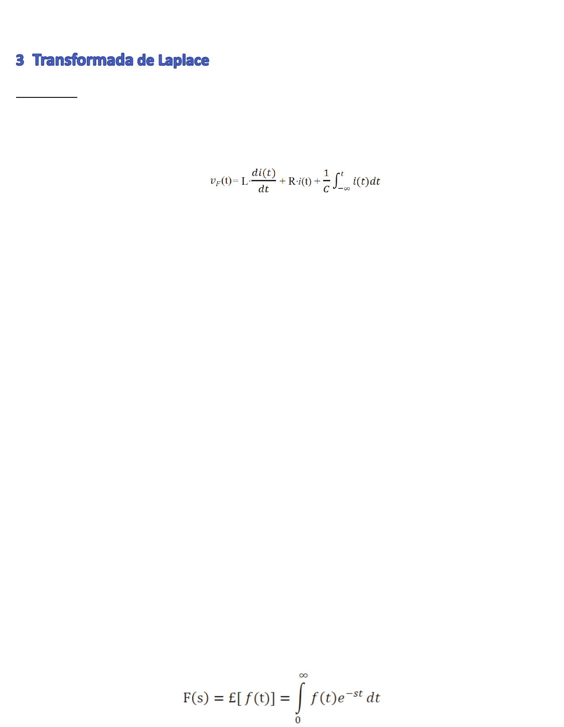 SISTEMAS DE CONTROLE Hipóteses: • O estudo de um objeto ou sistema físico pode ser feito através das relações físicas que descrevem o comportamento deste sistema. • As relações que descrevem um sistema dinâmico resultam em equações diferenciais. Exemplo em um sistema RLC: • Para se entender como um sistema funciona, na maioria dos casos deve-se resolver as equações diferenciais que o descrevem, o que normalmente não é uma tarefa simples. • Para contornar este problema é possível utilizar uma transformação em que, funções diferenciais e integrais são transformadas em simples equações algébricas. Esta transformação chama-se Transformada de Laplace. 1 FATEC - Prof. Mario F. G. Boaratti 2024 • A transformada de Laplace transforma funções no tempo, cuja variável é representada por t, em funções de frequência complexa já incluindo as condições iniciais, cuja variável é representada por s, chamada de variável complexa. • Este método oferece uma visão do comportamento do sistema no domínio da frequência, complementar ao estudado na análise do domínio do tempo. De fato, os métodos de análise no domínio do tempo e no domínio da frequência são duais. • Além disso, algumas funções irregulares, que não podem ser resolvidas com facilidade pelos métodos clássicos, têm uma solução mais simples proporcionada pelo método de Laplace. Definição da Transformada de Laplace: Seja f(t) uma função no tempo aqual é zero para t ≤ 0 e que é arbitrariamente definida para todo t > 0. Então, a Transformada de Laplace de f(t), indicada por £[ f(t)] é definida por: 2 1 / 20 • Assim, a operação definida por £[ ] transforma f(t), que está no domínio do tempo, em F(s), que está no domínio da frequência complexa, ou simplesmente no domínio de s, onde s é a variável complexa, representada por: s = + Sendo a parte Real de s e a parte Imaginária de s. • Embora pareça que a integração possa ser difícil, logo será aparente que não, pois a aplicação do método da Transformada de Laplace utiliza tabelas que abrangem todas as funções possíveis de serem encontradas na teoria elementar de circuitos. • Existe uma unicidade nos pares de transformada, isto é, se 1( ) e 2( ) tiverem a mesma imagem no domínio s, ou seja, o mesmo F(s), então podemos afirmar que 1( ) = 2( ). Isto permite retornar em outra direção, partindo do domínio s para o domínio do tempo, um processo chamado Transformada Inversa de Laplace, £–1[ F(s) ] = f(t). 3 Legenda alfabeto grego: s = Sigma Minúsculo w = Ômega Minúsculo • A Transformada Inversa de Laplace pode também ser expressa como uma integral, a integral de inversão complexa, como se vê a seguir: 4 O que corresponde a uma integral fechada que percorre o caminho Porém, o cálculo da integral de inversão é um tanto complicado. Na prática, raramente se utiliza esta integral para obter f(t). No geral, não há necessidade de se calcular a integral. Encontra-se a T.I.L. por decomposição do polinômio e uso da tabela de transformadas de Laplace em sentido contrário. Assim faremos no nosso estudo! Local de integração Abcissa de convergência 2 / 20 Algumas Transformadas de Laplace mais utilizadas. I. Transformada de Laplace de uma função degrau unitário [u(t) = 1 ], também conhecida como função Heaviside. 5* Oliver Heaviside (1850 – 1925), foi um matemático e engenheiro eletricista inglês. Ela é aplicada nas funções, quando for necessário definir uma transição rápida em t = 0. A função degrau unitário tem aplicações em diversas áreas, como: Eletricidade: Representa a súbita alteração de corrente ou voltagem quando uma chave é ligada. Mecânica de sólidos: Representa carregamentos retangulares uniformes. Lembrando da definição da Transformada de Laplace, podemos escrever: 6 Sabemos que: 3 / 20 II. Transformada de Laplace da Função Exponencial. Seja a função exponencial f(t) = –at.u(t), vista na figura a seguir. Onde, u(t) indica que –at só se aplica para t ≥ 0. 7 Obs.: Só para ilustrar, poderíamos associar esta função com a descarga de um capacitor, previamente carregado, sobre uma resistência, a partir do instante zero. t T.L. de f(t) = F(s) 6 / 20 VII. Transformada de Laplace da Integral de uma Função. Seja f(t) uma função no tempo com Transformada de Laplace F(s) e se deseja obter a transformada da integral, representada por: Esta integral se resolve por partes, . Fazendo: Temos: 13 . ∫ Para o primeiro termo do lado direito da equação, , calculando o termo em t = ∞ resulta em zero por causa que e-s.∞ = 0, e calculando para t = 0, implica em e-s.0 = 1, o que resulta em: , sendo f -1(0+) o valor da integral para a condição inicial em t = 0+. Para o segundo termo do lado direito da equação temos: T.L. de f(t) = F(s) Concluindo: 14 Veja desenvolvido: 7 / 20 15 15 Para n = 1,2,3,... 16 Para n = 1,2,3,... 17 d(t) 1 18 d(t-a) e−as 16 8 / 20 Algumas propriedades das Transformadas de Laplace: Linearidade Se F1(s) e F2(s) forem, respectivamente, as transformadas de Laplace f1(t) e f2(t), então: em que a1 e a2 são constantes. Fatores de escala ou Mudança de escala no tempo Se F(s) for a transformada de Laplace de f (t), então: onde a é uma constante que multiplica o tempo da função e a > 0. 17 Deslocamento no tempo Se F(s) for a transformada de Laplace de f (t), então: Porém, u(t – a) = 0 para t a. Em outras palavras, se uma função for retardada no tempo de a, o resultado no domínio s é encontrado multiplicando-se a transformada de Laplace da função (sem o atraso) por e –as. Isso é denominado retardo no tempo ou propriedade de deslocamento de tempo da transformada de Laplace. Obs.: retardo no tempo = atraso no tempo Deslocamento de frequência Se F(s) for a transformada de Laplace de f (t), então: Isto é, a transformada de Laplace de e–at f (t) pode ser obtida da transformada de Laplace de f (t) su
