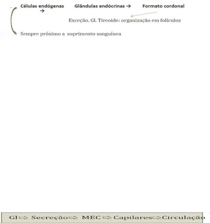 GLANDULAS ENDOCRINAS CICLO 2 HISTOLOGIA Hormônios (primeira aula Elder) • São moléculas sinalizadoras químicas: Gr. Hormaein – excitar • Liberadas por células endócrinas para dentro dos tecidos Algumas moléculas que tem uma determinada atividade não estimuladora ou pelo menos o estudo dela também podem exibir atividades estimuladoras. Ex: ATP que é uma molécula utilizada para o fornecimento de energia e está relacionada também a comunicação parácrina da mácula densa com as células justaglomerulares na produção da renina. Os hormônios são fatores liberados por células endócrinas para dentro do tecido. Glândulas endócrinas carecem de um ducto, elas despejam o seu conteúdo diretamente na corrente sanguínea. As glândulas exócrinas como por ex as salivares elas tem um ducto onde a produção é encaminhada para um “encanamento” e que encontra o interior de um órgão, superfície corpórea, etc. As células endógenas que estão localizadas em glândulas endócrinas em um formato cordonal. Existe uma exceção a regra que é a glândula tireóide. Outra regra é que as glândulas endócrinas elas estão sempre perto de um suprimento sanguíneo, ou seja, sempre lado a lado de vasos sanguíneos. Pq essas células precisam de uma localização bem próximas de vasos sanguíneos? Para ser jogada rápida a corrente sanguínea. É meio que uma produção sob demanda. Glândulas endócrinas • Desprovidas de ductos secretores • Excreção: placenta – sinciciotrofloblastos secretam diretamente para vilosidades placentárias • Composição: células epitelioides – células epiteliais sem superfície livre, incorporados ao tecido conjuntivo Lá pela 12ª a 16ª semana o corpo lúteo produtor de progesterona e estrogênio ele regride na mulher grávida. A produção desses hormônios não podem ficar expressos muito tempo na vida da mulher pq é muito perigoso hormônio demais e de menos pode ser fatal. A natureza colocou sobre a responsabilidade da produção durante o período gestacional algo que vai embora no final do término da gestação. Na placenta o sinciciotrofloblasto que faz parte das vilosidades coriônicas terciárias, eles jogam rapidamente os hormônios produzidos na corrente sanguínea rapidamente, nos lagos de sangue que tem na placenta e logo cai também na corrente sanguínea materna. A células endócrinas são compostas por células epitelioides que é uma célula de característica epitelial, mas que não tem nem sempre uma origem direta dos folhetos epiteliais embrionários. Folhetos epiteliais embrionários: ectoderma e endoderma. Células epiteliais que surgiram do mesoderma muitas vezes recebem o nome de epitelióide. A célula quando ela faz parte de uma glândula exócrina que tem um ducto ela tem uma polaridade especifica. Agora as glândulas endócrinas elas não tem uma polaridade definida. Hormônios controle Parácrino: hormônios percorrem curtos trechos de vasos sanguíneos • Ex: gastrina: liberada pelas células G do estômago • Alcança as células fúndicas do estômago • Aumenta ácido clorídrico Justácrino*: hormônio atua difunde-se na matriz extracelular a células próximas • Ex: somatostatina: produzidas nas ilhotas de Langerhans • Alcança células da mesma ilhota • Inibe secreção de insulina A partir do momento que cai na corrente sanguínea mesmo que o período for curto ele é endócrino. O termo justácrino está com asterisco não é para estudar. Nós vamos pensar só em parácrino – se tem comunicação com a célula vizinha parácrino. Autócrino: hormônio atua nas próprias células que o produziu (pode atingir outras células, mais atinge ela também). Essa molécula que saiu dela e a auto atingiu, ou seja, uma auto estimulação é a comunicação autócrina. • Ex: fator de crescimento semelhante à insulina (IGF): é um fator de crescimento que potencializa muito a proliferação de células, a recuperação de tecidos • Liberação de diferentes tipos celulares • Ativação das próprias células Hormônios (livro) Hormônios são moléculas que agem como sinalizadores químicos. Eles são liberados por células especializadas chamadas endócrinas, porque secretam "para dentro” ao contrário das células de glândulas exócrinas, cuja secreção é levada por meio de duetos excretores a uma cavidade ou à superfície do corpo. Células endócrinas comumente se unem formando glândulas endócrinas, em que se organizam geralmente sob forma de cordões celulares. Uma exceção notável é a glândula tireóide, cujas células são organizadas como pequenas esferas, chamadas folículos. Além das glândulas endócrinas, há muitas células endócrinas isoladas, como as células endócrinas encontradas no trato digestivo. As células endócrinas estão sempre muito próximas de capilares sanguíneos, que recebem os hormônios secretados e os distribuem pelo organismo, diluídos no plasma. Muitos hormônios, portanto, agem distantes do seu local de secreção. Há, no entanto, células endócrinas que produzem hormônios que agem a uma distância curta, um tipo de controle chamado parácrino. Esses hormônios podem chegar ao seu local de ação por meio de curtos trechos de vasos sanguíneos. Um bom exemplo de controle parácrino é o da gastrina, liberada pelas células G localizadas principalmente na região do piloro no estômago. A gastrina alcança as glândulas fúndicas do estômago por vasos sanguíneos, estimulando a produção de ácido clorídrico. Outro modo de controle é o justácrino, no qual uma molécula é liberada na matriz extracelular, difunde-se por essa matriz e atua em células situadas a uma distância muito curta de onde foram liberadas. A inibição de secreção de insulina em ilhotas de Langerhans pela ação de somatostatina produzida por células da mesma ilhota é um exemplo de controle justácrino. No controle chamado de autócrino, as célula