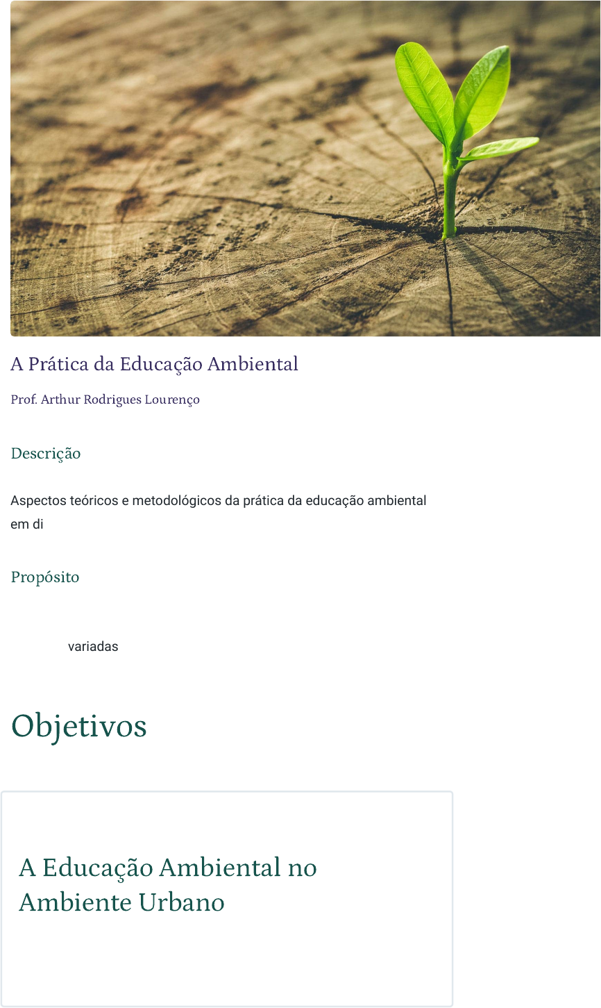A Prática da Educação Ambiental Prof. Arthur Rodrigues Lourenço Descrição Aspectos teóricos e metodológicos da prática da educação ambiental em diferentes ambientes. Propósito Proporcionar um entendimento da dimensão da educação ambiental nas mais variadas esferas da vida humana. Objetivos Módulo 1 A Educação Ambiental no Ambiente Urbano Analisar a educação ambiental no ambiente urbano. Módulo 2 A Educação Ambiental no Ambiente Rural e em Populações Tradicionais Analisar a educação ambiental no ambiente rural e em populações tradicionais. Módulo 3 A Educação Ambiental em Unidades de Conservação Analisar a educação ambiental em Unidades de Conservação. Módulo 4 Projetos de Educação Ambiental Descrever a construção de projetos de educação ambiental. 1 - A Educação ambiental no Ambiente Urbano Ao �nal deste módulo, você será capaz de analisar a educação ambiental no ambiente urbano. Características e componentes do ambiente A prática da educação ambiental (EA) é um processo contínuo e permanente que deverá ser realizado em conjunto com diferentes instituições parceiras, sempre buscando a construção colaborativa e a minimização de impactos ambientais. Este conteúdo irá elucidar particularidades da prática da educação ambiental em diferentes contextos, como no ambiente urbano e em Unidades de Conservação, por exemplo. Ao final, serão pontuadas questões importantes para a elaboração e a execução de um projeto de educação ambiental. Introdução urbano As cidades são fruto do desenvolvimento do homem em determinado território, o que muitas vezes está relacionado às oportunidades que o território oferece. Temos como exemplo das diferentes oportunidades de cada localidade os seres humanos que migram de áreas rurais para áreas urbanas em busca de melhores condições de trabalho. Um ambiente com qualidade de vida só é possível se todas as pessoas que vivem e contribuem para o seu desenvolvimento estiverem satisfeitas nas várias dimensões da vida humana. A paisagem urbana também pode refletir os vários tipos de uso do território, se considerado o contexto histórico, cultural, social, econômico e ambiental em que o meio urbano está inserido. O que você imagina quando pensa em urbano? Quando nos deparamos com a palavra urbano, seja qual for o contexto, logo imaginamos um local com muitas pessoas, intensa movimentação de veículos, cores acinzentadas ou enegrecidas, muitas lojas, luzes e cartazes de propagandas. A cidade de Mumbai, uma das mais populosas da Índia. O fato é que a definição do que é urbano ou não vai levar em consideração principalmente a quantidade de pessoas que existem em determinado local, sendo assim, os ambientes considerados urbanos são densamente populosos. Entre os componentes do ambiente urbano, destacam-se: Grandes e contínuas edi�cações Prédios, avenidas, praças. Muitas habitações Casas, condomínios, ocupações irregulares e favelizações. Urbanização e infraestrutura Iluminação pública, calçadas, serviços de saúde, educação, cultura e lazer. Uma vez que o meio urbano é constituído pelas modificações que os seres humanos realizam no ambiente natural, torna-se evidente que tais modificações acarretarão algum tipo de impacto ambiental. Os impactos ambientais, em geral negativos, são diversificados e podem passar despercebidos devido à sua constância no cotidiano dos habitantes. É possível ainda que esses impactos sejam agravados por desinformação, preconceitos e ideologias. Historicamente, a forma como as áreas urbanas foram construídas e organizadas, na maioria dos casos, não consideraram a degradação ambiental ocasionada para o seu surgimento e consequente crescimento. Dessa maneira, um futuro modo de vida saudável e em harmonia entre os seres humanos e o meio ambiente, urbano ou não, é diretamente afetado. Impactos ambientais nos ambientes urbanos Os impactos e problemas ambientais encontrados no ambiente urbano são inúmeros e diversos, podendo variar de acordo com a geografia local, com a infraestrutura para sobrevivência proporcionada pelo governo, com os níveis de escolaridade e poder aquisitivo dos habitantes, entre muitas outras variáveis. Por isso, para se trabalhar a educação ambiental no ambiente urbano, é preciso estar muito atento às questões sociais que permeiam a problemática ambiental. Deve-se destinar atenção não só para a mitigação dos impactos ambientais, mas também para as causas dos problemas sociais, o que pode tornar as ações com intuito de promover a conscientização ambiental mais complexas. Resíduos e poluição Um dos grandes problemas ambientais relacionados às questões sociais é a geração e o descarte inadequado de resíduos, que podem ser classificados como: Resíduos líquidos Popularmente chamados esgoto ou chorume, oriundos do estilo de vida urbano, são também chamados de efluentes. Podem ser de origem doméstica, provenientes das casas, prédios e moradias em geral, ou industriais, oriundos de fábricas, refinarias e outros. Despejo de esgoto. Esse tipo de resíduo, na maioria das regiões urbanizadas do Brasil, é lançado sem tratamento em rios, lagoas e outros mananciais, ocasionando odor fétido (poluição do ar), visual desagradável (poluição visual) e até a disseminação de doenças. Em grandes metrópoles brasileiras, é comum encontrarmos algum rio que se tornou tão poluído ao ponto de atualmente só ter a função de receber e transportar os efluentes para outros locais. Existem também os resíduos líquidos provenientes de lixões e aterros sanitários, que podem contaminar o lençol freático e causar sérios problemas ambientais. Resíduos sólidos Popularmente chamado de lixo — também são um dos problemas ambientais mais comuns no meio urbano. São gerados por praticamente qualquer atividade humana e, se não forem destinados corretamen