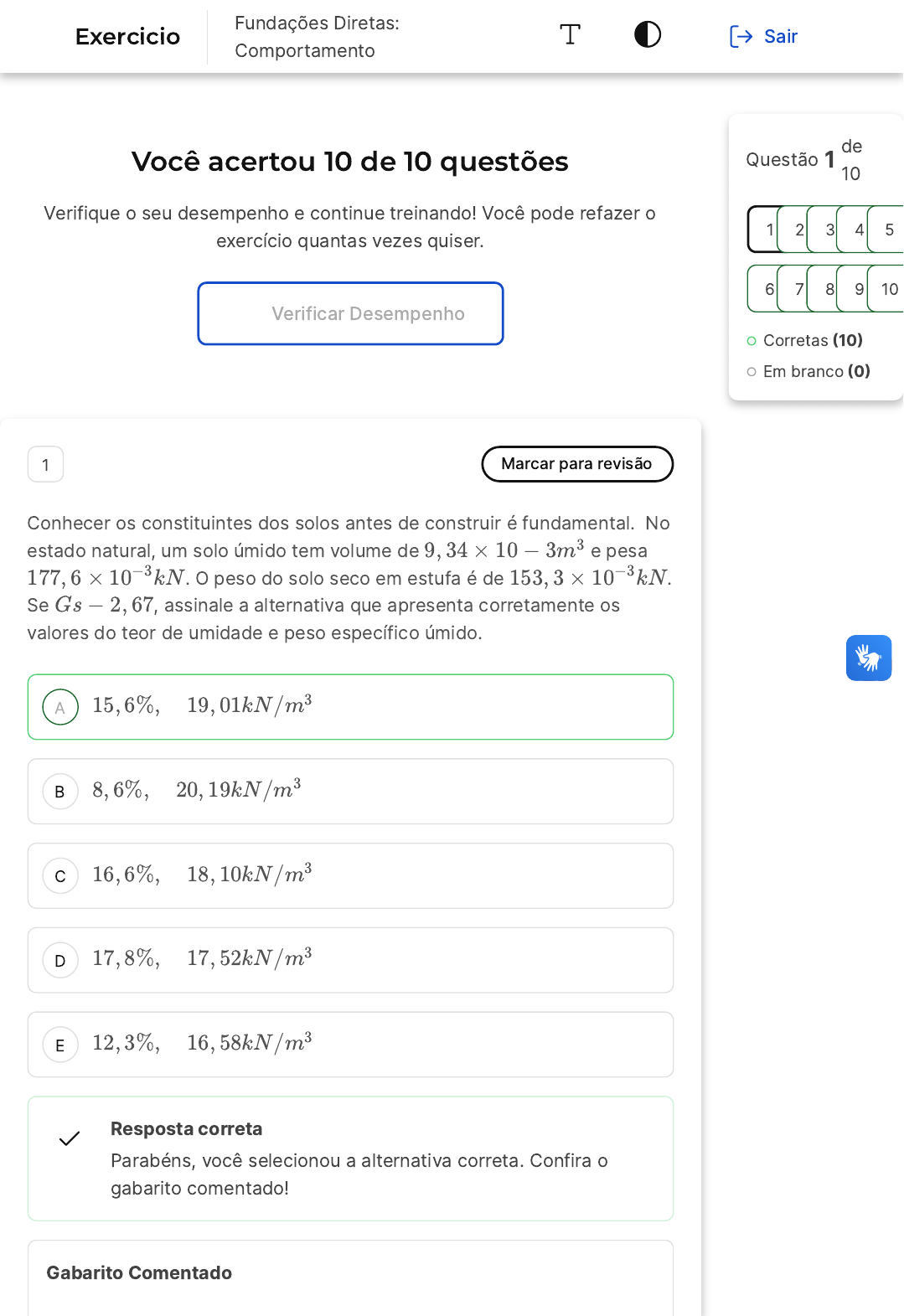 Você acertou 10 de 10 questões Verifique o seu desempenho e continue treinando! Você pode refazer o exercício quantas vezes quiser. Verificar Desempenho A B C D E 1 Marcar para revisão Conhecer os constituintes dos solos antes de construir é fundamental. No estado natural, um solo úmido tem volume de e pesa . O peso do solo seco em estufa é de . Se , assinale a alternativa que apresenta corretamente os valores do teor de umidade e peso específico úmido. 9, 34 × 10 − 3m3 177, 6 × 10−3kN 153, 3 × 10−3kN Gs− 2, 67 15, 6%, 19, 01kN/m3 8, 6%, 20, 19kN/m3 16, 6%, 18, 10kN/m3 17, 8%, 17, 52kN/m3 12, 3%, 16, 58kN/m3 Resposta correta Parabéns, você selecionou a alternativa correta. Confira o gabarito comentado! Gabarito Comentado Questão 1 de 10 Corretas �10� Em branco �0� 1 2 3 4 5 6 7 8 9 10 Exercicio Fundações Diretas: Comportamento Sair A B C Gabarito: Justificativa: 15, 6%, 19, 01kN/m3 2 Marcar para revisão Marque a alternativa que preencha corretamente às lacunas da afirmativa a abaixo: Sobre capacidade de carga as considerações Terzaghi propõem um modelo esquemático que mostra a _______________ sendo composta pelo que ele denomina como sendo zonas de equilíbrio _______________ representadas na Figura pela área GEDCF, sendo subdivididas em Zona I (Equilíbrio _______________), Zonas II �Estado de _______________ radial) e Zonas III �Estado passivo de _______________). Superfície de Ruptura, Plástico, Elástico, Cisalhamento, Rankine Superfície de Cisalhamento, Elástico, Plástico, Cisalhamento, Rankine Superfície de Cisalhamento, Elástico, Plástico, Cisalhamento, Coulomb D E Superfície de Ruptura, Plástico, Elástico, Compressão, Coulomb Superfície de Ruptura, Elástico, Plástico, Cisalhamento, Mohr- coulomb Resposta correta Parabéns, você selecionou a alternativa correta. Confira o gabarito comentado! Gabarito Comentado Gabarito: Superfície de Ruptura, Plástico, Elástico, Cisalhamento, Rankine Justificativa: Superfície de Ruptura, Plástico, Elástico, Cisalhamento, Rankine. Terzaghi propõem um modelo esquemático que mostra a superfície de ruptura sendo composta pelo que ele denomina como sendo zonas de equilíbrio plástico sendo subdivididas em Zona I - Equilíbrio elástico, Zonas II � Estado de cisalhamento radial e Zonas III � Estado passivo de Rankine. 3 Marcar para revisão A respeito do desempenho das fundações, calcule o acréscimo de tensão gerado no ponto A da placa de fundação abaixo, apoiada na cota �2 m, na profundidade de 12 metros, e marque a alternativa correta. A B C D E 2, 50kPa 3, 00kPa 3, 50kPa 4, 00kPa 4, 50kPa Resposta correta Parabéns, você selecionou a alternativa correta. Confira o gabarito comentado! Gabarito Comentado Gabarito: Justificativa: Desenvolvendo os cálculos, Newmark deve-se considerar Onde, e Sendo assim, 4, 50kPa Δσ = q0.f(m,n) m = a z n = b z Δσ = 0, 9 + 1, 8 + 1, 8 Δσ = 4, 5kPa 4 Marcar para revisão A figura mostrada abaixo apresenta, esquematicamente, um problema recorrente em obras geotécnicas. Na análise desse problema é correto afirmar que A B C D E A segurança contra a ruptura aumenta com o aumento da carga vertical nas fundações. Esse problema poderia ser evitado apoiando o edifício sobre fundações rasas. Os esforços horizontais nas fundações são diretamente proporcionais ao peso específico do solo que compõe a camada de fundação. Quanto maior for a altura do aterro, maior serão os deslocamentos horizontais nas estacas de fundações. Quanto maior for a carga vertical nas estacas maior será sua flambagem. Resposta correta Parabéns, você selecionou a alternativa correta. Confira o gabarito comentado! Gabarito Comentado Gabarito: Quanto maior for a altura do aterro, maior serão os deslocamentos horizontais nas estacas de fundações. Justificativa: A afirmativa "A segurança contra a ruptura aumenta com o aumento da carga vertical nas fundações." é falsa pois a segurança contra a ruptura diminui se ocorrer o aumento da carga vertical. A afirmativa "Esse problema poderia ser evitado apoiando o edifício sobre fundações rasas." está errada pois independentemente do tipo de fundação se rasa ou profunda as características das cargas aplicadas e as propriedades do solo influenciaram a interação solo- estrutura. A afirmativa "Os esforços horizontais nas fundações são diretamente proporcionais ao peso específico do solo que compõe a camada de fundação." está errada pois os esforços que são proporcionais ao peso específico são os esforços verticais, que aumentam ao longo da profundidade se o peso específico não variar. E a alternativa "Quanto maior for a carga vertical nas estacas maior será sua flambagem." está errada pois o efeito de flambagem está associado ao comprimento do elemento estrutural, e só ocorre em elementos onde não existem confinamento lateral, o que não é o caso. A B C D E 5 Marcar para revisão A respeito do desempenho das fundações, baseados nas recomendações da norma NBR 6122�2019, marque �V� para Verdadeiro ou �F� para Falso para as questões abaixo: I� O Método de Bousinesq para cálculo de acréscimo de tensão considera que o solo ideal é aquele onde o material é plástico linear, homogêneo e isotrópico. II� Isóbaras é o lugar geométrico de iguais acréscimos de tensão e seu conjunto é denominado Bulbos de Tensão. II� Sempre que o solo for classificado como pré-adensado, tem-se uma razão de sobre adensamento maior que 1. Assinale a alternativa com a sequência correta: F � F � F V � F � F F � V � V V � F � V V � V � V Resposta correta Parabéns, você selecionou a alternativa correta. Confira o gabarito comentado! Gabarito Comentado A B C D E Gabarito: F � V � V Justificativa: A primeira afirmação é falsa porque o Método de Bousinesq para cálculo de acréscimo de tensão considera que o solo ideal é aquele onde o material 