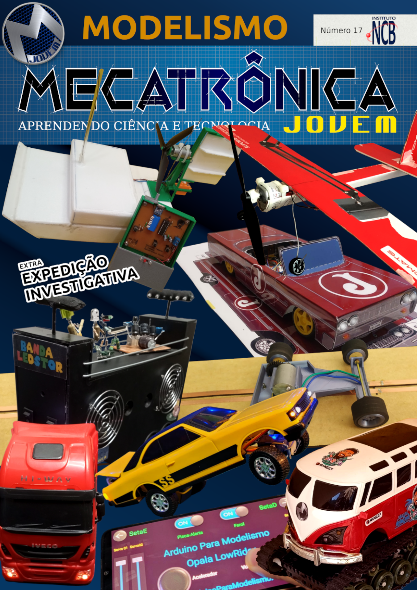 https://www.newtoncbraga.com.br/mecatronicajovem O modelismo é uma arte. Fazer em escala pequena coisas o nosso mundo é algo que fascina muitos e com o uso da tecnologia pode dar um passo além, que no passado não era possível. Colocar luzes de LEDs e portas que abrem, além de campainhas numa maquete, fazer modelos de carros que andam e até são controlados remotamente, trabalhar com barcos e outros veículos fascinam. E isso sem se falar nas ferrovias em miniatura que têm até clubes e adeptos que trabalham nisso profissionalmente. E tudo isso se enquadra no mundo da mecatrônica que é o foco de nossa revista. Assim, nada melhor do que unir numa única edição projetos de modelismo de diversas áreas que empregam novas tecnologias e até usar essas novas tecnologias na elaboração de suas partes como a revolucionária impressora 3D. Assim, fizemos esta edição especial de nossa revista tratando justamente disso. Baseada nas nossas lives do Clube da Mecatrônica você terá aqui apenas uma amostra do que pode ser feito. Acompanhenos Newton C. Braga Fiquei muito feliz com o resultado dessa série com o tema modelismo. Sou suspeito, pois gosto muito de modelismo, uma paixão desde os tempos de infância que ia na saudosa loja Aerobras em São Paulo comprar kits de aeromodelos. Movidos pela paixão, nossos colaboradores se dedicaram muito nos projetos e nas montagens, o resultado pode ser visto nessa edição e em detalhes nas Lives da Mecatrônica Jovem na playlist Modelismo no canal de Youtube do Instituto Newton C. Braga. Onde mais você encontraria, modelos de barco com controle remoto, Trio elétrico, aeromodelo voo circular , autorama , Kombi Siberiana, Impala 63 low rider (Jmóvel) e Opala Lowrider ? Somente no Clube da Mecatrônica Jovem! Se ainda não faz parte venha participar, aprender muito, conhecer pessoas e se divertir. Agradeço a todos os colaboradores da Tela e do Chat, e ao nosso convidado especial, o Aldeir do canal “Arduino para Modelismo” que aceitou o desafio da Mecatrônica Jovem para desenvolver um modelo de Lowrider com suspensão ajustável e que pulasse . Desafio aceito e com um resultado incrível ! Agradeço também a todos os membros do canal “Modelismo para Arduino” que colaboram pelo Chat das Lives da Mecatrônica Jovem . Mande seus projetos, comentários, sugestões e dúvidas no Discord da Mecatrônica jovem. Boa leitura, boas montagens e se divirta muito! Até a próxima edição. Luiz Henrique Correa Bernades Revista Mecatrônica Jovem Ano 3 N° 17 2024 Editorchefe Luiz Henrique Corrêa Bernardes Atendimento ao Leitor leitor@newtoncbraga.com.br Designer Gráfico Vander da Silva Gonçalves Pedro Otto Avanci Gonçalves Conselho Editorial Márcio José Soares Newton C. Braga Renato Paiotti Jornalista Responsável Marcelo Braga MTB 0064610 SP Eu Avisei ! É importante salientar que as montagens aqui apresentadas tem o objetivo didático, ou seja, não deve ser um produto final de mercado. Outra coisa importante é que as montagens devem ser acompanhadas por um adulto responsável. É comum as montagens não funcionarem ou darem certo nas primeiras tentativas, assim como podemos ver em nossas live, por isso, não desista, a persistência é a alma do maker. Caso você copie ou reproduza qualquer conteúdo desta edição, pedimos que mencione e coloque o link para que outros possam baixar ou ler o conteúdo original, referências dão credibilidade naquilo que você fala ou escreve. Mencione através da #mecatronicajovem a montagem que você fez desta edição, gostaríamos muito de mostrar o seu projeto em nossas lives. Para finalizar, nas montagens usamos materiais que podem nos machucar ou fazer mal, então use material de proteção e como mencionado, sempre procure um adulto responsável para ajudar em suas montagens. Colaboradores Você encontrará todos os nossos colaboradores em nossas lives, tanto na tela como no chat. Temos também os nossos colaboradores no Discord. Quer conhecer esta turma? Entre para o Clube da Mecatrônica Jovem no Discord > https://discord.gg/sHmBawH6dT https://discord.gg/sHmBawH6dT 4 MECATRÔNICA JOVEM Introdução Que tal construir um controle remoto RF de 2 canais (esquerda/ direita e corre/para ou para frente/para trás) que pode facilmente ser utilizado para controlar um automodelo (carro) ou nautimodelo (barco)? E sem o uso de nenhum sistema microcontrolado, usando apenas componentes simples e fáceis de serem encontrados no mercado especializado em eletrônica! Além disso, a montagem não requer nenhum tipo de regulagem, nem mesmo a construção de bobinas ou outros “complicadores” característicos nos circuitos de rádio frequência. Se você gosta de eletrônica básica, esse projeto é para você!!! Controle remoto RF de "2 canais" sem microcontroladores Aerobarco 5 Circuito Nas figuras 1 e 5 temos os circuitos do transmissor e receptor, respectivamente. Transmissor No transmissor temos apenas alguns poucos componentes já que o circuito integrado U1, um encoder da Holtek HT12E que faz todo o trabalho “pesado”. No circuito as entradas de A0 a A7 foram usadas para codificar o endereço e as entradas AD8 AD11 para codificar os dados a serem enviados ao receptor. Dessa forma é possível trabalhar com até 2¹² combinações possíveis. Todas as entradas do CI U1 possuem resistores internos de pullup. Dessa forma, ao ligar um ponto da chave DIP do endereço, por exemplo, conectamos ao GND a referida entrada levando “0” lógico (Low) à mesma. Com o ponto da chave desligado, temos “1” lógico (High) nessa mesma entrada. Já para as linhas de dados, a chave RIGHT quando pressionada leva “GND” (“0” lógico”) ao pino AD8. Sem estar pressionada temos “VCC” (“1” lógico) presente através do resistor Figura 01 – Circuito do transmissor 6 MECATRÔNICA JOVEM de pullup interno. Já para as entradas AD9 a AD11 ( LEFT, MOTOR e EXTRA) foi usado um artifício para a inversão do
