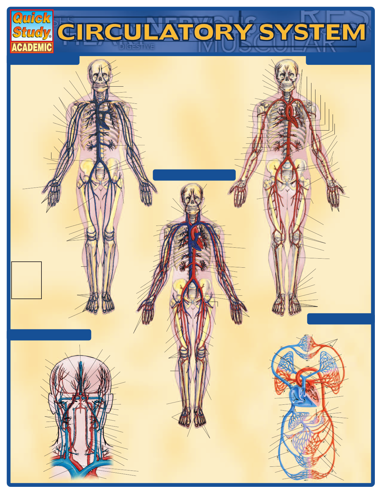BarCharts, Inc.® WORLD’S #1 ACADEMIC OUTLINE Capillaries of head Veins (Blood flows toward heart) R. pulmonary v.v. Superior vena cava L. pulmonary v.v. R. atrium R. ventricle Hepatic portal v. Capillaries of liver Inferior vena cava Portal circulation Renal v.v. Kidneys Internal iliac v. Femoral v. Capillaries of pelvis Capillaries of legs & feet Capillaries of arms & hands Arteries (Blood flows away from heart) Head, arm & hand a.a. Aortic arch L. pulmonary a. Pulmonary capillaries R. pulmonary a. Transverse sinus Superior sagittal sinus Inferior sagittal sinus Straight sinus Frontal v. Angular v. Transverse v. Maxillary v. Retromandibular v. Superior labial v. Facial v. Inferior labial v. Vertebral v. Mastoid emissary v. Internal jugular v. Deep cervical v. Middle thyroid v. R. subclavian v. Brachiocephalic v. Supratrochlear v. L. superficial temporal v. L. superior labial v. L. facial v. L. inferior labial v. L. internal jugular v. L. external jugular v. L. subclavian v. L. pulmonary a. Superior vena cava Pulmonary trunk Pulmonary valve R. atrium Tricuspid valve R. ventricle R. brachial v.v. R. cephalic v. R. basilic v. Hepatic v.v. Inferior vena cava Accessory saphenous v.R. proper palmar digital v.v. R. superficial femoral v. R. great saphenous v. R. genicular v.v. R. peroneal v. R. anterior tibial v. R. dorsal venous network of foot R. dorsal venous arch of foot R. dorsal digital v.v. L. profunda femoris L. renal v. R. median cubital v. R. radial v. R. common iliac v. L. internal iliac v. R. cephalic v. R. basilic v. R. inter- capitular v.v. L. lateral circumflex femoral v.v. R. ulnar v. L. external iliac v. R. superficial palmar venous arch Superficial temporal a. Angularis Facial a. Mental a. R. common carotid a. R. vertebral a. R. subclavian a. Aortic arch Ascending aorta L. pulmonary v.v. L. circumflex a. L. axillary a. L. atrium Aortic valve Mitral valve L. ventricle Descending thoracic aorta Deep brachial a. L. brachial a. Splenic a. Common hepatic a. Superior mesenteric a. Superior ulnar collateral a. R. renal a. Abdominal aorta R. testicular (ovarian) a. Inferior mesenteric a. L. radial a. R. common iliac a. Anterior interosseous a. L. external iliac a. L. internal iliac a. L. ulnar a. Deep palmar arch Superficial palmar arch Femoral a. L. lateral circumflex a. Muscular branches Deep femoral a. R. superficial femoral a. Radialis indicis a. Proper palmar digital a. Descending branch of lateral circumflex a. L. popliteal a. Genicular a.a. L. tibial recurrent a. L. anterior tibial a. Peroneal a. Lateral malleous a. Dorsalis pedis a. Lateral tarsal a. Arcuate a. Dorsal digital a. Arch of aorta Internal iliac a. Femoral a. Internal iliac a. Capillaries of colons Inferior mesenteric a. Superior mesenteric a. Renal a.a. Descending abdominal aorta Spleen Gastric aorta Stomach Hepatic a. Splenic a. Gastric a. Frontal a. Anterior cerebral a. Superficial parietal a. Circle of Willis Middle cerebral a. Posterior cerebral a. Superficial temporal a. Transverse facial a. Maxillary a. Basilar a. Angular a. Superior labial a. Inferior labial a. Facial a. Internal carotid a. External carotid a. Vertebral a. Common carotid a. Superior thyroid a. Thyrocervical trunk Brachiocephalic trunk L. subclavian a.Arch of aorta L. ventricle Celiac a. Pulmonary a. L. atrium Descending thoracic aorta Plantar a. anastomosis Anterior tibial a. Recurrent tibial a. Genicular a.a. L. lateral circumflex a. Popliteal a. Femoral a. Deep femoral v. Palmar a. anastomoses Internal iliac a. External iliac a. Ulnar a. Radial a. Testicular a. Renal a. Renal v. Abdominal aorta Celiac trunk Brachial a. Pulmonary a. Aortic arch Axillary a. Subclavian a. Common carotid a. Vertebral a. Facial a. & v. Superficial temporal a. & v.Internal jugular v. External jugular v. Subclavian v. Brachiocephalic a. Cephalic v. Brachial v. Superior vena cava Inferior vena cava Hepatic portal v. Superior mesenteric v. Superior mesenteric a. Basilic v. Median v. Cephalic v. Palmar venous network External iliac v. Internal iliac v. Femoral v. Great saphenous v. Genicular v.v. Anterior tibial v. Great saphenous v. Plantar venous network Dorsalis pedis a. a. = artery a.a. = arteries L. = left R. = right v. = vein v.v. = veins Pulmonary valve R. atrium Tricuspid valve R. ventricle L. atrium Mitral valve L. ventricle Brachiocephalic v. VENOUS SYSTEM CIRCULATORY SYSTEM ARTERIAL SYSTEM BLOOD CIRCUITS SCHEMA: HEAD & NECK External jugular v. Branch to sinoatrial node Anterior R. atrial branch of R. coronary a. Anterior cardiac v.v. R. coronary a. Small cardiac v. R. marginal branch of R. coronary a. Opening of coronary sinus Middle cardiac v. Posterior interventricular branch of R. coronary a. (posterior descending a.) L. coronary a. Aortic valve Circumflex branch of L. coronary a. Great cardiac v. Anterior interventricular branch (L. anterior descending) of L. coronary a. Posterior v. of L. ventricle Edge of the transparent heart ISBN-13: 978-142320719-1 ISBN-10: 142320719-X Use this comprehensive study guide in the classroom, in the gym, at home or anywhere you need complete anatomical information. This guide is not designed to take the place of classroom attendance. All rights reserved. No part of this publication may be reproduced or transmitted in any form, or by any means, electronic or mechanical, including photocopy, recording, or any information storage and retrieval system, without written permission from the publisher. ©2004 BarCharts Inc. 0108 NOTE TO STUDENT CREDITS Images ® Vincent Perez/perezstudio.com Layout: Rich Marino (Inferior view) Artery Tunica intima: Endothelium Sub- endothelial layer Internal elastic lamina Tunica media Tunica adventitia Terminal arteriole Meta-arteriole Precapillary sphincters Basal lamina** Tight junction Endothelial cell** Cell nucleus Capillary bed Blood flow Red blood cell Lumen Fenestrations Intercellular cleft Postcapillary venule Valve Tunica adventitia Tunica media Subendothelial layer Endotheliu