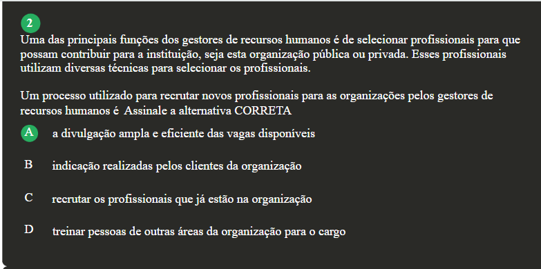 2 Uma das principais funções dos gestores de recursos humanos é de selecionar profissionais para que possam contribuir para a instituição, seja esta organização pública ou privada. Esses profissionais utilizam diversas técnicas para selecionar os profissionais. Um processo utilizado para recrutar novos profissionais para as organizações pelos gestores de recursos humanos é Assinale a alternativa CORRETA A a divulgação ampla e eficiente das vagas disponíveis B indicação realizadas pelos clientes da organização C recrutar os profissionais que já estão na organização D treinar pessoas de outras áreas da organização para cargo
