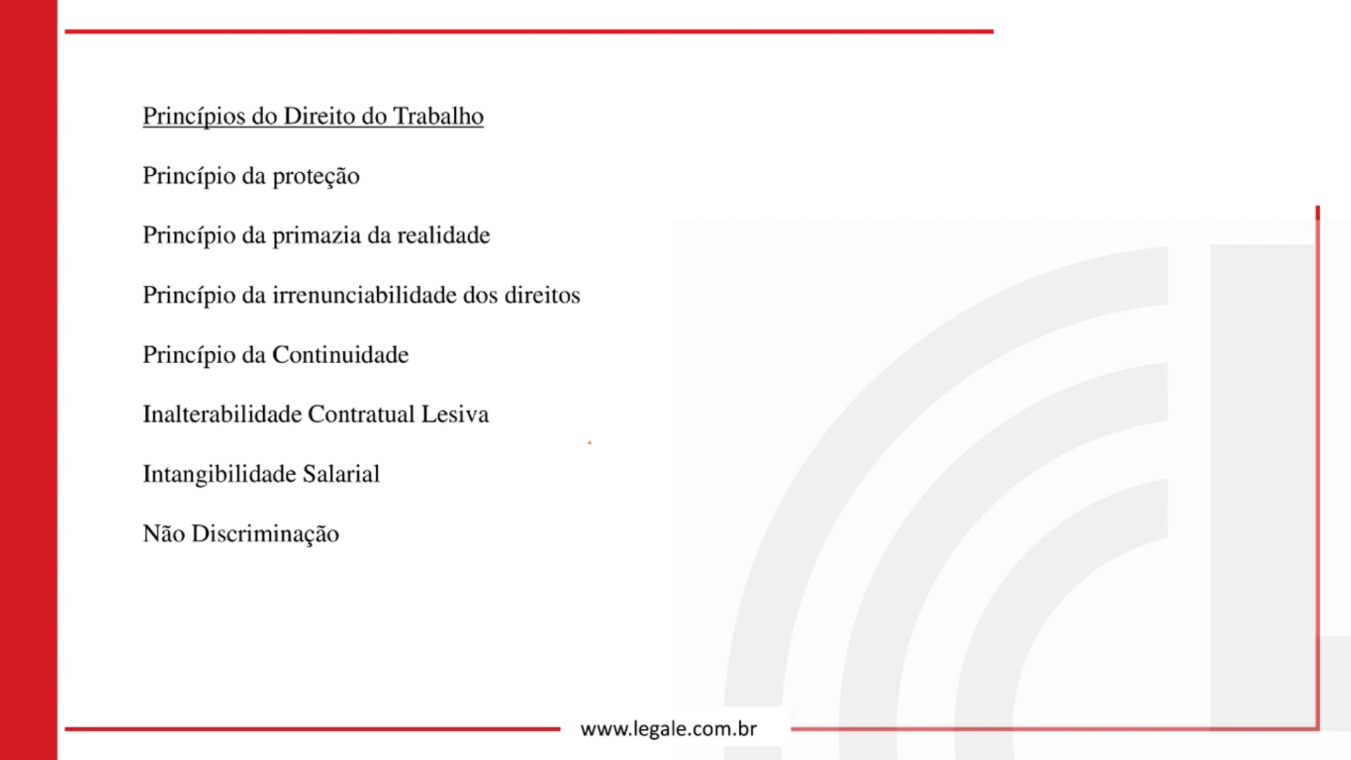Princípios do Direito do Trabalho Princípio da proteção Princípio da primazia da realidade Princípio da irrenunciabilidade dos direitos Princípio da Continuidade Inalterabilidade Contratual Lesiva Intangibilidade Salarial Não Discriminação www.legale.com.br