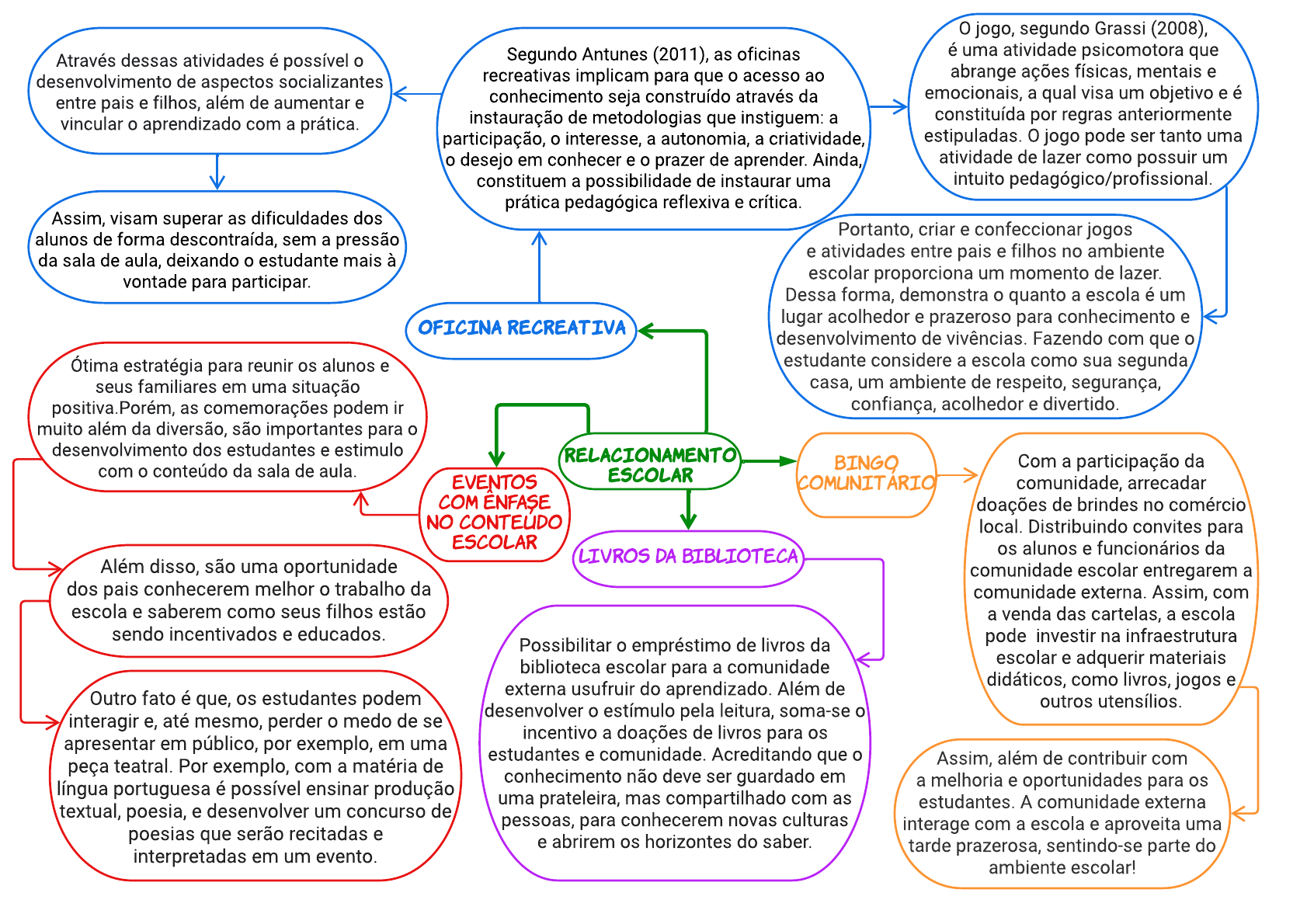RELACI ONAMENTO ESCOLAR Of i c i na Recr eat i va Bi ng o co mu ni t ár i o LI VROS DA BI BLI OTECA eVENTOS COM ÊNFASE NO CONTEÚDO esco l ar Através dessas atividades é possível o desenvolvimento de aspectos socializantes entre pais e filhos, além de aumentar e vincular o aprendizado com a prática. Segundo Antunes (2011), as oficinas recreativas implicam para que o acesso ao conhecimento seja construído através da instauração de metodologias que instiguem: a participação, o interesse, a autonomia, a criatividade, o desejo em conhecer e o prazer de aprender. Ainda, constituem a possibilidade de instaurar uma prática pedagógica reflexiva e crítica. Assim, visam superar as dificuldades dos alunos de forma descontraída, sem a pressão da sala de aula, deixando o estudante mais à vontade para participar. O jogo, segundo Grassi (2008), é uma atividade psicomotora que abrange ações físicas, mentais e emocionais, a qual visa um objetivo e é constituída por regras anteriormente estipuladas. O jogo pode ser tanto uma atividade de lazer como possuir um intuito pedagógico/profissional. Portanto, criar e confeccionar jogos e atividades entre pais e filhos no ambiente escolar proporciona um momento de lazer. Dessa forma, demonstra o quanto a escola é um lugar acolhedor e prazeroso para conhecimento e desenvolvimento de vivências. Fazendo com que o estudante considere a escola como sua segunda casa, um ambiente de respeito, segurança, confiança, acolhedor e divertido. Ótima estratégia para reunir os alunos e seus familiares em uma situação positiva.Porém, as comemorações podem ir muito além da diversão, são importantes para o desenvolvimento dos estudantes e estimulo com o conteúdo da sala de aula. Outro fato é que, os estudantes podem interagir e, até mesmo, perder o medo de se apresentar em público, por exemplo, em uma peça teatral. Por exemplo, com a matéria de língua portuguesa é possível ensinar produção textual, poesia, e desenvolver um concurso de poesias que serão recitadas e interpretadas em um evento. Além disso, são uma oportunidade dos pais conhecerem melhor o trabalho da escola e saberem como seus filhos estão sendo incentivados e educados. Com a participação da comunidade, arrecadar doações de brindes no comércio local. Distribuindo convites para os alunos e funcionários da comunidade escolar entregarem a comunidade externa. Assim, com a venda das cartelas, a escola pode investir na infraestrutura escolar e adquerir materiais didáticos, como livros, jogos e outros utensílios. Assim, além de contribuir com a melhoria e oportunidades para os estudantes. A comunidade externa interage com a escola e aproveita uma tarde prazerosa, sentindo-se parte do ambiente escolar! Possibilitar o empréstimo de livros da biblioteca escolar para a comunidade externa usufruir do aprendizado. Além de desenvolver o estímulo pela leitura, soma-se o incentivo a doações de livros para os estudantes e comunidade. Acreditando que o conhecimento não deve ser guardado em uma prateleira, mas compartilhado com as pessoas, para conhecerem novas culturas e abrirem os horizontes do saber. Curso: Letras - Português e Inglês Estudante: Mariane Coelho 1º Semestre - Trimestre 2 REFERÊNCIAS MARINS, Danielle Stéfane de; COSTA, Celia Regina Bernardes ? Recreação Escolar: o brinquedo a brincadeira e o jogo na educação da infância.Revista Científica Multidisciplinar Núcleo do Conhecimento, Ano 1. Vol. 10 pp. 05- 24. ISSN.2448-0959 ANTUNES, H. S. Ser aluna, ser professora: um olhar sobre os ciclos de vida pessoal e profissional. Santa Maria: Ed. Da UFMS, 2011. MODESTO, Monica Cristina; RUBIO, Juliana de Alcântara Silveira. A importância da Ludicidade na construção do conhecimento.Revista Eletrônica saberes da Educação, 2014. Disponível em: . Acesso em: 10 maio. 2022. PLATAFORMA, Eleva.GESTÃO ESCOLAR: EVENTOS ESCOLARES E SEUS BENEFÍCIOS PARA PAIS, ALUNOS E PROFESSORES. 26 jan. 2022. Disponível em: https:// blog.elevaplataforma.com.br/eventos-escolares-e-seus-beneficios-para-pais-alunos-e-professores/ . Acesso em: 10 maio 2022. MAPA Página 1 Página 2