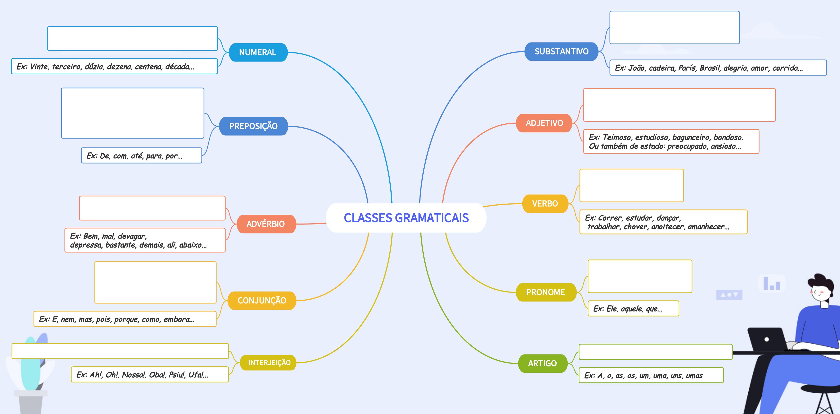 CLASSES�GRAMATICAIS SUBSTANTIVO ADJETIVO VERBO PRONOME ARTIGO NUMERAL PREPOSIÇÃO ADVÉRBIO CONJUNÇÃO INTERJEIÇÃO É a palavra que nomeia os seres em geral, ou seja, objetos, lugares, qualidades, ações, sentimentos. Ex: João, cadeira, París, Brasil, alegria, amor, corrida... É a reação espontânea de emoção de determinadas situações. Ex: Ah!, Oh!, Nossa!, Oba!, Psiu!, Ufa!... É o termo que liga duas orações ou duas palavras de mesmo valor gramatical e que estabelece uma relação entre elas. Ex: E, nem, mas, pois, porque, como, embora... É a palavra que altera o sentido de um verbo, um adjetivo ou outro advérbio Ex: Bem, mal, devagar, depressa, bastante, demais, ali, abaixo... É a palavra responsável por expressar ação, estado ou fenômeno da natureza. Ex: Correr, estudar, dançar, trabalhar, chover, anoitecer, amanhecer... É a palavra que indica um número ou posição que algo ou alguém ocupa numa série. Ex: Vinte, terceiro, dúzia, dezena, centena, década... É toda palavra invariável (ou seja, que não faz flexão de gênero, grau e número), que liga duas ou mais palavras que estabelecem entre elas relações de sentido e dependência. Ex: De, com, até, para, por... É a palavra que acompanha um substantivo. Ex: A, o, as, os, um, uma, uns, umas É a palavra que se usa para substituir algum termo da oração ou o acompanha Ex: Ele, aquele, que... É a palavra responsável por trazer uma característica de outro termo. O adjetivo sempre estará em função de outra palavra. Ex: Teimoso, estudioso, bagunceiro, bondoso. Ou também de estado: preocupado, ansioso...