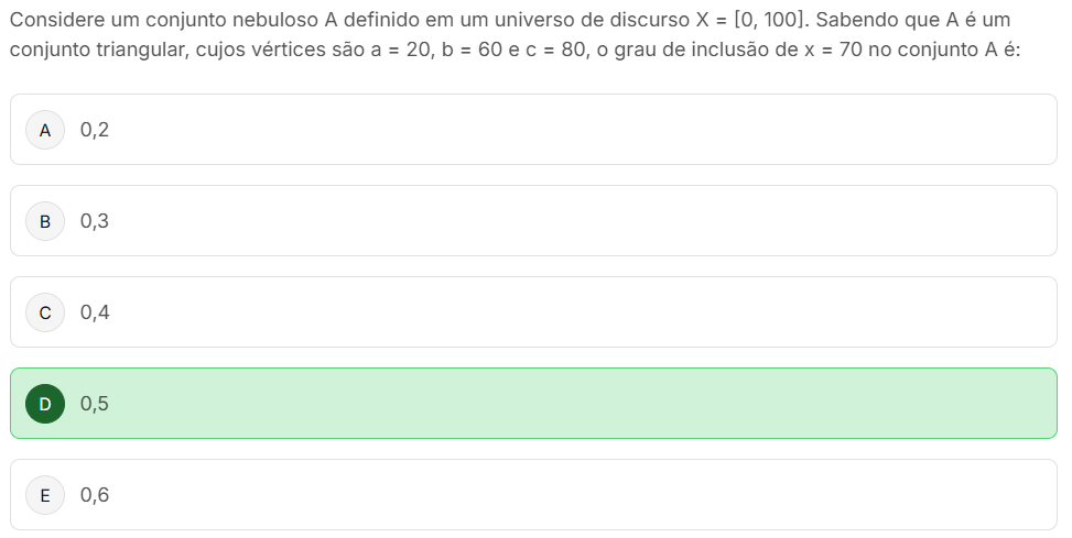 Considere um conjunto nebuloso A definido em um universo de discurso X = [0, 100]. Sabendo que A é um conjunto triangular, cujos vértices são a = 20, b = 60 e C = 80, o grau de inclusão de X = 70 no conjunto A é: A 0,2 B 0,3 C 0,4 D 0,5 E 0,6