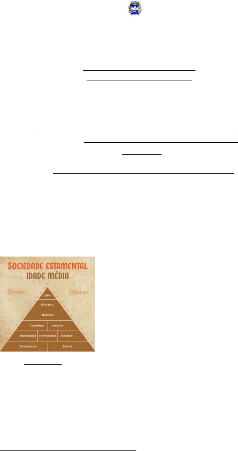 Prefeitura Municipal de Piúma Secretaria Municipal de Educação COLETÂNEA DE ATIVIDADES PEDAGÓGICAS PLANEJADAS PELOS DOCENTES DA REDE MUNICIPAL DE PIÚMA EMEF “LACERDA DE AGUIAR” 2ª CAP – 17 à 28 de Agosto 2020 EJA - 6ª Etapa / 7º ano Noturno 1º Bimestre/2º Semestre História Aluno: ______________________________________________________ Professor: Carlson Cruz_______________________________________ Componente Curricular: História________________________________ Objeto de conhecimento/conteúdo: Feudalismo___________________ F E U D A L I S M O A T I V I D A D E S D E F I X A Ç Ã O O feudalismo é um sistema político, social e econômico surgido na Idade Média após a decadência do Império Romano e das Invasões Bárbaras. A sociedade feudal era composta pelos senhores feudais, clero, nobreza, guerreiros e servos. Essa divisão era feita de acordo com o tamanho da sua autoridade. O que é Feudalismo? O feudalismo é um sistema político, econômico, cultural e social que surgiu na Idade Média, baseado no poder descentralizado. A economia era fundamentada na agricultura e utilizava o trabalho dos servos. O modo de produção dos bens necessários para a sobrevivência e a maneira de organizar a relação social entre os séculos V e X na Europa Ocidental ficou conhecida como feudalismo. O sistema feudal teve seu início após a decadência do Império Romano, pois essa crise teve como consequências a falta de escravos e uma grande crise militar. Além disso as Invasões Bárbaras, fizeram com que grandes senhores abandonassem a cidade e se mudassem para o campo. Saiba como foi a queda do Império Romano no artigo completo sobre a Roma Antiga. Os senhores mais poderosos criaram os centros rurais ou vilas romanas, o que originou os feudos medievais. Os cidadãos que habitavam no interior de Roma foram atingidos diretamente pela crise, pois as pessoas menos ricas tiveram que encontrar trabalho e proteção por meio dos grandes senhores e de um tratado de colonato. O tratado de colonato definia que os mais pobres poderiam usufruir das terras dos proprietários, porém seriam obrigados a dar uma quantidade da produção destas terras aos donos. Assim, foi substituído o sistema escravista e iniciado o sistema servil de produção, ou seja, o trabalhador rural era servo do grande proprietário. Os camponeses rurais necessitavam da proteção dos senhores donos de terras, pois ainda havia o medo de novas invasões bárbaras. Diferença entre vassalos e ssusseranos https://beduka.com/blog/materias/historia/resumo-sobre-a-roma-antiga/ Prefeitura Municipal de Piúma Secretaria Municipal de Educação COLETÂNEA DE ATIVIDADES PEDAGÓGICAS PLANEJADAS PELOS DOCENTES DA REDE MUNICIPAL DE PIÚMA EMEF “LACERDA DE AGUIAR” Os vassalos eram os trabalhadores rurais o e os suseranos eram os senhores proprietários. Os vassalos eram servos dos suseranos. No entanto, este não pode ser considerado um sistema escravista, uma vez que os servos não podiam ser vendidos. Eles não eram propriedade do senhor, eram livres. Os servos eram obrigados a dar aos vassalos os produtos obtidos até a sua morte, passando isso de geração, ou seja, essa relação de dependência e proteção passava dos pais para os filhos. Os senhores feudais possuíam uma autoridade maior do que a dos próprios reis. Eles tinham o poder político, econômico, cultural e social. É importante ressaltar que a Igreja Católica possuía um papel fundamental na Idade Média, pois ela era considerada uma enorme “senhora feudal”, por conta de sua autoridade e de seu poder de interferir em decisões sociopolíticas no intuito de expandir o cristianismo. Neste período, a Igreja era a instituição que mais mantinha escolas e abrigos para viúvas, órfãos e necessitados em geral. Muitos monges geravam trabalho por meio da agricultura e das cópias de livros, além da confecção de produtos artesanais para subsistência. ATIVIDADES: RESPONDA 01 – Defina Feudalismo e suas principais características? 02 - Como érea dividida a Sociedade Feudal? 03 – Como era a economia Feudal? 04 – Quando tem inicio o Sistema Feudal? 05 – Explique o que foi o Tratado de Colonato? 06 – descreva o que era o Sistema Servil de Produção? 07 – Explique a relação de Suserania e Vassalagem. 08 – Qual era o papel da Igreja Católica na Idade Media? Boa Sorte! https://beduka.com/blog/materias/historia/o-que-foi-a-idade-media/ https://beduka.com/blog/materias/historia/o-que-foi-a-idade-media/