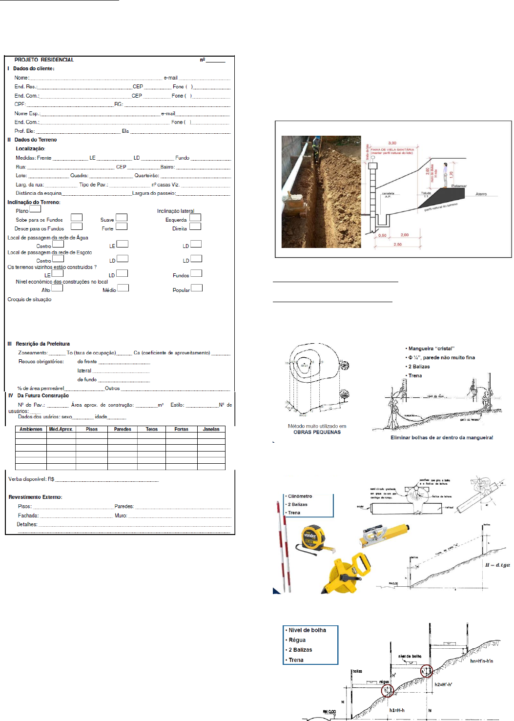 1 . ESTUDOS PREL IMINARES Reu n i ã o c om o c l i en t e : ev i t a r t erm i n o l o g i a t écn i c a ; o b t er ma i o r número de da dos ( pr ime i r o do c l i en t e e c ôn j u g e , depo i s do t er ren o ) a t r avés d e um b r i ef i n g , c omo exemp l o ab a i xo . Car ac t er í s t i c a s i d e a i s d o t er ren o p ar a um p ro j e t o e conôm i c o : a ) Não e x i s t i r g r andes mo v imen t açõ es de t er ra pa r a a c on s t ruç ão ; b ) T er d imensões t a i s qu e pe rm i t a pro j e t o e c ons t rução d e bo a r es i dênc i a ; c ) S er s eco ; d ) S er p l an o o u pouco i n c l i n a do p ar a a ru a ; e ) Se r re s i s t en t e p ar a s u por t a r bem a c ons t r ução ; f ) Te r f a c i l i d a de d e ac es so ; g ) Te rr eno s l o c a l i z a dos n as á r ea s ma i s a l t a s dos l o t e amentos ; h ) E sco l he r t er reno s em ár eas n ão su j e i t as a e ros ão ; i ) E v i t ar t err eno s que f o r am ate rr a dos s o bre mat er i a i s su j e i t o s a decompos i ç ão o r gân i c a . Q uando d a v i s i t a ao l o t e : a ) Deve - se i d en t i f i c ar no l o c a l o ve rd ade i r o l o t e ad qu i r i d o s eg undo a esc r i t u r a , c o l h endo -s e t od as as i n fo rmaçõ es nec ess ár i as ; b ) V er i f i c a r j u n t o a Pr ef e i t u r a da Mun i c i p a l i d a de , se o l o t e ament o onde s e s i t u a o t er ren o , f o i d e v i d amente apro vado e es t á l i b er ado p ar a c ons t ruç ão ; c ) V i z i n hanç a ( v er i f i c ar o s l im i t es d o t er reno ) ; d ) S i t u aç ão do l o t e den t ro d a q uadr a , med i n do - se a d i s t ânc i a d a es qu i n a o u c ons t rução ma i s p r óx ima . e ) Com bú sso l a d e mão , c onf i rmar a p os i ç ão d a l i n h a N -S . f ) V er i f i c ar s e e x i s t em benf e i t o r i a s . ( á gu a , e sgo t o , en er g i a ) g ) S en do o t er ren o c om i n c l i n aç ão ac en tu ad a , em dec l i v e , v e r i f i c a r s e e x i s t e v i e l a - s an i t ár i a v i z i n ha do l o t e , em uma d as d i v i s a s l a t er a i s o u fundo ; h ) V er i f i c a r s e p as sa pe r t o do l o t e , l i n h a de a l t a t ens ão , p os i ç ão d e pos t es , b ue i r o s , e t c . . . i ) V er i f i c a r s e ex i s t e f a i x a no n e d i f i c and i . j ) Ve r i f i c ar a l a rgu ra da rua e pa ss e i o ( pens ar na en t r eg a d e mat er i a i s ) . LEVANTAMENTO PLAN IMÉTR I CO : med i da s do l o t e u rb ano . L EVANTAMENTO ALT IMÉTR I CO : l e v an ta o perf i l d o t err eno . A ) Man gu e i r a d e n í v e l : c u i dad o c om a s bo l h a s n a mangu e i r a de n í ve l ( “ c r i s t a l ” ) , d ar b at i d i n has . B ) N í ve l d e Abney : mede a i n c l i n aç ão . Encon t ra pe l as r e l aç õe s t r i g onométr i c a s . C ) N í v e l d e bo l h a : 2 . TRABALHOS PREL IM INARES An tes d e i n i c i a r a o br a é impor tan te re g i s t r ar as c ond i ç õ e s da s c ons t ruçõe s v i z i n h as p ar a s e re sgu ar d ar , a l ém de te r bom r e l ac i o namento c om a v i z i n hança ; demo l i ç ões necess ár i a s , c an t e i r o de obr a s e a l o c ação d a obr a , a l ém de mov imen tos d e t er r a pa r a ob t er n í v e l d es e j ad o . E t apas qu e i n f l u enc i am no pro je t o de mo v imen to d e t e rr a : s ond agem do t er reno ; s equ ên c i a d a e xecuç ão d a c o ns t ruç ão ; n í v e i s d as c ons t ruçõ es v i z i n has ( e s t ab i l i d a de de t a l u d es ) ; l o c a l i z aç ão do c an t e i r o de obr as . S I STEMAS DE CONTRATAÇÃO : A ) A l u g ue l d e e qu i p amentos : p ag a - se po r h o r as u t i l i z a d a s ( g ran des obr as em ger a l u t i l i z am ) ; B ) Empre i t a d a g l o b a l : pag a -s e po r p aco te , é um s er v i ç o fech ad o , p rec i s a d e e s t udo p r e l im i n a r d eta l ha do ; C ) Empre i t a d a p or v i ag em : pag a -s e po r un i da de d e v i ag em/cam i n hão . Não é po r m³ . Mu i t o u t i l i z a do p ar a ob ra s bem pequ en as . EQU I PAMENTOS UT I L I ZADOS NA MOV IMENTAÇÃO DE TERRAS : Not a s sobr e a l g un s e qu i p amento s : P á c a rr eg ade i r a : i dea l p ar a mo v imen ta r e c arr ega r so l o . Pode se r u s a do no a te rro , v a i depo s i t an do so l o e e spa l h an do . E sc avade i r a : oper ado r o l h a p ar a f r en te , on de es t á a esc avade i r a h i d r áu l i c a o u a c abos d e aço ( pa r a g r andes c o r te s de t e rr as ) . R et ro esc avade i r a : equ i pamen to d e esc avaç ão es t á a t r á s , fer r ament a p ar a c o r t e . Na f r en te t em uma pá p ar a pequ enas mov imen taçõ es . Pé d e c ar ne i r o : r o l o c ompac t a dor qu e n ão é l i s o . B obc at : para pequ en as mo v imen t ações de t e rr a . C am i nh ão b asc u l a n t e : ex i s t em de d i fe ren t e s c ub i c ag ens . V an g a : par a c o r t e a prumo , i d ea l p ar a c ava r v a l as s an i t á r i as , muro de a rr imo . En x ada : par a pu x ar o so l o . P á d e b i c o : pa ra r emover/ad i c i o nar so l o . C ompac t ad or manu a l : f azer c amadas f i n a s , de 3 a 5 cm . T ambém é ch amado do t i po sapo . S o qu et e manu a l : pequ en a á rea , ma i o r t e ns ão . F aze r c amadas f i n a s t ambém . CORTE E ATERRO : A ) CORTE : sempre há a umento do vo l ume d o so l o quando remov i do d e seu es t a do nat u ra l . E s s e aumento d e v o l ume é denom i na do EMPOLAMENTO . ( Em ger a l de 30 a 35% do vo l . ) B ) AT ERRO : sempre h á c on t ra ç ão do vo l ume do so l o quand o c ompac t a do a p ar t i r d e s eu es t a do s o l t o . ( Em ger a l , 25 a 30% do vo l . ) I NSTALAÇÕES DE CANTE I RO (OBRA DE PEQUENO PORTE ) : A NR 18 es t abe l ec e as c o n d i ç õe s e o me i o amb i en t e d e t rab a l h o n a I n dús t r i a d a Cons t ruç ão . E l a es t ab e l e ce d i r e t r i z es d e o r dem adm i n i s t r a t i va 