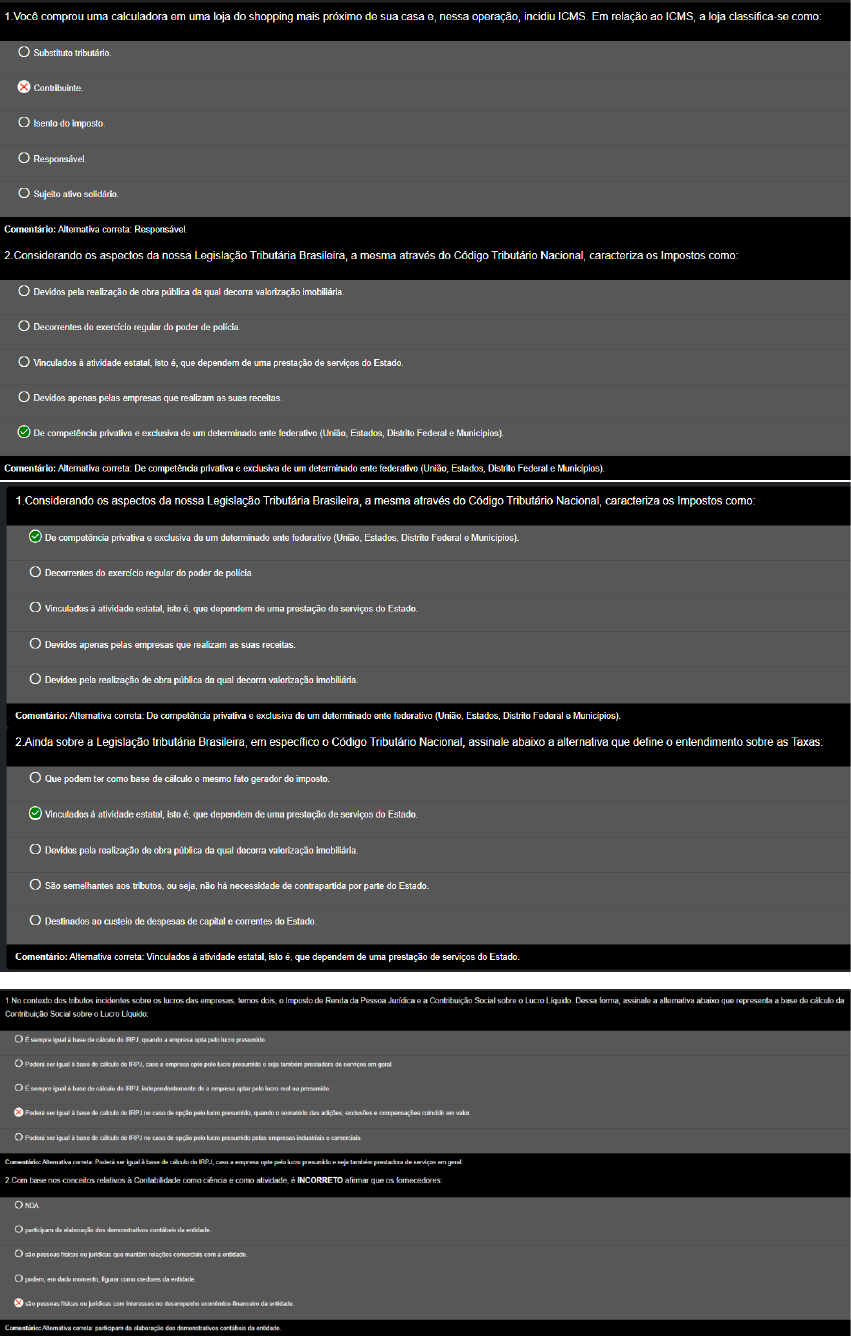 1 Você comprou uma calculadora em uma loja do shopping mais próximo de sua casa e, nessa operação, incidiu Em relação ao ICMS, a loja classifica-se Substituto Isento do imposto. Responsável Sujeito ativo solidário. Comentário: Alternativa correta: Responsável 2 Considerando os aspectos da nossa Legislação Tributária Brasileira, a mesma através do Código Tributário Nacional, caracteriza os Impostos como: Devidos pela realização de obra pública da qual decorra valorização Decorrentes do exercício regular do poder de Vinculados à atividade estatal, isto que dependem de uma prestação de serviços do Estado. Devidos apenas pelas empresas que realizam as suas De competência privativa e exclusiva de um determinado ente federativo (União, Estados, Distrito Federal e Municípios) Comentário: Alternativa correta: De competência privativa e exclusiva de um determinado ente federativo (União, Estados, Distrito Federal Municípios) 1 Considerando os aspectos da nossa Legislação Tributária Brasileira, a mesma através do Código Tributário Nacional, caracteriza os Impostos como: De competência privativa e exclusiva de um determinado ente federativo (União, Estados, Distrito Federal e Municípios). Decorrentes do exercício regular do poder de Vinculados à atividade isto que dependem de uma prestação de serviços do Estado. Devidos apenas pelas empresas que realizam as suas receitas Devidos pela realização de obra pública da qual decorra valorização Comentário: Alternativa correta: De competência privativa e exclusiva de um determinado ente federativo (União, Distrito Federal e Municípios) 2 Ainda sobre a Legislação tributária Brasileira, em específico Código Tributário Nacional, assinale abaixo a alternativa que define entendimento sobre as Taxas: Que podem ter como base de cálculo mesmo fato gerador do imposto. Vinculados à atividade estatal, isto que dependem de uma prestação de serviços do Estado. Devidos pela realização de obra pública da qual decorra valorização São semelhantes aos tributos, ou seja, não há necessidade de contrapartida por parte do Destinados ao custeio de despesas de capital e correntes do Estado. Comentário: Alternativa correta: Vinculados à atividade estatal, isto é, que dependem de uma prestação de serviços do 1 No contexto dos tributos incidentes sobre os lucros das empresas, temos dois, Imposto de Renda da Pessoa Jurídica Contribuição Social sobre Lucro Líquido. Dessa forma, assinale alternativa abaixo que representa base de cálculo da Contribuição Social sobre o Lucro O sempre igual à base de cálculo do quando empresa opta pelo lucro igual base de cálculo do IRPJ caso empresa pelo lucro presumido seja prestadora de serviços em geral O sempre igual base de cálculo do IRPJ independentemente de empresa optar pelo lucro real ou Poderá ser igual base de calculo do IRP. no caso de opção pelo lucro quando somatório das exclusões compensações coincidir em valor O ser igual base de cálculo do IRP. no caso de opção pelo lucro presumido pelas empresas industriais comerciais Comentário: Alternativa correta Poderá ser igual base de cálculo do IRPJ caso empresa opte pelo lucro presumido seja também prestadora de serviços em geral 2 Com base nos conceitos relativos à Contabilidade como ciência como INCORRE TO afirmar que os fornecedores NDA participam da elaboração dos demonstrativos da entidade O são pessoas fisicas ou jurídicas que mantêm relações comerciais com entidade O em dado momento, figurar como credores da entidade são pessoas fisicas ou jurídicas com interesses no desempenho financeiro da entidade Alternativa correta participam da elaboração dos demonstrativos da entidade1 Uma empresa recebeu, em 31 R$ de seu cliente por conta de uma encomenda de produtos, que serão entregues no prazo de 15 Em relação a este fato, é correto afirmar que valor de R$ 00 deve montante dos impostos incidentes sobre faturamento do mês de uma vez que ocorreu fato valor de R$ 2.000 00 deve base de cálculo dos impostos incidentes sobre faturamento do mês de pois ocorreu fato gerador. de R$ 2.000 deve base de cálculo dos impostos incidentes sobre faturamento do mês de caso ocorra fato gerador. valor de R$ 2.000 deve base de cálculo dos impostos incidentes sobre resultado do mês de somente se empresa obter lucro O valor de R$ 2.000 00 deve montante dos impostos incidentes sobre faturamento do mês de caso ocorra fato gerador Comentário: Alternativa correta valor de R$ deve compor base de cálculo dos impostos incidentes sobre faturamento do mês de pois ocorreu fato gerador Abase de cálculo da no regime de incidência não cumulativa, corresponde ao valor do faturamento mensal, entendido como total das receitas auferidas pela pessoa jurídica, considerando as exclusões e deduções da base de cálculo permitidas pela legislação pertinente, aplicando- se 3.65% 3.0% 11.33% 7.6% Ativar O Windows Alternativa correta 7.6% 1.0 planejamento tornou se de fundamental importância para as empresas, devido a? legislação tributária brasileira, adotar um número excessivo de leis de constantes Com relação ao Lucro Real indique as afirmações Lucro real é demonstrado no Livro Diário no Livro Caixa II Apessoa jurídica sujeita a tributação com base no lucro real poderá optar pelo regime anual de Nesse caso, empresa deverá antecipar imposto devido em 31 de dezembro pelo pagamento, em cada mês, por estimativa III. lucro real regime tributário em que a tributação calculada sobre lucro bruto do período de considerando valores a adicionar ou descontar conforme as compensações permitidas pela Assim, antes de afirmar qual foi a lucratividade real, preciso verificar lucro líquido de cada ano ou período, conforme legislação. O Apenas afirmação Apenas as afirmações estão corretas O Apenas afirmação III está O Todas as afirmações estão incorretas O Apenas afirmação es