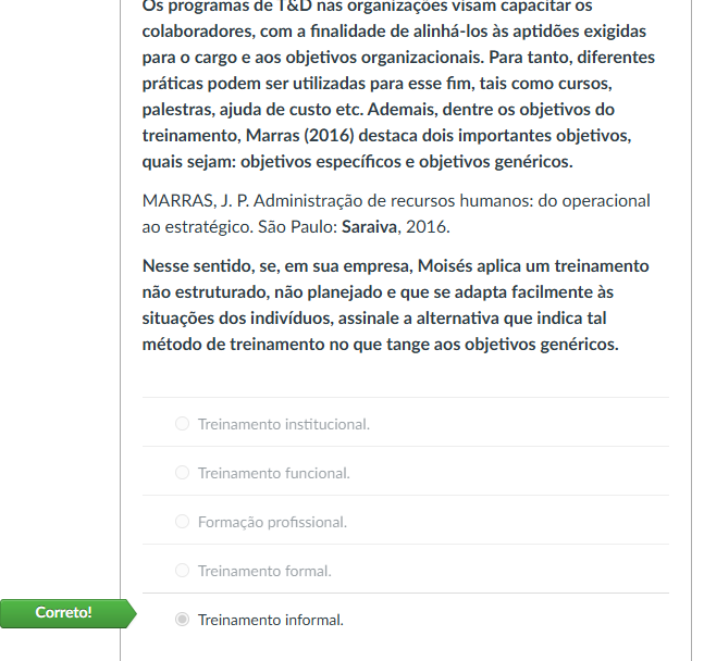 Os programas de T&D nas organizações visam capacitar os colaboradores, com a finalidade de alinhá-los às aptidões exigidas para cargo e aos objetivos organizacionais. Para tanto, diferentes práticas podem ser utilizadas para esse fim, tais como cursos, palestras, ajuda de custo etc. Ademais, dentre os objetivos do treinamento, Marras (2016) destaca dois importantes objetivos, quais sejam: objetivos específicos e objetivos genéricos. J. P. Administração de recursos humanos: do operacional ao estratégico. São Paulo: Saraiva, 2016. Nesse sentido, se, em sua empresa, Moisés aplica um treinamento não estruturado, não planejado e que se adapta facilmente às situações dos indivíduos, assinale a alternativa que indica tal método de treinamento no que tange aos objetivos genéricos. Treinamento Treinamento Formação profissional. Treinamento formal. Correto! Treinamento informal.