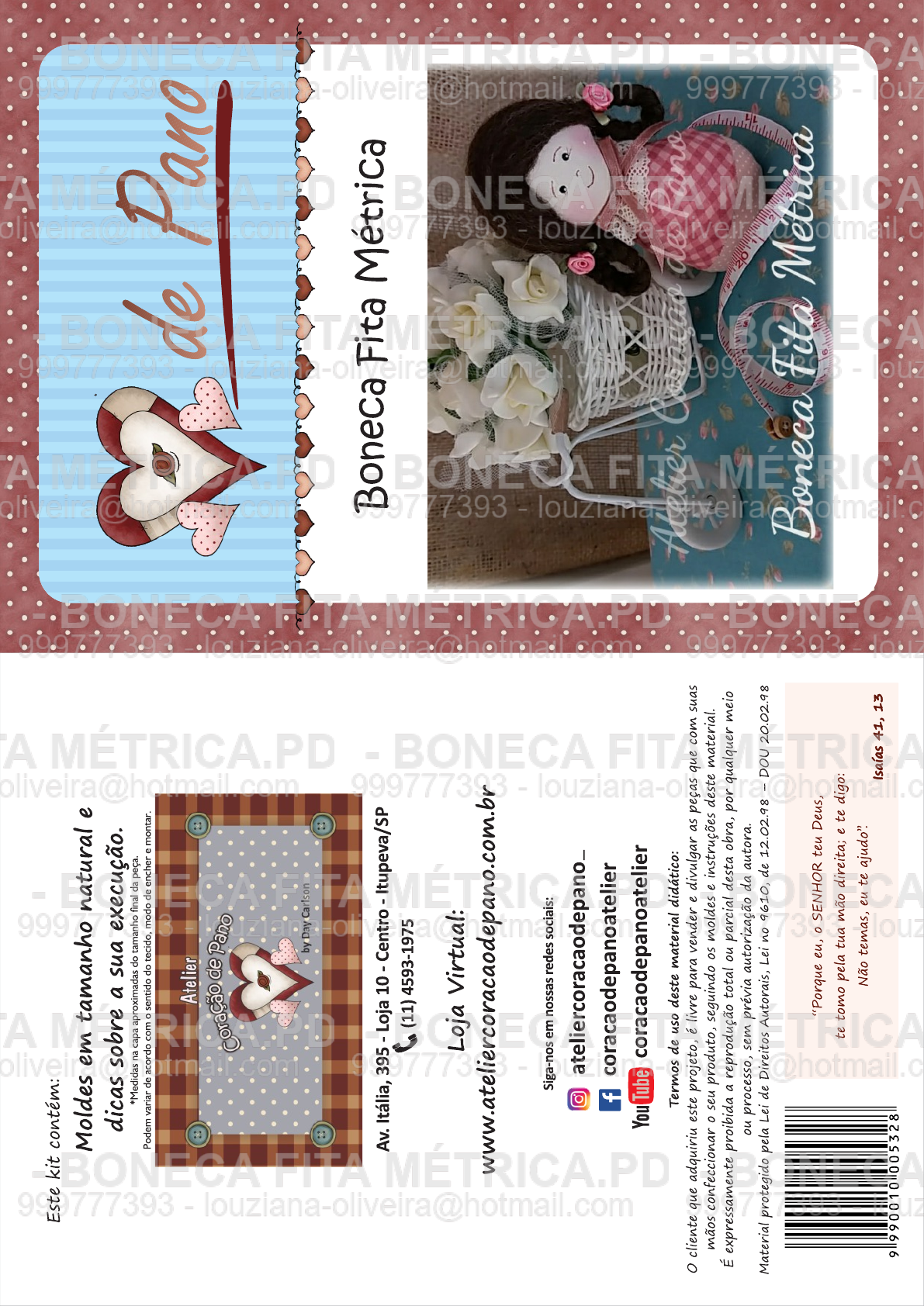 Este kit contém: Moldes em tamanho natural e dicas sobre a sua execução. *Medidas na capa aproximadas do tamanho final da peça. Podem variar de acordo com o sentido do tecido, modo de encher e Atelier de Pano by Day Carlson Av. Itália, 395 - Loja 10 - Centro - Itupeva/SP Boneca Fita Métrica (11) 4593-1975 Loja Virtual: www.ateliercoracaodepano.com.br Siga-nos em nossas redes sociais: ateliercoracaodepano. f coracaodepanoatelier coracaodepanoatelier Termos de uso deste material didático: cliente que adquiriu este projeto, é livre para vender e divulgar as peças que com suas mãos confeccionar seu produto, seguindo moldes e instruções deste material. É expressamente proibida a reprodução total ou parcial desta obra, por qualquer meio ou processo, sem prévia autorização da autora. Material protegido pela Lei de Direitos Autorais, Lei no 9610, de 12.02.98 - DOU 20.02.98 Boneca Fita Metrica "Porque eu, SENHOR teu Deus, te tomo pela tua mão direita; e te digo: Não temas, eu te ajudo". Isaías 41, 13 9990010005328- BONE Boneca FITA Fita Métrica - M PD BONECA 999777393 777393 Lista de Materiais: A ME BONECA FITA METRICA oliveir - Algodão cru de boneca 9777393 - -Tecidos variados de feltragem - B -Plumante FITA METRICA.PD - BONECA 9997 Caneta microm marrom 005 notmail.com -Tinta tecido preta e branca -Fita métrica retrátil A M -Blush e pincel de blush BONECA FITA METRICA oliveira Flor de cetim -Renda média de algodão -Fita de cetim fina Botão METRICA.PD BONECA 99971 999777393 - louz -Linha de pesponto A METRICA.PD Auxiliares: BONECA FITA METRICA costura, tesoura, enchedor de boneca, agulha de mão, agulha de feltragem, boleador Be caneta fantasma. - BONECA 999777393 - Primeiro A METRICA.PD BONECA FITA METRICA 9997 leia BONECA FITA - BONECA 999777393 - fim! comCA FITA Boneca Fita Métrica 2 9997 Medidas: 1x algodão pele 7 26cm 1x tecidos 1 7 26cm 1x tecido 2 7 26cm Tinta A METRICA.PD BONEC preta RICA Primeiro emende 3 tecidos, dobre ao meio 3 lo Caneta oliveira@ microm até ficar com 18 13cm, posicione molde da boneca alinhando a parte indicada na Blush junção do algodão pele com tecido 1. Costure no risco respeitando as aberturas. piques e Junção tecido desvire. ONECA Encha com plumante a cabeça, encaixe a fita - métrica retrátil dentro da boneca e passe a ponta para fora na abertura deixada, coloque na ponta da fita um botão ou algo que seja A mais largo que ela para a mesma não entrar FITA ME dentro da boneca. Continue a encher a olive boneca, alinhave fundo e feche como fuxico. Cole sobre fundo feltro para acabamento. fita Franza 15cm de renda média de algodão e coloque em volta do pescoço como gola. Decore com de fita. - BONE CA 999777393 - 999777393 louz Fundo A METR 1x feltro - BON Abertura 999777393 Feltrado meio do cabelo divisória Cabelo: CAFITA METRICA Trança CA Pegue um de la de feltragem de Feltrado 93 - louz aproximadamente 25cm que cubra a trança dobrada Feltre na divisória do cabelo no centro da cabeça, puxe excesso para as A laterais e uma trança de cada lado, dobre ECA F TA ME ICA a trança e feltre a ponta na cabeça sobre 3 louzia início da própria trança, decore com flor de Fita métrica cetim. Pinte rosto como indicado por último. Emenda tecido Use a criatividade e invente novos cabelos com 1 e 2 la de feltragem. FITA METRICA. NECA Fechado 999777393 Agora maos a e que Deus multiplique e abengoe OS trabalhos das suas maos!