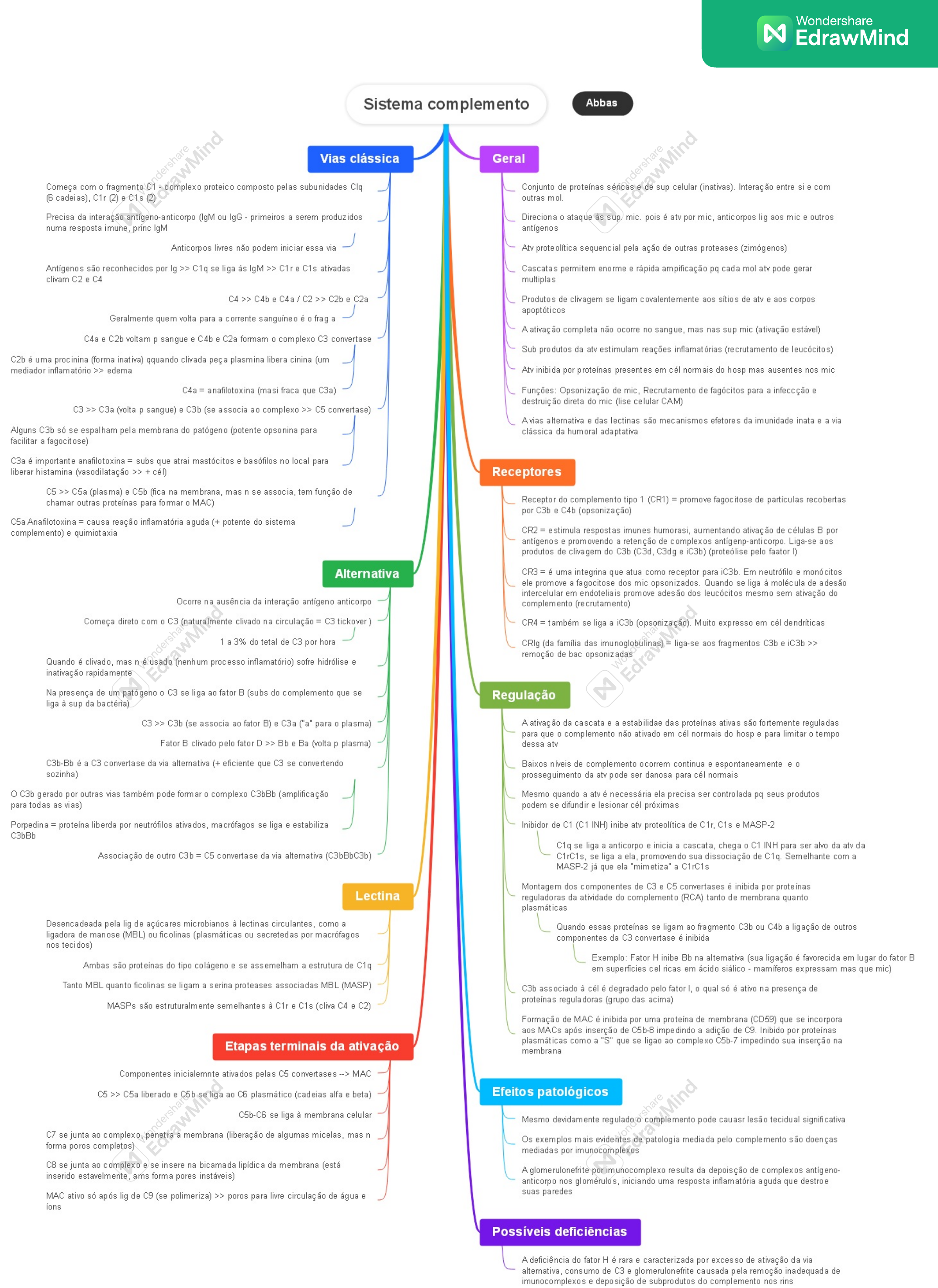 Wondershare EdrawMind Sistema complemento Abbas Vias clássica Geral Começa com fragmento C1 complex proteico composto pelas subunidades Conjunto de proteínas séricas sup celular Interação entre si e com (6 (2) e C1s (2) outras Precisa da (lgM ou primeiros a serem produzidos Direciona o ataque às mic. pois é atv por anticorpos lig aos e outros numa resposta imune, princ Anticorpos livres não podem iniciar essa via Atv proteolítica sequencial pela ação de outras proteases (zimógenos) são reconhecidos por lg >> C1q se liga às >> e C1s ativadas Cascatas permitem e rápida ampificação cada mol atv pode gerar clivam C2 C4 multiplas C4 >> C4b e C4a / C2 >> e C2a Produtos de clivagem se ligam covalentemente ans sítios de atv e aos corpos apoptóticos Geralmente quem volta para a corrente sanguíneo é a A completa não ocorre no mas nas sup (ativação estável) C4a e C2b voltam p sangue e C4b e C2a formam complexo C3 convertase Sub produtos da atv estimulam reações inflamatórias (recrutamento de leucócitos) C2h é uma procinina (forma inativa) qquando clivada peça plasmina cinina (um mediador inflamatório >> edema Atv inibida por proteínas presentes em cél normais do hosp mas ausentes nos mic C4a = anafilotoxina (masi fraca que C3a) Opsonização de Recrutamento de fagócitos para a e destruição direta do mic (lise celular CAM) C3 C3a (volta p sangue) e (se associa ao complexo >> C5 convertase) vias alternativa e das lectinas são mecanismos efetores da imunidade inata e a via Alguns C3b só se espalham pela membrana do (potente opsonina para clássica da humoral adaptativa facilitar fagocitose) C3a é importante anafilotoxina = subs que atra mastócitos e basófilos no local para liberar histamina (vasodilatação + cél) Receptores C5 >> C5a (plasma) e C5b (fica na membrana, mas n se associa, tem função de chamar outras proteínas para formar o MAC) Receptor do complemento tipo 1 (CR1) = promove fagocitose de partículas recobertas por C3b e C4b (opsonização) C5a Anafilotoxina = causa reação inflamatória aguda (+ potente do sistema complemento) e quimiotaxia CR2 estimula respostas imunes humorasi aumentando de células F por e promovendo a retenção de complexos Liga-se aos produtos de clivagem do C3b (C3d, C3dg e (proteólise pelo faator Alternativa CR3 = é uma integrina que atua como receptor para iC3b Em neutrófilo e monócitos ele promove a fagocitose dos opsonizados. Quando se liga à molécula de adesão intercelular em endoteliais promove adesão dos leucócitos mesmo sem ativação do Ocorre na ausência da interação anticorpo complemento (recrutamento) Começa direto com C3 (naturalmente clivado na circulação C3 CR4 = também se liga a iC3b Muito expresso em cél dendríticas 1 a 3% do tetal de C3 por hora CRlg (da família das liga-se aos fragmentos C3b e iC3b >> remoção de opsonizadas Quando é clivado, mas usado (nenhum processo inflamatório) sofre hidrólise e inativação rapidamente Na presença de 0 C3 se liga ao fator B (subs do complemento que se Regulação liga à sup da C3 >> (se associa ao fator B) e C3a ("a" para plasma) A da cascata e a estabilidae das proteínas ativas são fortemente reguladas para que complemento não ativado em cél normais do hosp e para limitar 0 tempo Fator B clivado pelo D Bb e Ba (volta plasma) dessa atv C3b-Bb é C3 convertase da via alternativa (+ eficiente que C3 se convertendo Raixos níveis de complemento ocorrem continua espontaneamente e sozinha) prosseguimento da pode ser danosa para cél normais C3b gerado por outras vias também pode formar complexo (amplificação Mesmo quando a é necessária ela precisa ser controlada seus produtos para todas as vias) podem se difundir e lesionar cél próximas Porpedina = proteína liberda por neutrófilos ativados macrófagos se liga e estabiliza Inibidor de C1 (C1 INH) inibe atv proteolítica de C1s e MASP-2 C3bBb se liga a anticorpo e inicia a cascata, chega C1 INH para ser alvo da atv da Associação de outro C3b C5 convertase da via alternativa C1rC1s, se liga a ela promovendo sua dissociação de C1q Semelhante com a MASP-2 já que ela "mimetiza" a C1rC1s Montagem dos componentes de C3 e C5 convertases é inibida por proteínas Lectina reguladoras da atividade do complemento (RCA) tanto de membrana quanto plasmáticas Desencadeada pela lig de açúcares microbianos à lectinas circulantes como a Quando essas proteínas se ligam ao fragmento C3b ou a ligação de outros ligadora de manose (MBL) ou ficolinas (plasmáticas ou secretedas por macrófagos componentes da C3 convertase é inihida nos tecidos) Fator inibe Rh na alternativa (sua ligação é favorecida em lugar do fator B Ambas são proteínas do tipo e se assemelham a estrutura de C1q em superfícies cel ricas em ácido siálico ex pressam mas que mic) Tanto MBL quanto ficolinas se ligam a serina proteases associadas (MASP) C3b associado à cél é degradado pelo fator 0 qual só é ativo na presença de proteínas reguladoras (grupo das acima) MASPs são estruturalmente semelhantes à C1 e C1s (cliva C4 e C2) Formação de MAC é inibida por uma proteína de membrana (CD59) que se incorpora aos MACs após inserção de C5b-8 impedindo a adição de Inibido por proteínas plasmáticas como a que se ligao ao complexo C5b-7 impedindo sua inserção na Etapas terminais da ativação membrana Componentes inicialemnte ativados pelas C5 convertases MAC C5 C5a liberado e C5b ao C6 plasmático (cadeias alfa e beta) Efeitos patológicos C5b-C6 se liga à membrana celular Mesmo devidamente regulado complemento pode lesão tecidual significativa se junta complexo, penetra a membrana (liberação de algumas micelas, mas Os exemplos mais evidentes de patologia mediada pelo complemento são doenças forma poros completos) mediadas por imunocomplexos C8 se junta ao complexo e/se insere na bicamada lipídica da membrana (está A glomerulonefrite resulta da depoisção de complexos inserido estavelmente, 