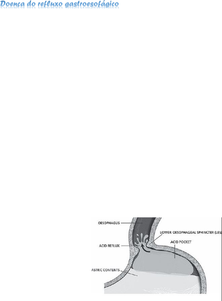 Definição É uma condição em que o conteúdo do estomago, incluindo o ácido gástrico, sobe de volta para o esôfago, causando sintomas e complicações. Isso se deve ao esfíncter esofágico inferior que não funciona corretamente ou está enfraquecido. O refluxo fisiológico, normal, ocorre geralmente de forma pós-prandial, com curta duração, raramente durante a noite e não causa sintomas como lesões ou complicações Como é feita a classificação da DRGE É classificada com base na aparência da mucosa esofágica na endoscopia • Esofagite erosiva: quando há ruptura da mucosa esofágica distal visível endoscopicamente com ou sem sintomas de DRGE • Doença do refluxo não erosiva: é caracterizada pela presença dos sintomas de DRGE mas sem lesão visível na mucosa esofágica Etiologia • Supressão ácida insuficiente (aumento da secreção de gastrina) Refluxo ácido residual: o ph gástrico fica em torno de 2 em jejum. Já durante as refeições e até 90 min após o ph permanece elevado pelo efeito de tamponamento dos alimentos, porém o esôfago distal e a cárdia ficam sem esse tamponamento e recebem suco gástrico concentrado e altamente ácido. Acid pocket: reservatório de ácido que não se mistura por diferença de densidade, então ele acaba subindo e fica na região do fundo, quando o esfíncter relaxa, o suco gástrico que é extremamente concentrado sobe e faz a lesão no esôfago distal • Infecção por H.pylori: o HP tem tendência a ficar mais no antro por uma facilidade de reprodução e por diferença de PH. Dessa forma, tem o potencial de aumentar ou diminuir a acidez gástrica dependendo do local da infecção A produção do ácido pode diminuir: se a infecção é mais intensa no corpo gástrico, evoluindo com gastrite atrófica ou por aumento da secreção gástrica alcalina, que é rica em bicarbonato que retorna ao normal após a erradicação do HP Pela produção de amônia pela própria bactéria. Após a erradicação o corpo mucoso pode se regenerar ao normal, aumentando a secreção ácida A gastrite de antro por HP demonstrou estar associada a hipergrastinemia e hipersecreção gástrica, por isso pode piorar os sintomas • Refluxo fracamente ácido ou alcalino: ocorrem principalmente no período pós-prandial, pois o relaxamento transitório do EEI ocorre com mais frequência após a distensão do fundo gástrico induzida pela refeição. O uso do IBP altera a acidez do refluxato, mas não diminui o volume do refluxo ou a alterações estruturais da JEG responsável pela DRGE • Refluxo duodenogástrico: juntamente com o ácido e a pepsina, o conteúdo duodenal pode ser prejudicial à mucosa esofágica • Hipersensibilidade ao refluxo: caracterizada por sintomas retroesternais, incluindo pirose e dor retroesternais associadas à exposição não patológica ao ácido • Fatores associados a medicação Tempo e adesão ao tratamento: o uso incorreto do IBP é uma causa importante de supressão ácido inadequada e DRGE refratária. Os IBPs devem ser administrados 30 a 60 minutos antes do café da manhã. Estimativas que apenas 46% dos pacientes usam a medicação conforme o recomendado. Metabolização do IBPs: esta classe é metabolizada principalmente pelo citocromo hepático CYP2C19, e a sua atividade é determinada por um polimorfismo genético. Ou seja, 5% dos pacientes brancos e >10% dos pacientes asiáticos são homozigotos para uma mutação e são considerados metabolizadores lentos. Enquanto que os homozigotos do tipo selvagem são considerados metabolizadores rápidos, e o efeito dos IBPs é diminuído e pode contribuir para a falha. Fisiopatologia O desenvolvimento do refluxo reflete um desequilíbrio entre fatores prejudiciais (refluxo, acidez ao refluxo, hipersensibilidade esofágica) e fatores defensivos (intergridade da mucosa, peristaltismo esofágico, deglutição do bicarbonato salivar) A esofagita é resultado da inflamação desencadeada por citocinas associadas a um efeito químico direto da exposição prolongada ao ácido, pepsina e bile no epitélio do esôfago O ph intragástrico e a quantidade de tempo de o refluxo está em contato com a mucosa são fatores que delimitam a extensão da lesã, sendo que o grau de dano da mucosa é mais significadtivo se o PH for menor que 2 e houver pepsina presente no refluxo Relaxamentos transitórios do EEI: é normal no mecanismo fisiológico da eructação, mas na DRGE há um aumento, ocorrendo independente da deglutição, não acompanhado do peristaltismo esofágico e por mais de 10 seg. EEI hipotenso: há vários fatores que podem reduzir a pressão da distensão gástrica, como tabagismo, obesidade, cafeína, chocolate, álcool e medicações (anticolinérgicos, nitratos, bloq de canais de cálcio, antidepressivos tricíclicos, opioides...) Alteração anatômica da JEG: pode acontecer pela hérnia de hiato que ocorre em 54% a 94% dos pacientes com esofagite de refluxo. Além do aumento da pressão intra-abdominal, como na obesidade, por exemplo Mecanismos de proteção: • Limpeza esofágica: o peristaltismo esofágico elimina o ácido nas posições vertical e supina, mas não é eficaz durante o sono • Secreções salivares: a saliva é essencial para a depuração do ácido esofágico através do seu PH mais básico, o estimulo para a salivação é a presença de ácido no esôfago proximal. O volume diário de saliva pode triplicar em resposta a acidificação esofágica persistente • Resistencia do tecido: através dos fatores pré/pós epiteliais e a camada de epitélio escamoso não queratinizado. O tamponamento e expulsão de ions de hidrogênio pela liberação de fosfato e bicarbonato. Além da defesa fornecida pelo próprio suprimento sanguíneo esofágico, mantendo o equilibiro ácido – base dos tecidos Manifestações clinicas: • Sintomas clássicos: pirose e regurgitação, mas a frequência desses não prediz o grau de dano • Disfagi