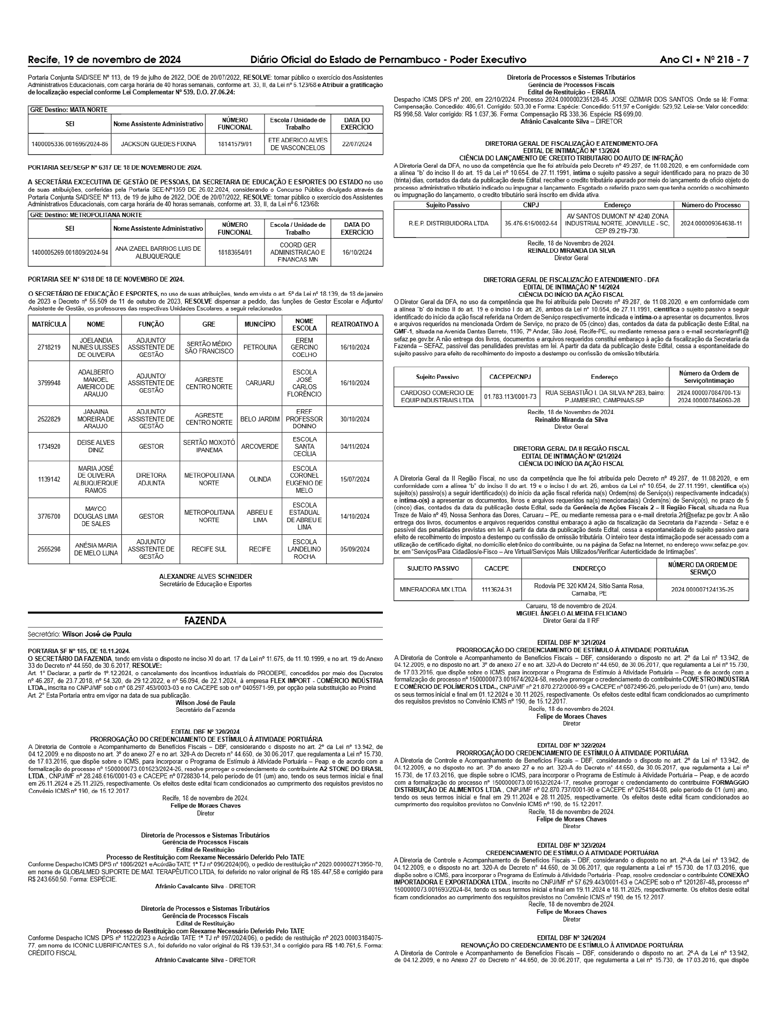Recife, 19 de novembro de 2024 Diário Oficial do Estado de Pernambuco Poder Executivo Ano CI 218 7 Portaria Conjunta SAD/SEE de 19 de julho de 2022, DOE de tornar público exercício dos Assistentes Diretoria de Processos e Sistemas Tributários Administrativos Educacionais, com carga horária de 40 horas semanais, conforme art. da Lei 6.123/68 e Atribuir a gratificação Gerência de Processos Fiscais de localização especial conforme Lei Complementar 539. D.O. 27.06.24: Edital de Restituição ERRATA Despacho ICMS DPS 200. em Processo 2024.000000235128-45. JOSE OZIMAR DOS Onde se Forma: GRE Destino: MATA NORTE Compensação. Corrigido: 503,30 Forma: Concedido: 511.97 e Corrigido: 529,92 Leia-se: Valor concedido: R$ Valor corrigido: R$ Forma: Compensação R$ 699.00 NÚMERO Escola Unidade de DATA DO SEI Nome Assistente Administrativo Afrânio Cavalcante Silva DIRETOR FUNCIONAL Trabalho EXERCÍCIO ETE ADERICO ALVES 1400005336.001696/2024-86 JACKSON GUEDES FIXINA 18141579/01 22/07/2024 DIRETORIA GERAL DE FISCALIZAÇÃO DE VASCONCELOS EDITAL DE INTIMAÇÃO 13/2024 CIÊNCIA DO LANÇAMENTO DE CREDITO TRIBUTARIO DO AUTO DE INFRAÇÃO PORTARIA SEE/SEGP 6317 DE 18 DE NOVEMBRO DE 2024. A Diretoria Geral da DFA no uso da competência que lhe foi atribuída pelo Decreto de e em conformidade com a alínea "b" do inciso do art. 19 da Lei 10.654, de intima sujeito passivo a seguir identificado para, no prazo de 30 A SECRETÁRIA EXCECUTIVA DE GESTÃO DE DA SECRETARIA DE EDUCAÇÃO E ESPORTES DO ESTADO no uso (trinta) dias, contados da data da publicação deste Edital, recolher credito tributário apurado por meio do lançamento de oficio objeto do de suas atribuições, conferidas pela Portaria SEE-N°1359 DE considerando Concurso Público divulgado através da processo administrativo tributário indicado ou impugnar Esgotado referido prazo sem que tenha ocorrido o recolhimento Portaria Conjunta SAD/SEE de 19 de julho de 2022, DOE de RESOLVE tornar público exercício dos Assistentes ou impugnação do lançamento, o credito tributário será inscrito em divida ativa. Administrativos Educacionais, com carga horária de 40 horas conforme 33. II. da Lei Sujeito Passivo CNPJ Endereço Número do Processo GRE Destino: METROPOLITANA NORTE AV SANTOS DUMONT 4240 ZONA NÚMERO Escola Unidade de DATA DO R.E.P. DISTRIBUIDORALTDA 35.476.615/0002-54 INDUSTRIAL JOINVILLE 2024.000009364638-11 SEI Nome Assistente Administrativo FUNCIONAL Trabalho EXERCÍCIO CEP COORD GER 18 de Novembro de 2024 ANA IZABEL BARRIOS LUIS DE 1400005269.001809/2024-94 18183654/01 ADMINISTRACAO E 16/10/2024 REINALDO MIRANDA DA SILVA ALBUQUERQUE MN Diretor Geral PORTARIA SEE 6318 DE 18 DE NOVEMBRO DE 2024. DIRETORIA GERAL DE FISCALIZAÇÃO E ATENDIMENTO DFA EDITAL DE INTIMAÇÃO 14/2024 o SECRETÁRIO DE EDUCAÇÃO E ESPORTES, no uso de suas tendo em vista 0 art. 5° da Lei de 18 de janeiro CIÊNCIA DO INÍCIO DA AÇÃO FISCAL de 2023 e Decreto 55.509 de 11 de outubro de 2023. RESOLVE dispensar a pedido, das funções de Gestor Escolar e Adjunto/ o Diretor Geral da no uso da competência que lhe foi atribuída pelo Decreto de e em conformidade com Assistente de Gestão, os professores das respectivas Unidades Escolares, a seguir a alínea "b" do inciso II do art. 19 e inciso do 26, ambos da Lei de cientifica sujeito passivo a seguir identificado do início da ação fiscal referida na Ordem de Serviço respectivamente indicada e intima-o a apresentar os documentos. livros MATRÍCULA NOME NOME FUNÇÃO GRE MUNICÍPIO REATROATIVO A e arquivos requeridos na mencionada Ordem de Serviço, no prazo de 05 (cinco) dias, contados da data da publicação deste na ESCOLA situada na Avenida Dantas Barreto, 1186. Andar, São ou mediante remessa para e-mail secretariagmf1@ JOELANDIA ADJUNTO/ SERTÃO MÉDIO A não entrega dos livros, documentos e arquivos requeridos constitui embaraço à ação da fiscalização da Secretaria da 2718219 NUNES ULISSES ASSISTENTE DE PETROLINA GERCINO 16/10/2024 Fazenda SEFAZ passível das penalidades previstas em A partir da data da publicação deste Edital, cessa a espontaneidade do SÃO FRANCISCO DE OLIVEIRA GESTÃO COELHO sujeito passivo para efeito de recolhimento do imposto a destempo ou confissão de omissão ADALBERTO ESCOLA ADJUNTO/ Número da Ordem de MANOEL AGRESTE Sujeito Passivo CACEPE/CNPJ Endereço 3799948 ASSISTENTE DE CARUARU 16/10/2024 Serviço/Intimação AMERICO DE CENTRO NORTE CARLOS GESTÃO ARAUJO FLORÊNCIO CARDOSO COMERCIO DE RUA SEBASTIÃO DA SILVA 283. bairro: 2024.000007084700-13/ 01.783.113/0001-73 EQUIPINDUSTRIAIS LTDA CAMPINAS-SP 2024.000007846060-28 JANAINA ADJUNTO/ EREF AGRESTE 18 de Novembro de 2024. 2522829 MOREIRA DE ASSISTENTE DE BELO JARDIM PROFESSOR 30/10/2024 CENTRO NORTE Reinaldo Miranda da Silva ARAUJO GESTÃO DONINO Diretor Geral DEISE ALVES SERTÃO MOXOTÓ ESCOLA 1734920 GESTOR ARCOVERDE SANTA 04/11/2024 DINIZ IPANEMA DIRETORIA GERAL DA II REGIÃO FISCAL EDITAL DE INTIMAÇÃO 021/2024 MARIA JOSÉ CIÊNCIA DO INÍCIO DA AÇÃO FISCAL ESCOLA DE OLIVEIRA DIRETORA METROPOLITANA CORONEL 1139142 OLINDA 15/07/2024 A Diretoria Geral da II Região no uso da competência que lhe foi atribuída pelo Decreto de e em ALBUQUERQUE ADJUNTA NORTE EUGENIO DE conformidade com a alínea "b" do inciso do art. 19 inciso do art 26, ambos da Lei de cientifica o(s) RAMOS MELO sujeito(s) passivo(s) a seguir identificado(s) do início da ação fiscal referida na(s) Ordem(ns) de Serviço(s) respectivamente indicada(s) e intima-o(s) a apresentar os documentos, livros e arquivos requeridos na(s) mencionada(s) Ordem(ns) de Serviço(s), no prazo de 5 ESCOLA MAYCO (cinco) contados da data da publicação deste sede da Gerência de Ações Fiscais 2 II Região situada na Rua METROPOLITANA ABREU E ESTADUAL 3776700 DOUGLAS LIMA GESTOR 14/10/2024 Treze de Maio 49. Nossa Senhora das Caruaru PE, ou mediante remessa para o e-mail A não NORTE LIMA DE ABREU DE SALES entrega dos documentos e arquivos requeridos constitu