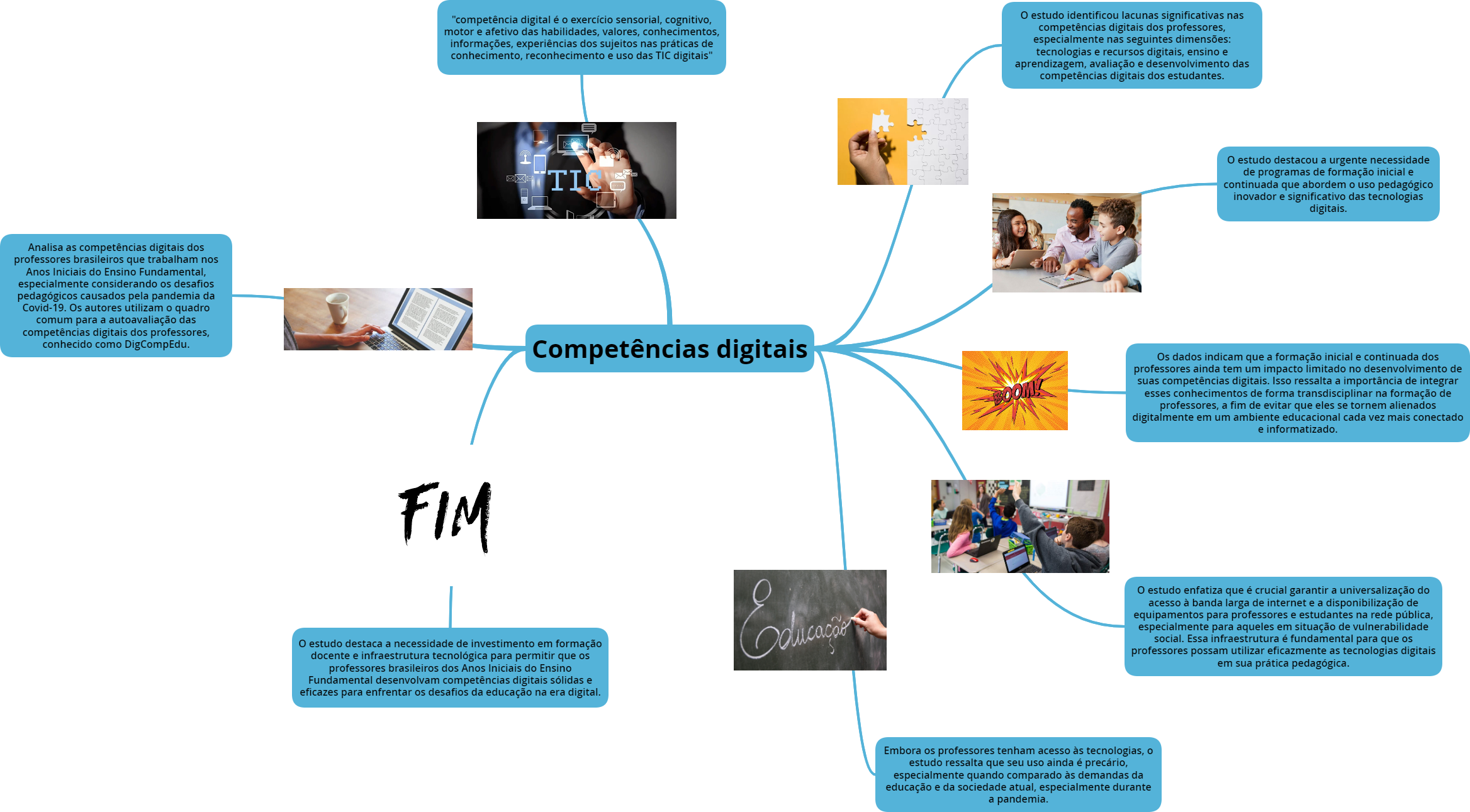 "competência digital é o exercício sensorial, cognitivo, o estudo identificou lacunas significativas nas motor e afetivo das habilidades, valores, conhecimentos, competências digitais dos professores, informações, experiências dos sujeitos nas práticas de especialmente nas seguintes dimensões: conhecimento, reconhecimento e uso das TIC digitais" tecnologias e recursos digitais, ensino e aprendizagem, avaliação e desenvolvimento das competências digitais dos estudantes. o estudo destacou a urgente necessidade de programas de formação inicial e TI continuada que abordem o uso pedagógico inovador e significativo das tecnologias digitais. Analisa as competências digitais dos professores brasileiros que trabalham nos Anos Iniciais do Ensino Fundamental, especialmente considerando os desafios pedagógicos causados pela pandemia da Covid-19. Os autores utilizam o quadro comum para a autoavaliação das competências digitais dos professores, conhecido como DigCompEdu. Competências digitais Os dados indicam que a formação inicial e continuada dos professores ainda tem um impacto limitado no desenvolvimento de suas competências digitais. Isso ressalta a importância de integrar esses conhecimentos de forma transdisciplinar na formação de professores, a fim de evitar que eles se tornem alienados digitalmente em um ambiente educacional cada vez mais conectado e informatizado. FIM o estudo enfatiza que é crucial garantir a universalização do acesso à banda larga de internet e a disponibilização de equipamentos para professores e estudantes na rede pública, especialmente para aqueles em situação de vulnerabilidade social. Essa infraestrutura é fundamental para que os o estudo destaca a necessidade de investimento em formação professores possam utilizar eficazmente as tecnologias digitais docente e infraestrutura tecnológica para permitir que os em sua prática pedagógica. professores brasileiros dos Anos Iniciais do Ensino Fundamental desenvolvam competências digitais sólidas e eficazes para enfrentar os desafios da educação na era digital. Embora os professores tenham acesso às tecnologias, o estudo ressalta que seu uso ainda é precário, especialmente quando comparado às demandas da educação e da sociedade atual, especialmente durante a pandemia.