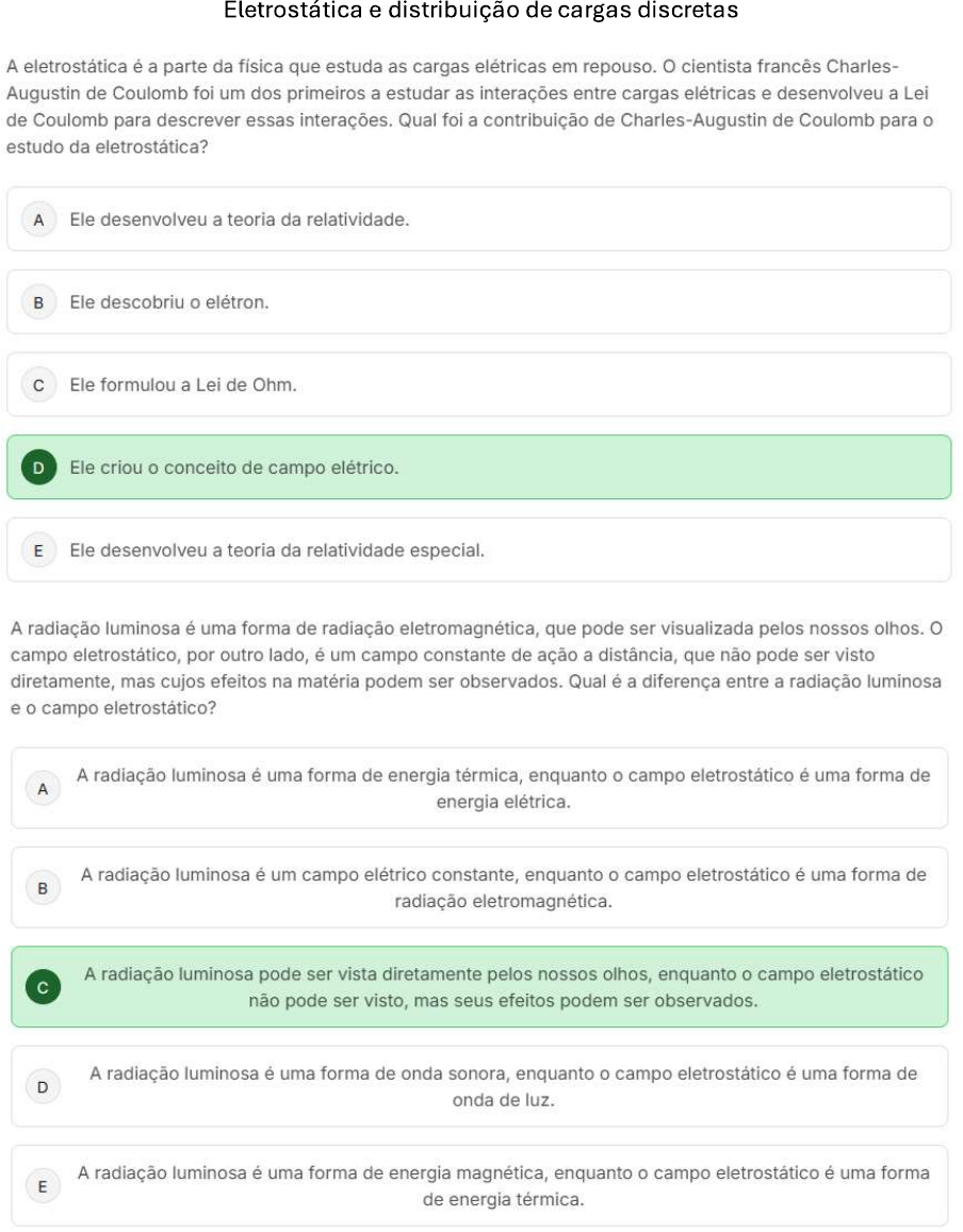 Eletrostática e distribuição de cargas discretas A eletrostática é a parte da física que estuda as cargas elétricas em repouso. cientista francês Charles- Augustin de Coulomb foi um dos primeiros a estudar as interações entre cargas elétricas e desenvolveu a Lei de Coulomb para descrever essas interações. Qual foi a contribuição de Charles-Augustin de Coulomb para o estudo da eletrostática? A Ele desenvolveu a teoria da relatividade. B Ele descobriu o elétron. C Ele formulou a Lei de Ohm. D Ele criou o conceito de campo elétrico. E Ele desenvolveu a teoria da relatividade especial. A radiação luminosa é uma forma de radiação eletromagnética, que pode ser visualizada pelos nossos olhos. campo eletrostático, por outro lado, é um campo constante de ação a distância, que não pode ser visto diretamente, mas cujos efeitos na matéria podem ser observados. Qual é a diferença entre a radiação luminosa e o campo eletrostático? A radiação luminosa é uma forma de energia térmica, enquanto o campo eletrostático é uma forma de A energia elétrica. A radiação luminosa é um campo elétrico constante, enquanto o campo eletrostático é uma forma de B radiação eletromagnética. A radiação luminosa pode ser vista diretamente pelos nossos olhos, enquanto campo eletrostático C não pode ser visto, mas seus efeitos podem ser observados. A radiação luminosa é uma forma de onda sonora, enquanto o campo eletrostático é uma forma de D onda de luz. A radiação luminosa é uma forma de energia magnética, enquanto campo eletrostático é uma forma E de energia térmica.o núcleo do átomo de hélio, chamado de alfa, possui carga elétrica ou seja, duas vezes a carga fundamental eletrônica, e massa m = kg. Calcule a relação entre a intensidade da força de repulsão elétrica (Coulomb), entre duas particulas alfa, e a intensidade de sua de atração gravitacional de Newton, dada por onde é a constante de atração gravitacional de Newton. Calcule Fe o resultado é: A 6,67 X B 6,64 X 10-27 C D 3,1 X 1035 E 2,39 X Cargas elétricas são definidas como acúmulos ou déficits de cargas eletrônicas fundamentais. De acordo com a teoria eletrodinâmica, qual é o motivo pelo qual a atribuição convencional de sinais às cargas elétricas não faz diferença? A Porque as cargas positivas são maiores do que as cargas negativas. B Porque as cargas negativas são mais móveis do que as cargas positivas. C Porque as cargas positivas e negativas têm a mesma D Porque a corrente elétrica flui apenas no sentido das cargas Porque o que importa é identificar os dois atributos fenomenologicamente diferentes das cargas E elétricas. Resposta incorreta Opa! A alternativa correta é a letra E. Confira o gabarito comentado!Um elétron de carga C desloca-se 50 cm, de a para b, em um acelerador de ao longo de um trecho linear do acelerador, na presença de um campo elétrico uniforme de módulo N/C. o módulo da força que age sobre essa particula é: A B N/C C D F|=50 cm E Resposta incorreta Opa! A alternativa correta é a letra A. Confira o gabarito comentado! o campo elétrico é uma grandeza física que descreve a interação entre cargas elétricas e está presente em diversos fenômenos eletrostáticos. Qual a relação entre campo elétrico e interação entre cargas elétricas? A o campo elétrico não tem relação com a interação entre cargas elétricas. B campo elétrico é gerado pela interação entre cargas elétricas. C A interação entre cargas elétricas é gerada pela movimentação do campo elétrico. D o campo elétrico e a interação entre cargas elétricas são fenômenos independentes. E campo elétrico é uma carga elétrica que interage com outras cargas elétricas. Resposta incorreta A alternativa correta é a letra B. Confira o gabarito comentado!A radiação luminosa é uma forma de radiação eletromagnética, que pode ser visualizada pelos nossos olhos. campo eletrostático, por outro lado, é um campo constante de ação a distância, que não pode ser visto diretamente, mas cujos efeitos na matéria podem ser observados. Qual é a diferença entre a radiação luminosa e o campo eletrostático? A radiação luminosa é uma forma de energia térmica, enquanto o campo eletrostático é uma forma de A energia elétrica. A radiação luminosa é um campo elétrico constante, enquanto campo eletrostático é uma forma de B radiação eletromagnética. A radiação luminosa pode ser vista diretamente pelos nossos olhos, enquanto campo eletrostático C não pode ser visto, mas seus efeitos podem ser observados. A radiação luminosa é uma forma de onda sonora, enquanto o campo eletrostático é uma forma de D onda de luz. A radiação luminosa é uma forma de energia magnética, enquanto o campo eletrostático é uma forma E de energia térmica. Duas cargas elétricas positivas, de mesmo valor de carga q, com massas iguais a m=15,0g, estão suspensas verticalmente por fios de comprimentos L=1,2m. As duas cargas se repelem eletrostaticamente formando um ângulo de cada uma, com o eixo vertical y. Considere o módulo da aceleração da gravidade = 9,81m/s2 e a constante de Coulomb k =9 109 Para que sistema físico permaneça em equilibrio mecânico e eletrostático, qual deve ser o valor de cada carga elétrica? Sugestão: isole uma das cargas e compute seu o resultado é: A C B C C D Eo campo elétrico é uma grandeza vetorial que possui direção, sentido e intensidade. A direção e o sentido do campo elétrico são determinados pela carga que o cria, enquanto a intensidade é determinada pela magnitude da carga. Como a intensidade do campo elétrico varia com a distância entre as cargas elétricas? A A intensidade do campo elétrico é independente da distância entre as cargas elétricas. B A intensidade do campo elétrico aumenta com a distância entre as cargas elétricas. C A intensidade do campo elétrico diminui com a distância entre as